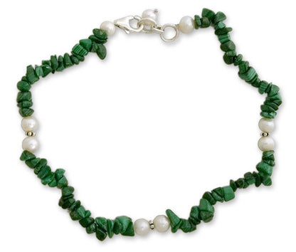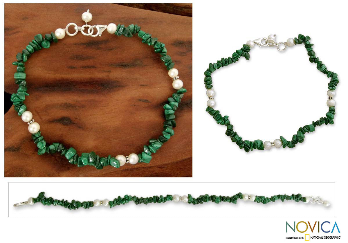 Cream pearls create a beautiful contrast in an anklet that is crafted by hand in India. Narayani highlights the unique beauty of natural malachite in the design of this anklet. Featuring banded shades of green, malachite has long been worn for protection.