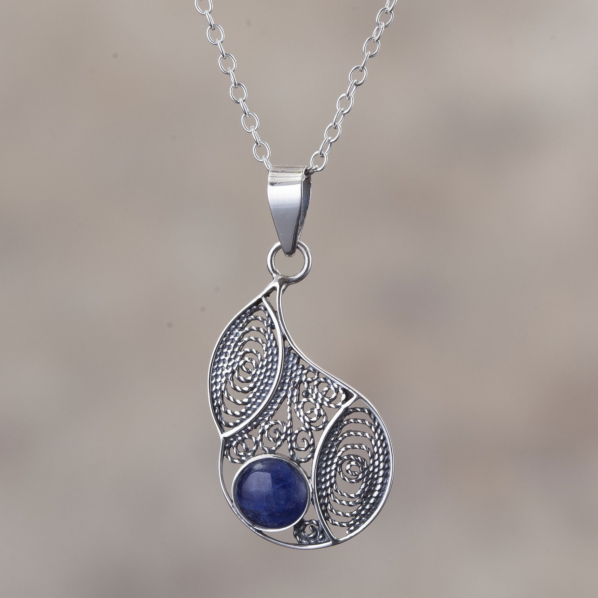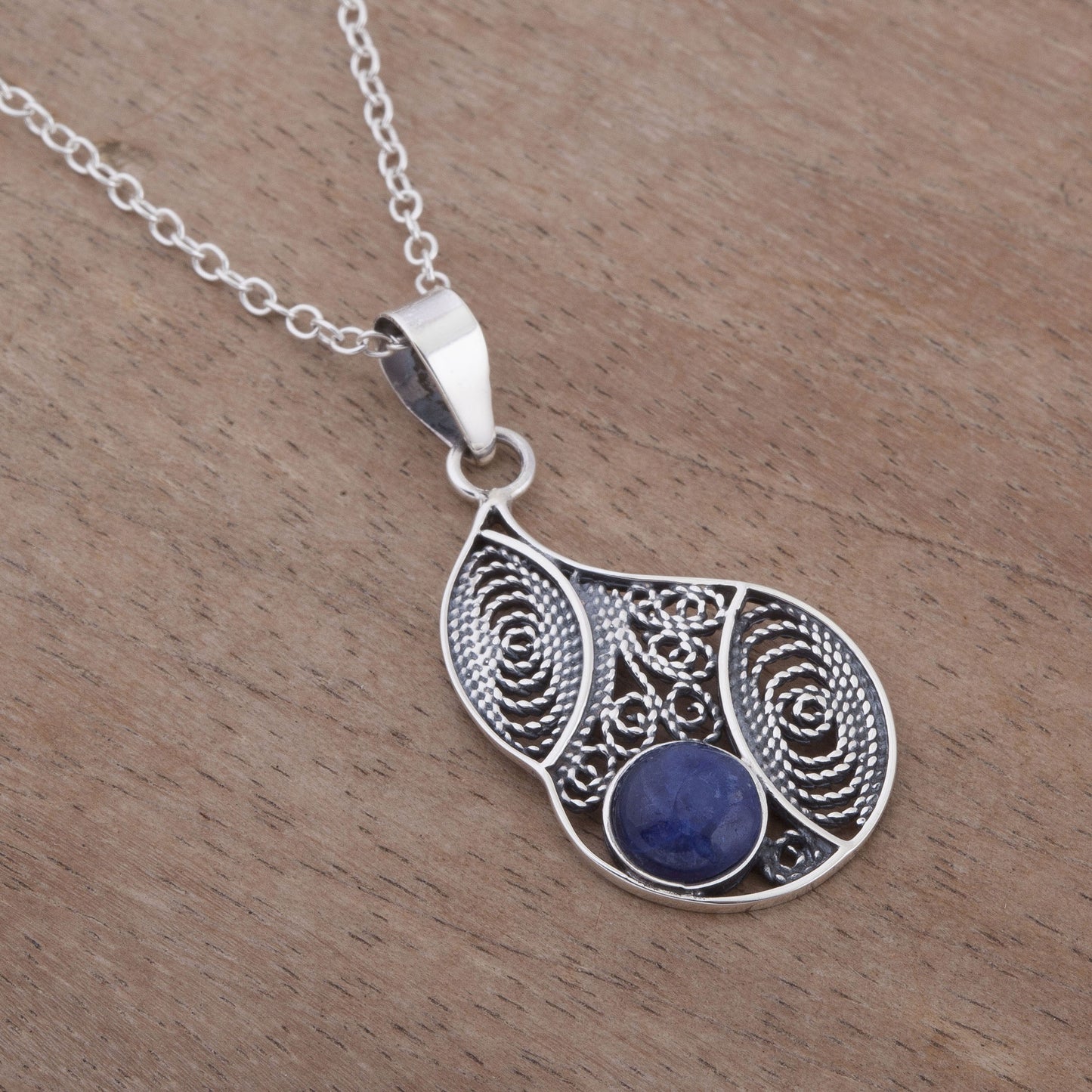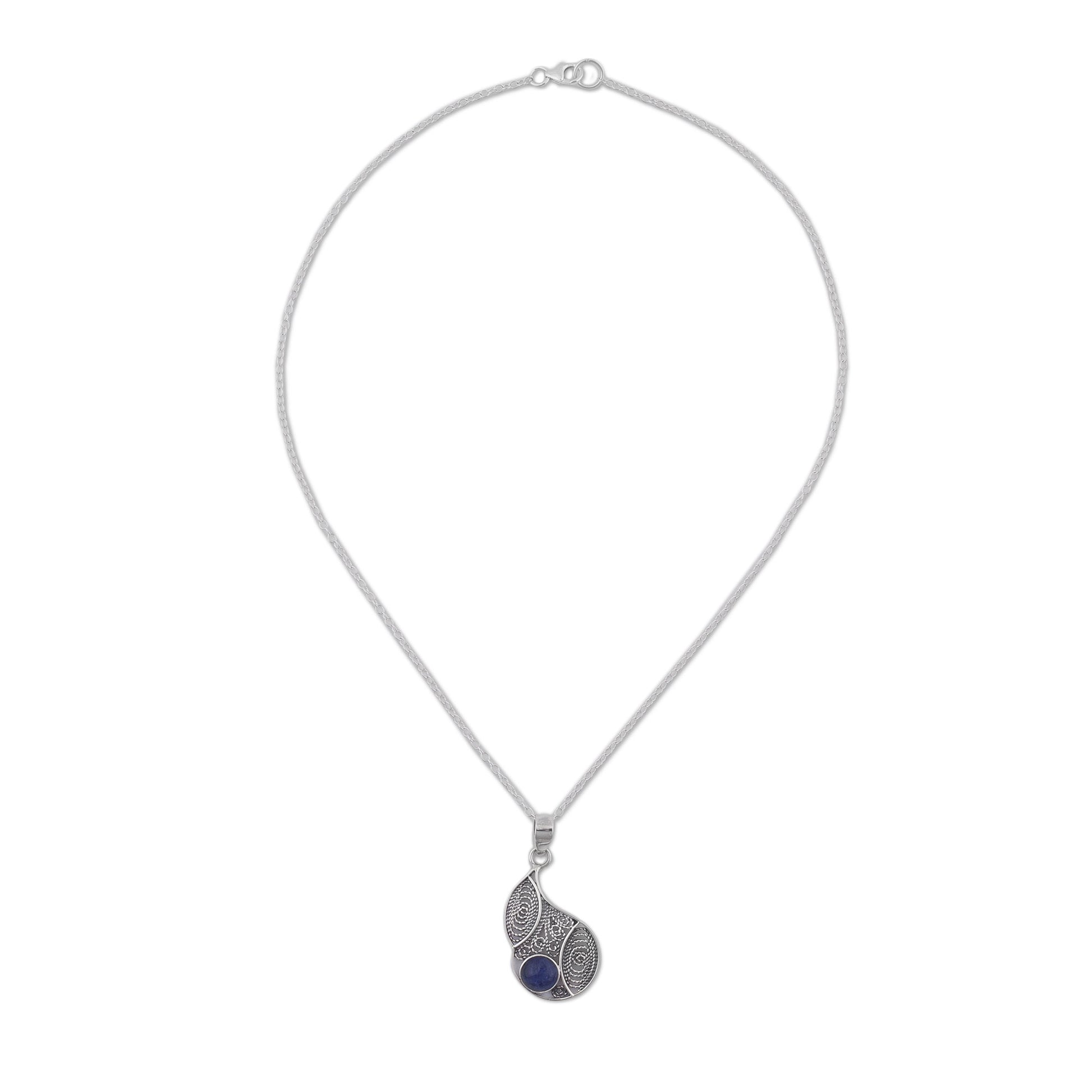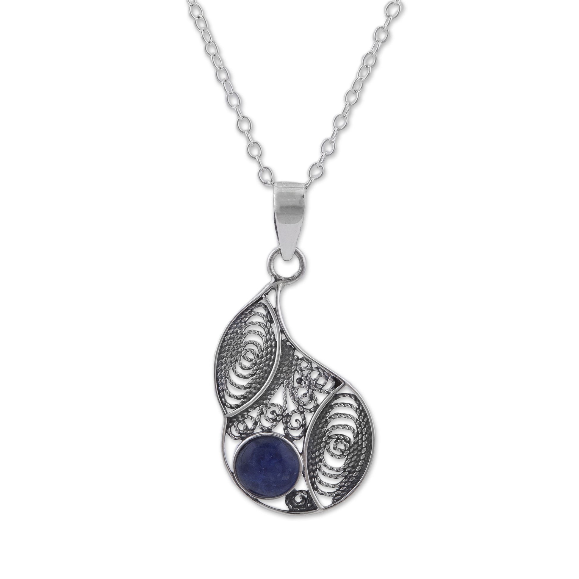 Celebrating the mystic beauty of the Andes, Peru's Jose Luis Pariona designs a fascinating necklace. He handcrafts a pendant of sterling silver with intricate filigree work that forms a drop shape, centering a length of sterling cable chain. Accented with a natural stone of blue sodalite, this necklace makes for an eye-catching accessory.