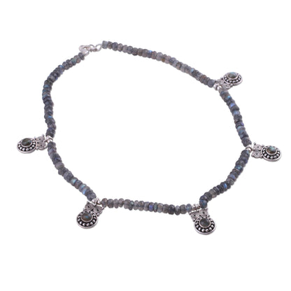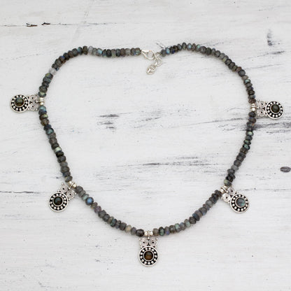 Poised like mystical owls, the pendants on this necklace cast a spell of enchanted elegance. From India's Neeru Goel, the necklace is crafted of sterling silver and some 120 carats of mesmerizing labradorite.