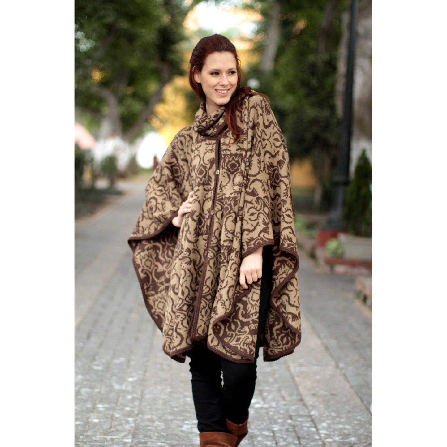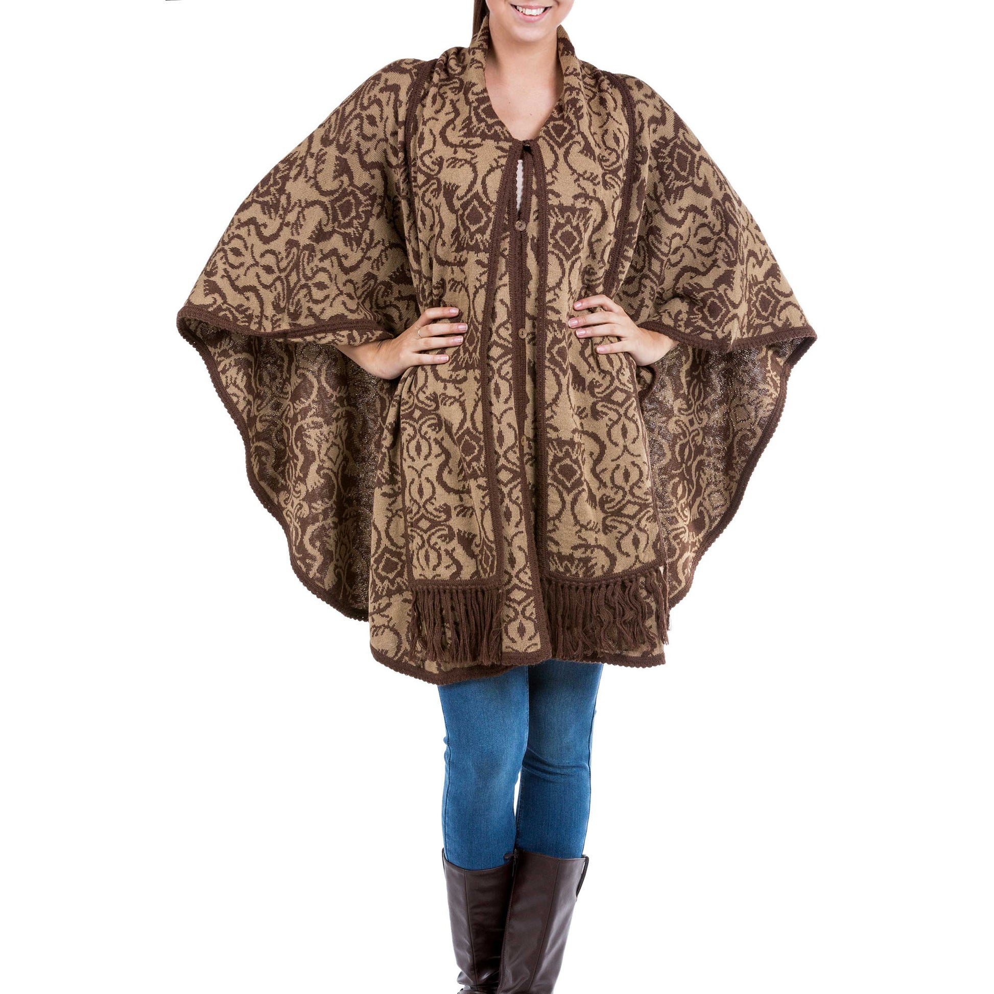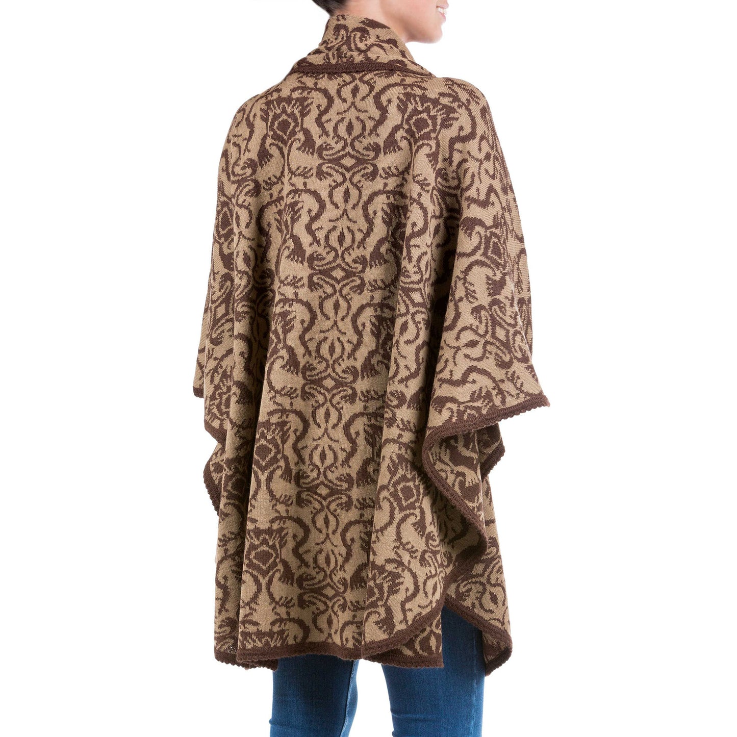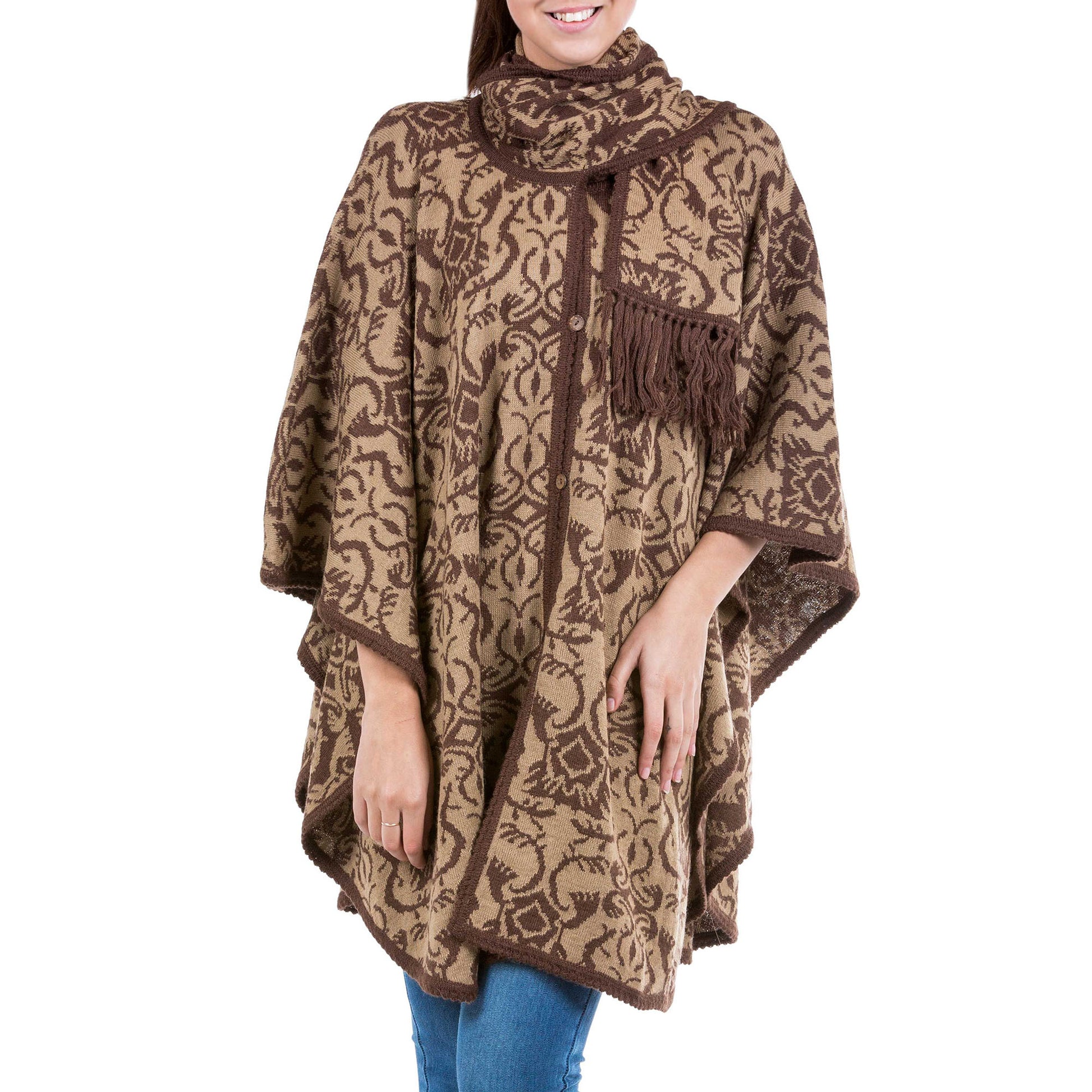 Alfredo Falcon creates a reversible design for a ruana cloak in rich brown adorned with abstract florid arabesques. The cloak is knitted with a rich alpaca blend and closes with coconut shell buttons. A warm scarf ensures soft, stylish warmth.