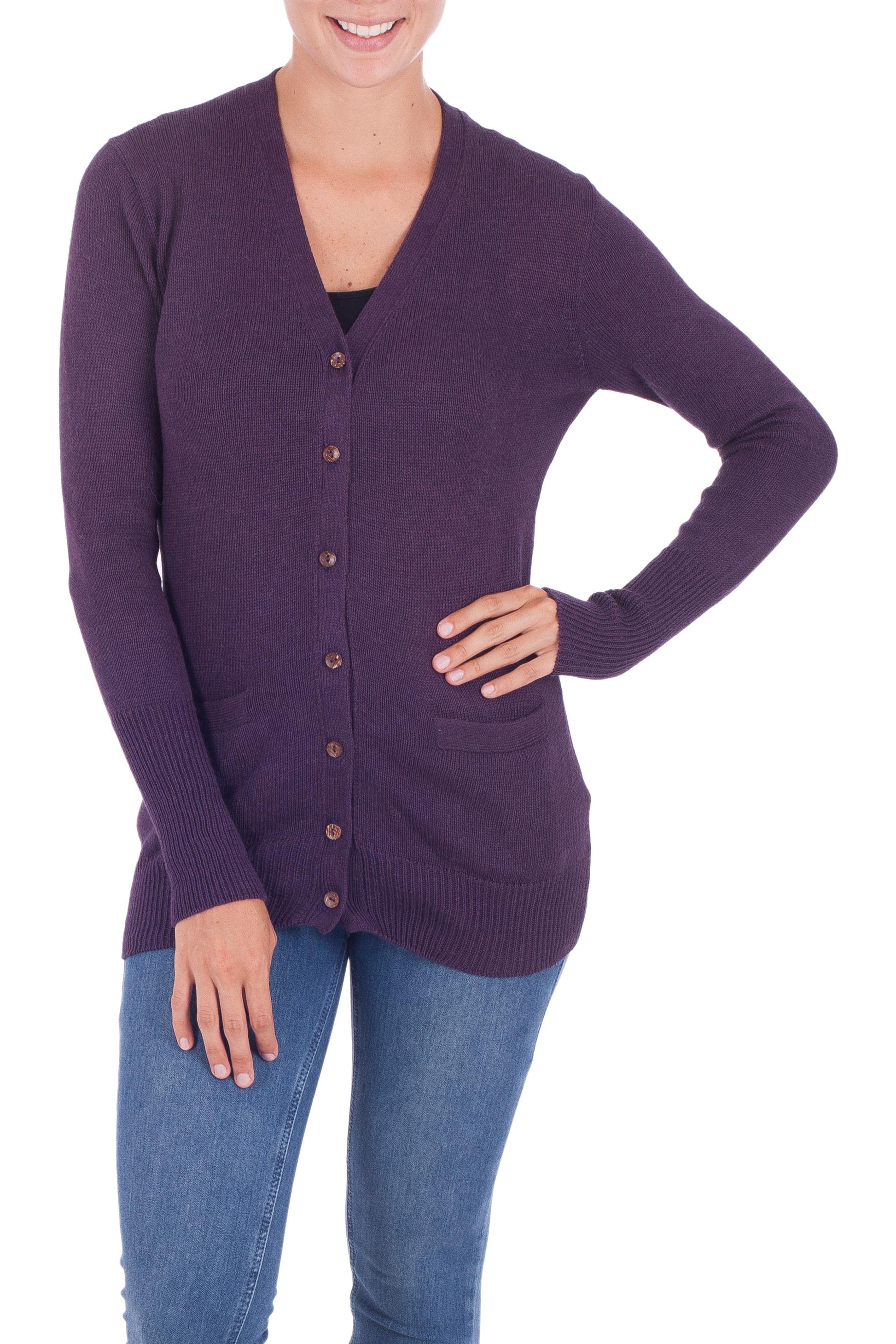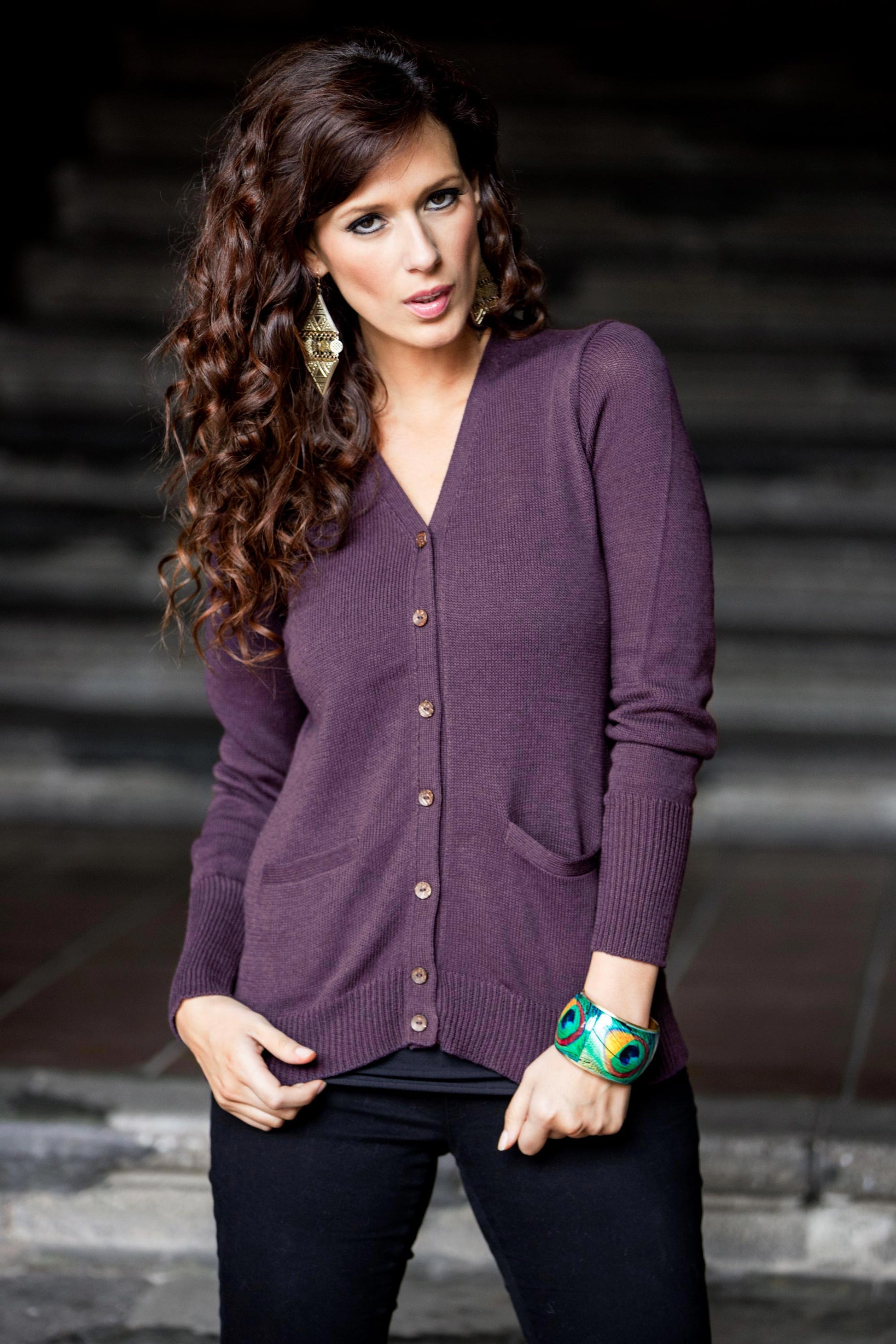 In rich purple, this cotton and alpaca blend cardigan dresses with feminine elegance. Alfredo Falcon's design includes two front pockets and coconut shell buttons running down the v-neck.