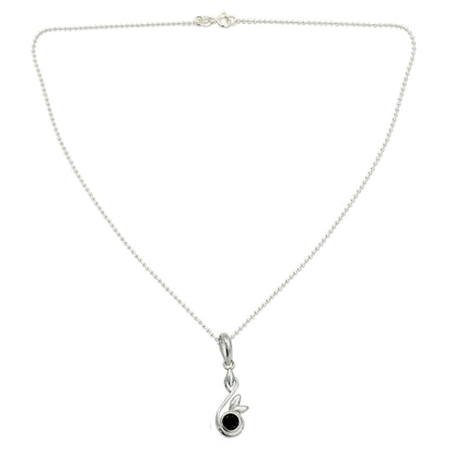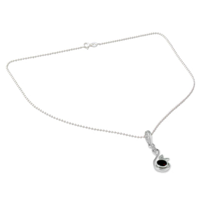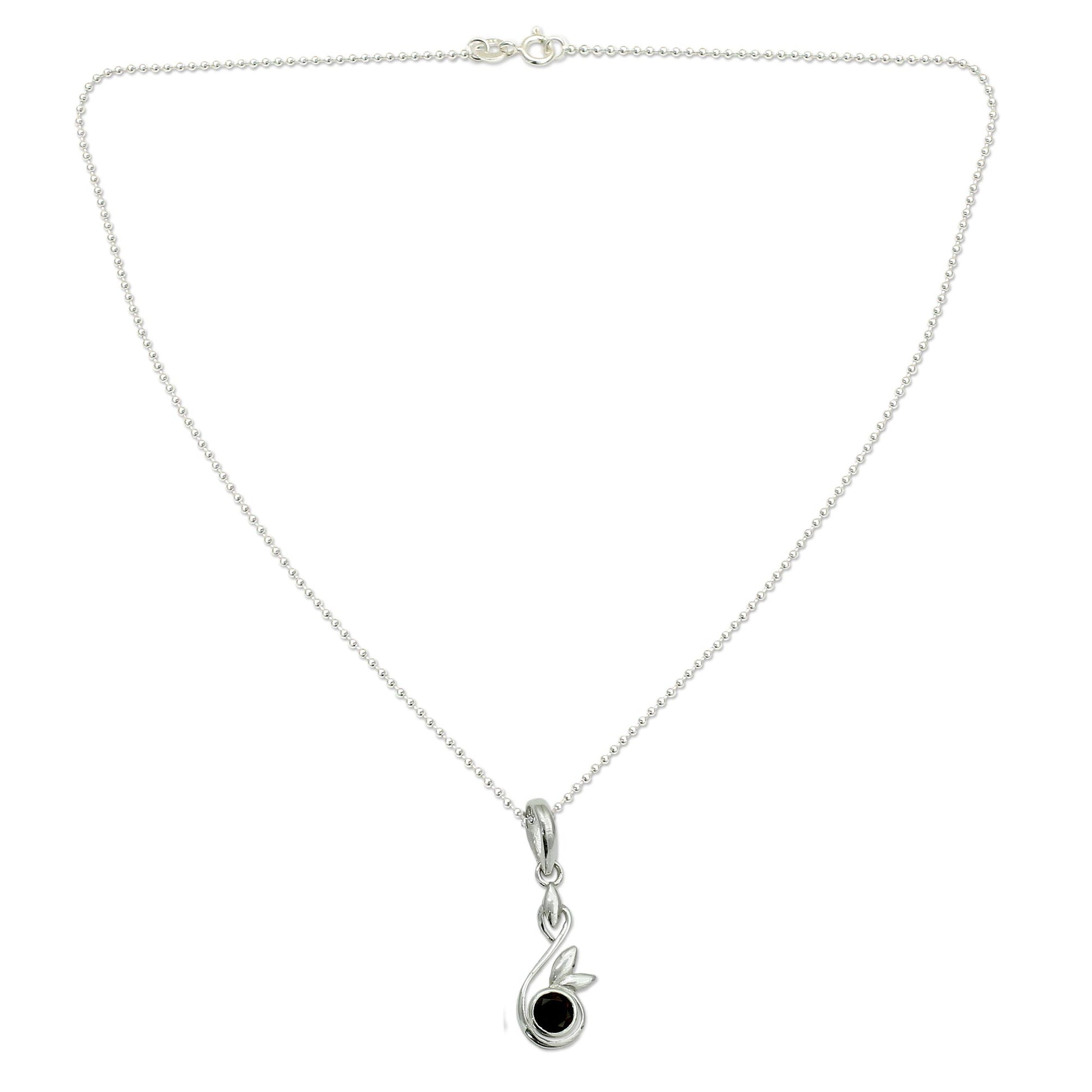 From India's Alok Jain, this modern necklace features a faceted garnet totaling 3 carats. The gemstone nestles on a silver tendril caressed by sterling leaves.