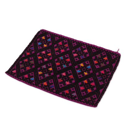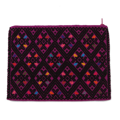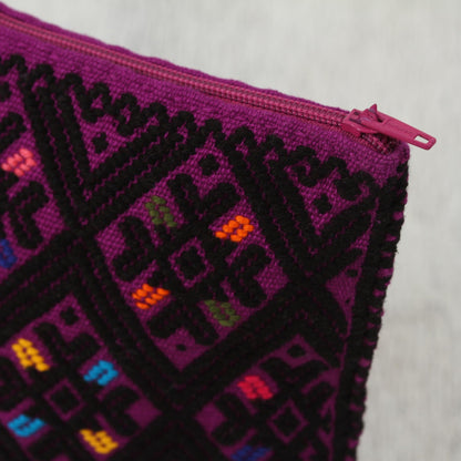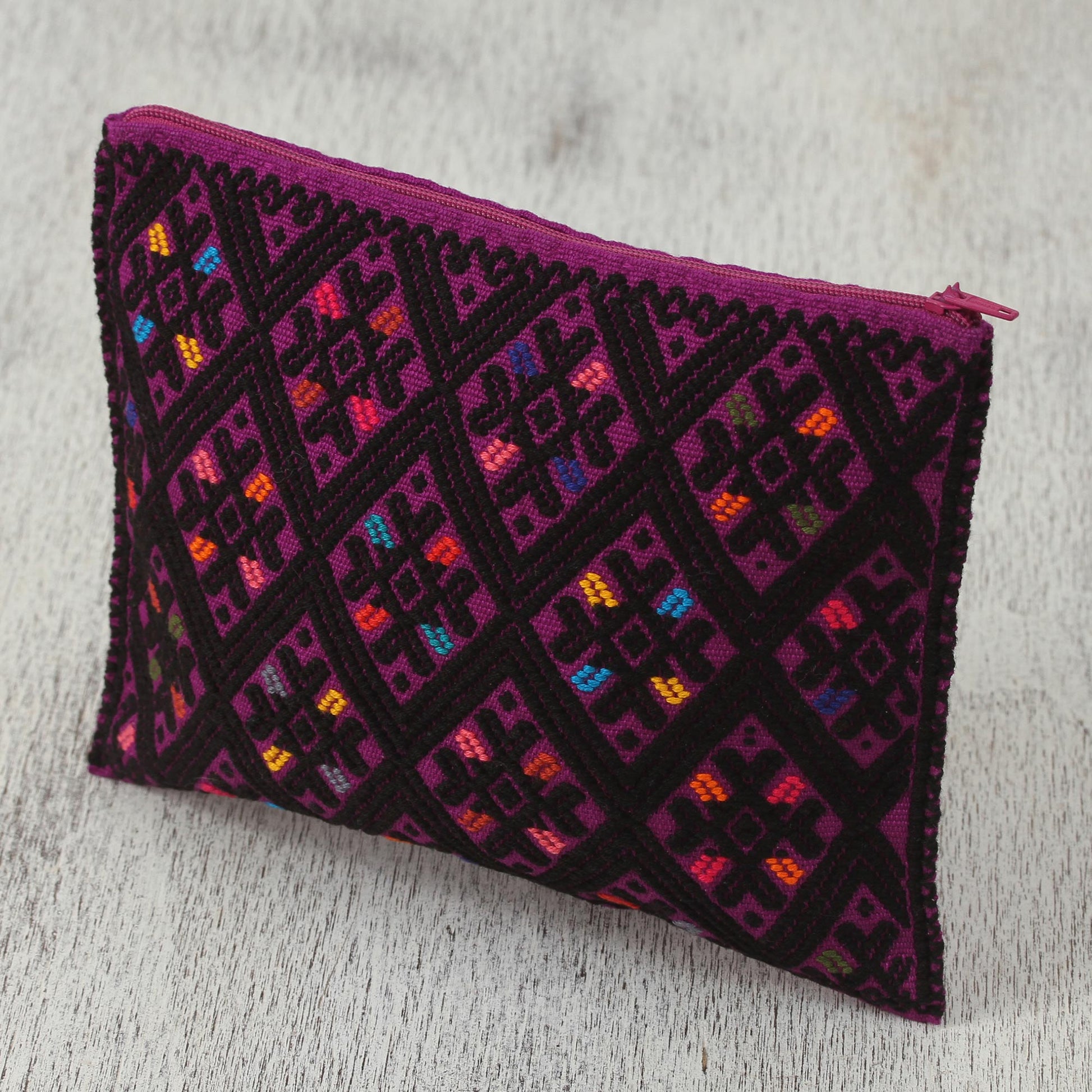 Carrying your necessities with ease, this dreamy cosmetic bag from Mexico is designed by Angelina Gomez. She hand-weaves this bag of cotton on the traditional telar de cintura, or backstrap loom to feature black and multicolored geometric patterns over a body of amethyst. This cosmetic bag opens with a zipper to a roomy, unlined interior.