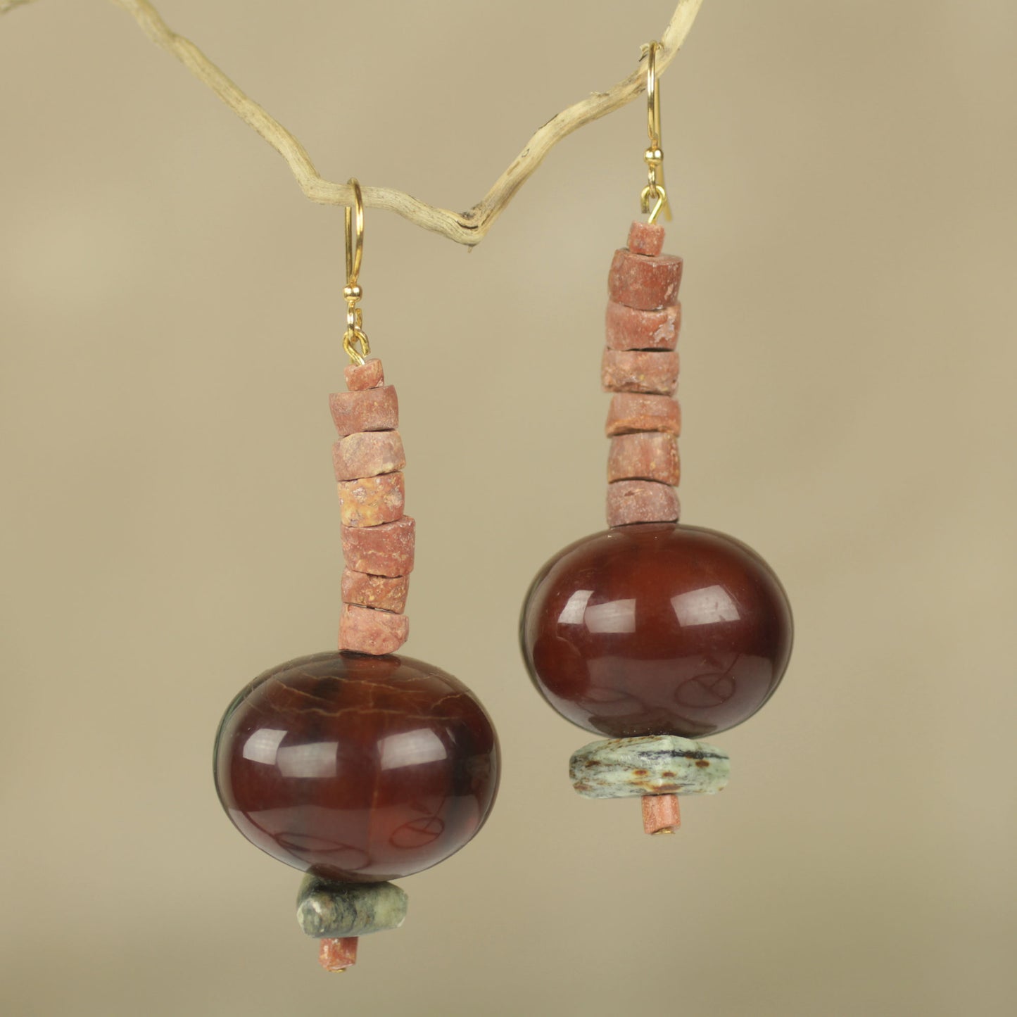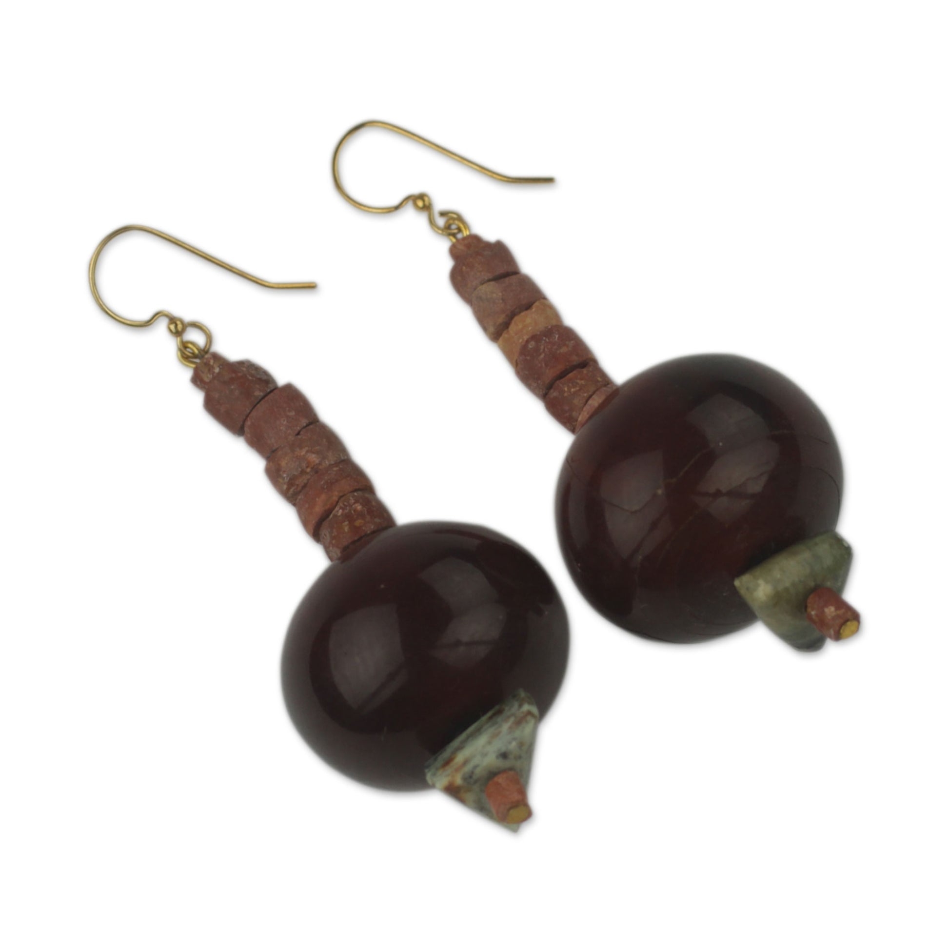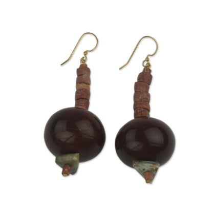 The talented Rachel Armah in Ghana presents an earring design that is rich with authentic African style. She uses polished bull horn beads in a warm brown shade, flanked by smaller beads of natural bauxite and soapstone. The earthy earrings dangle from brass hooks. Armah names the earrings Ohemaa Kese, which means 'great queen' in the Akan language.