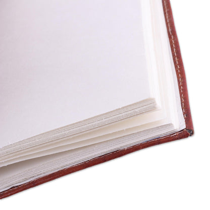 Against a body of onyx, floral motifs decorate this cotton journal from India. With a goal of providing local artisans with equitable pay, Arti Sharma presents this Indian journal. It is trimmed with leather, opening with a cotton tie to 64 pages of handcrafted cotton paper.