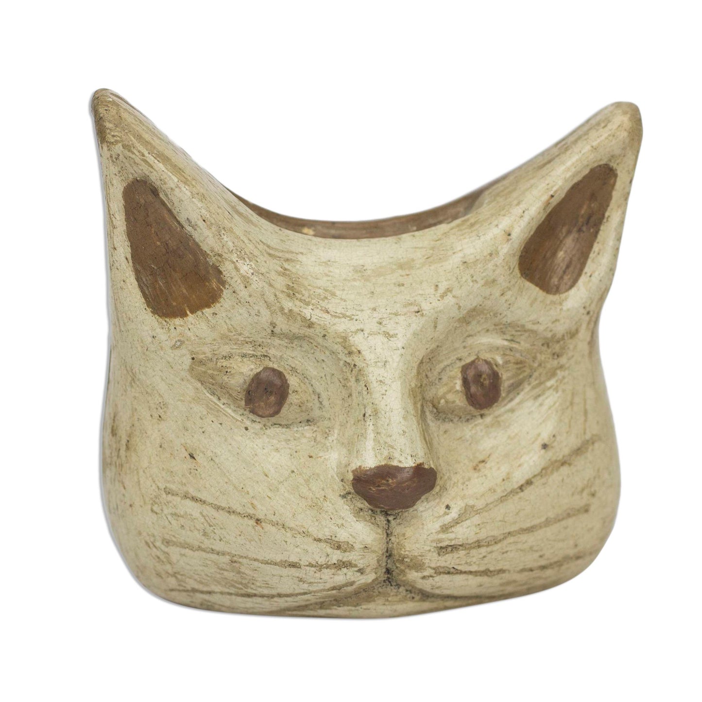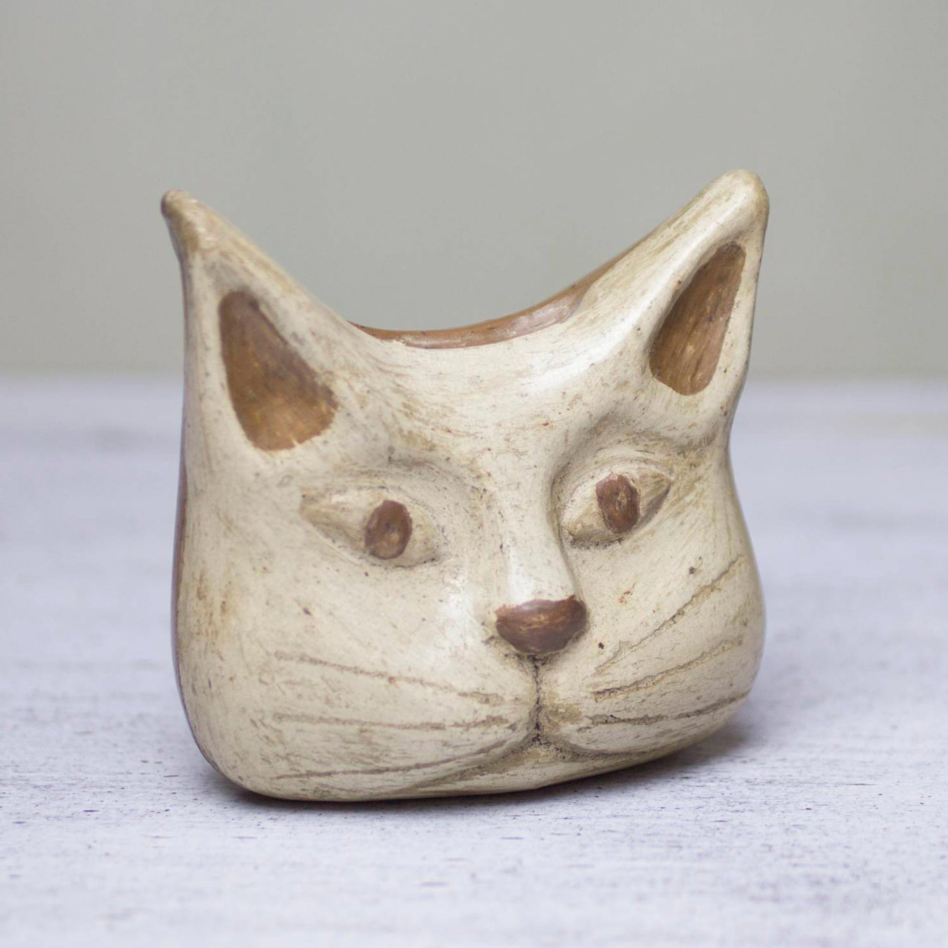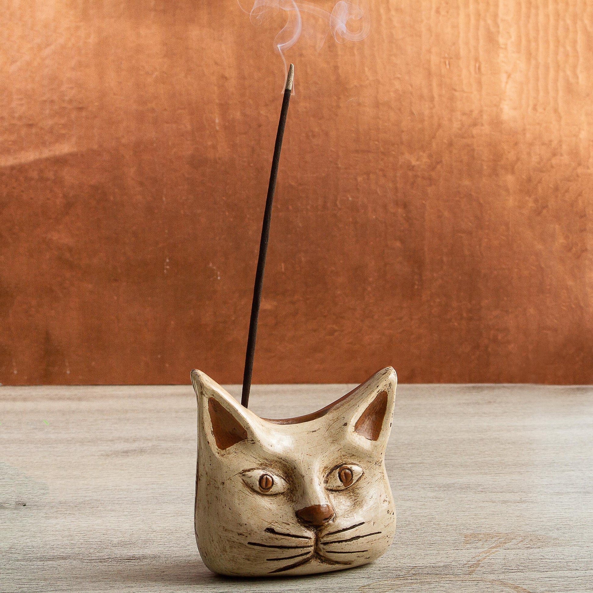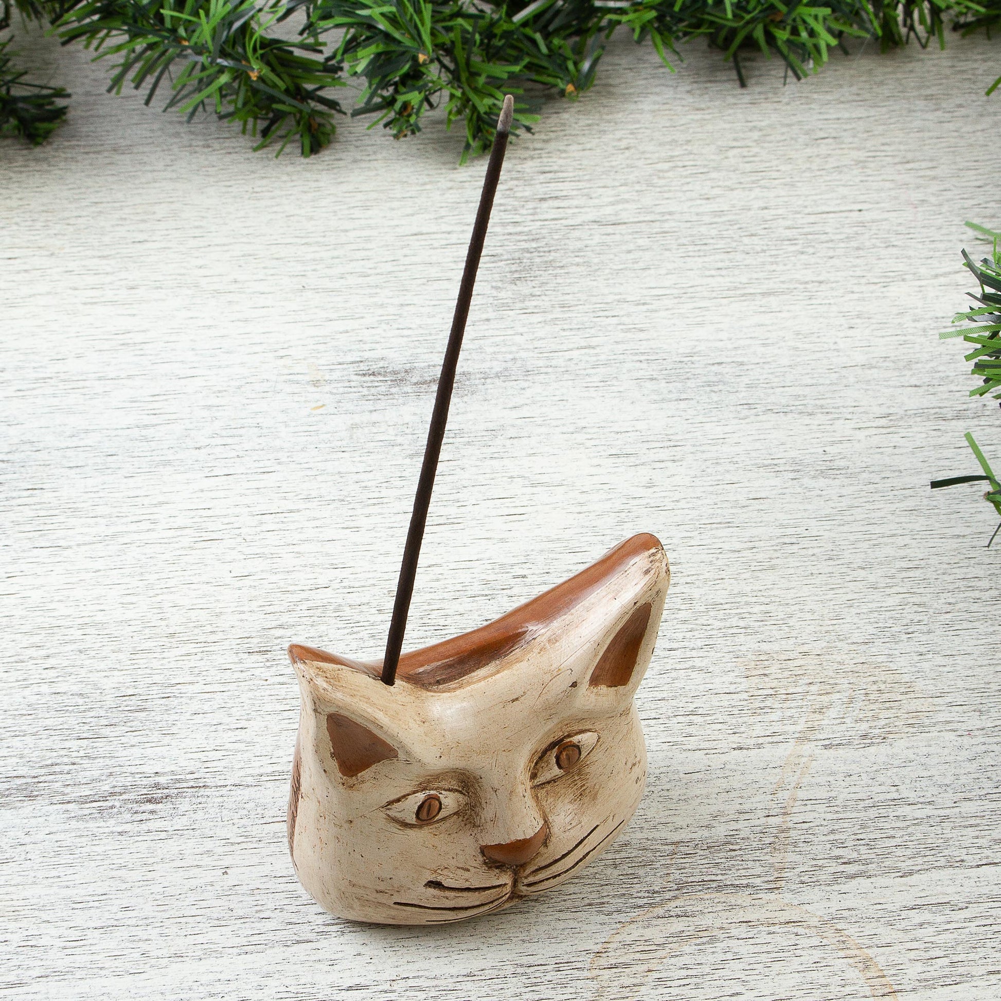 Crafted by hand, this ceramic incense holder has a double personality. One side depicts a whiskery white cat, the other, a solemn brown owl. Garcia Ochoa Family artisans perpetuate the tradition of barro bruñido, or 'burnished clay' with this delightful design. The colors come from natural oxides.