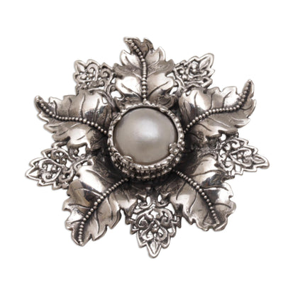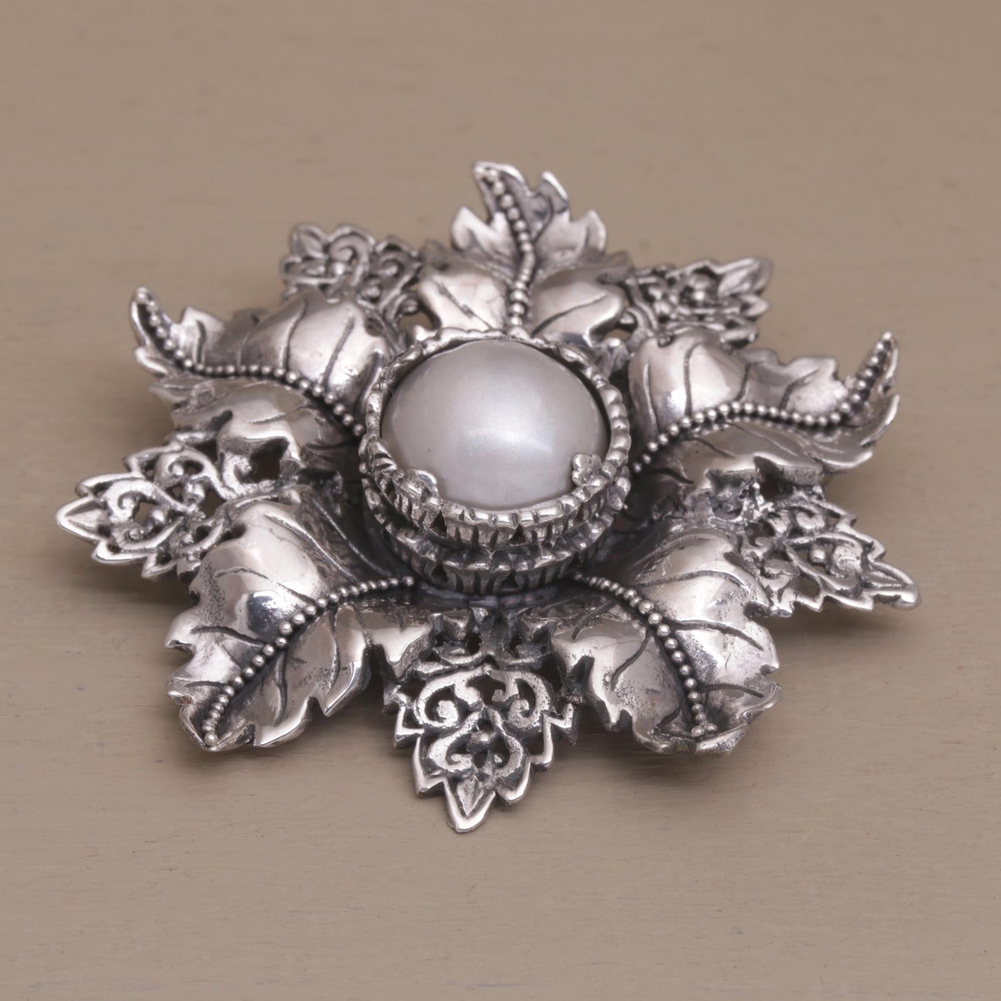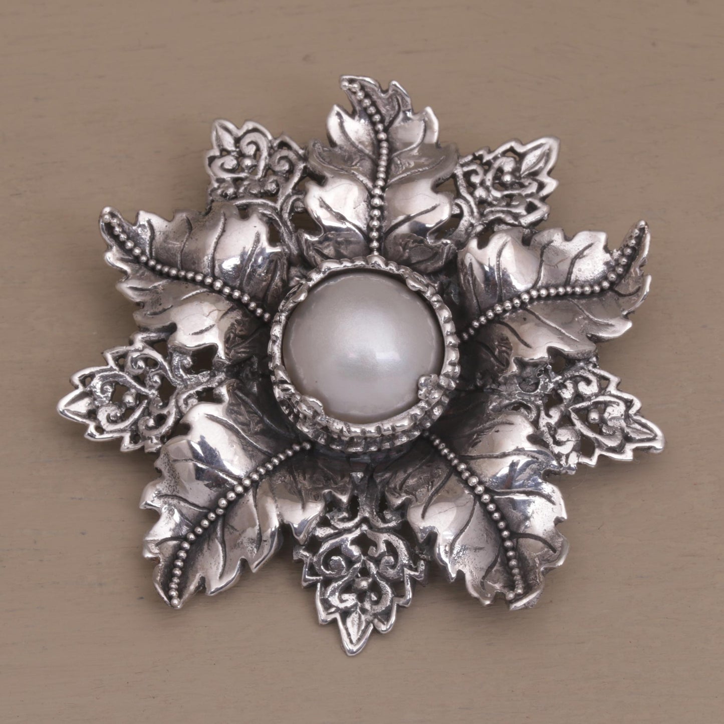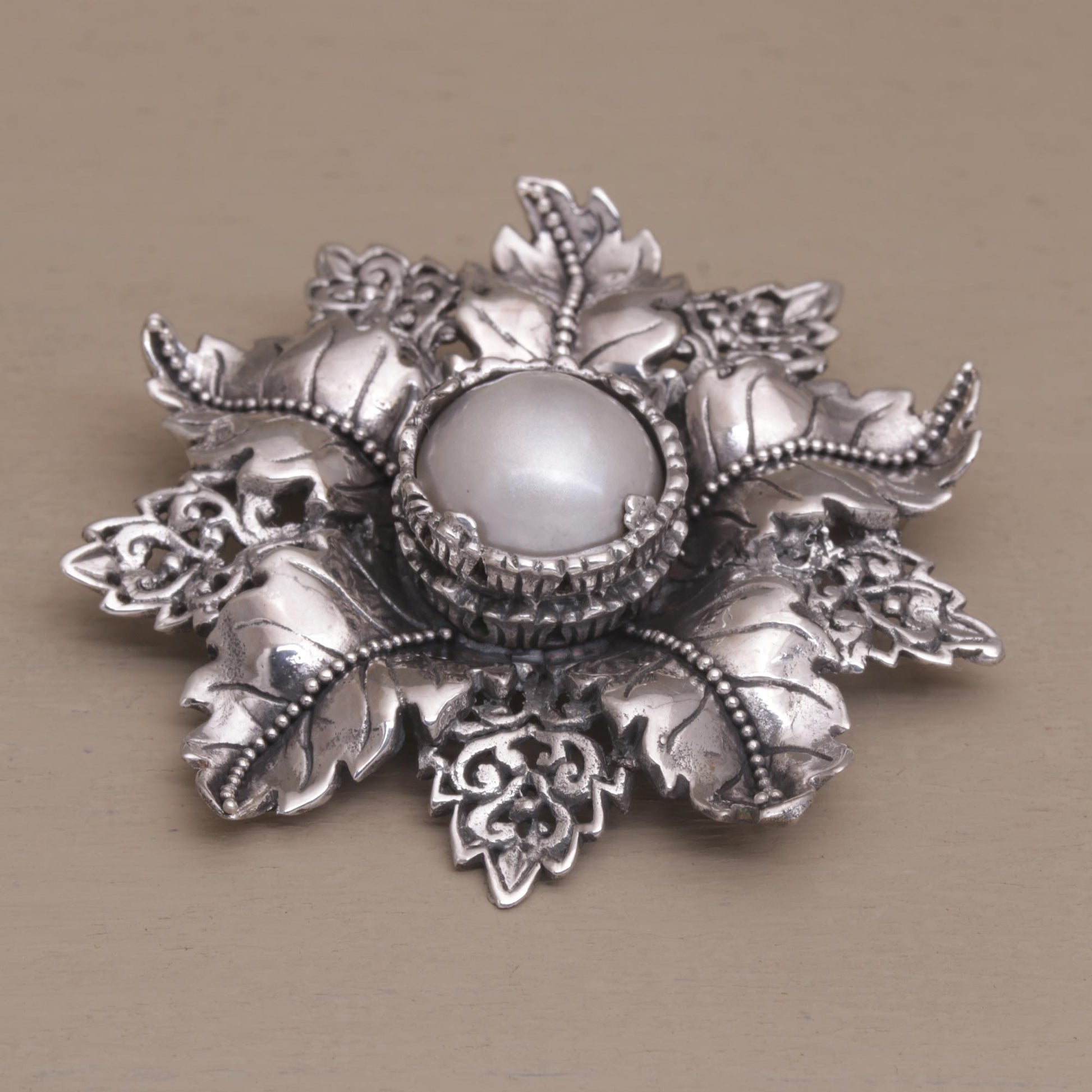 The artistic leaves of this exquisite flower will draw the attention to you. Balinese artisan Dewa Arimbawa designs this unforgettable brooch. Crafted by hand, the leaves surround a single cultured mabe pearl that glows with the brilliance of the moon at the center.