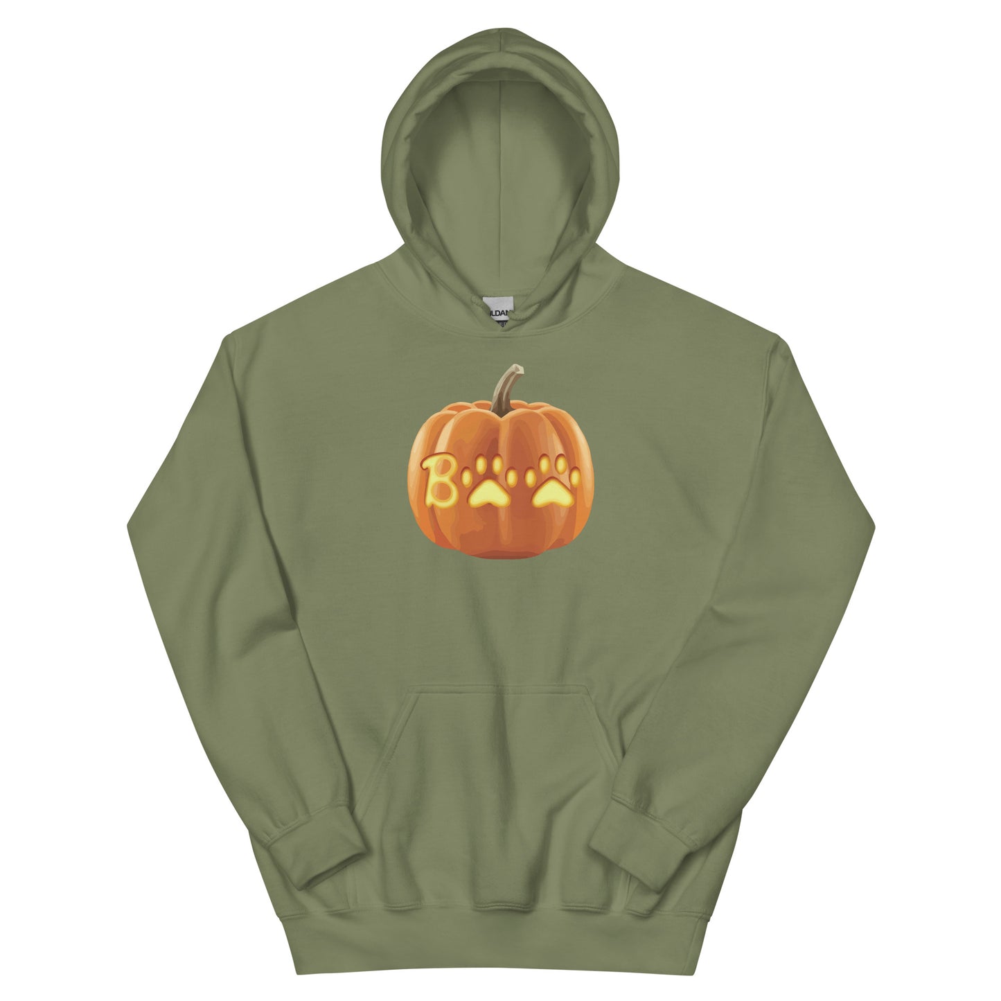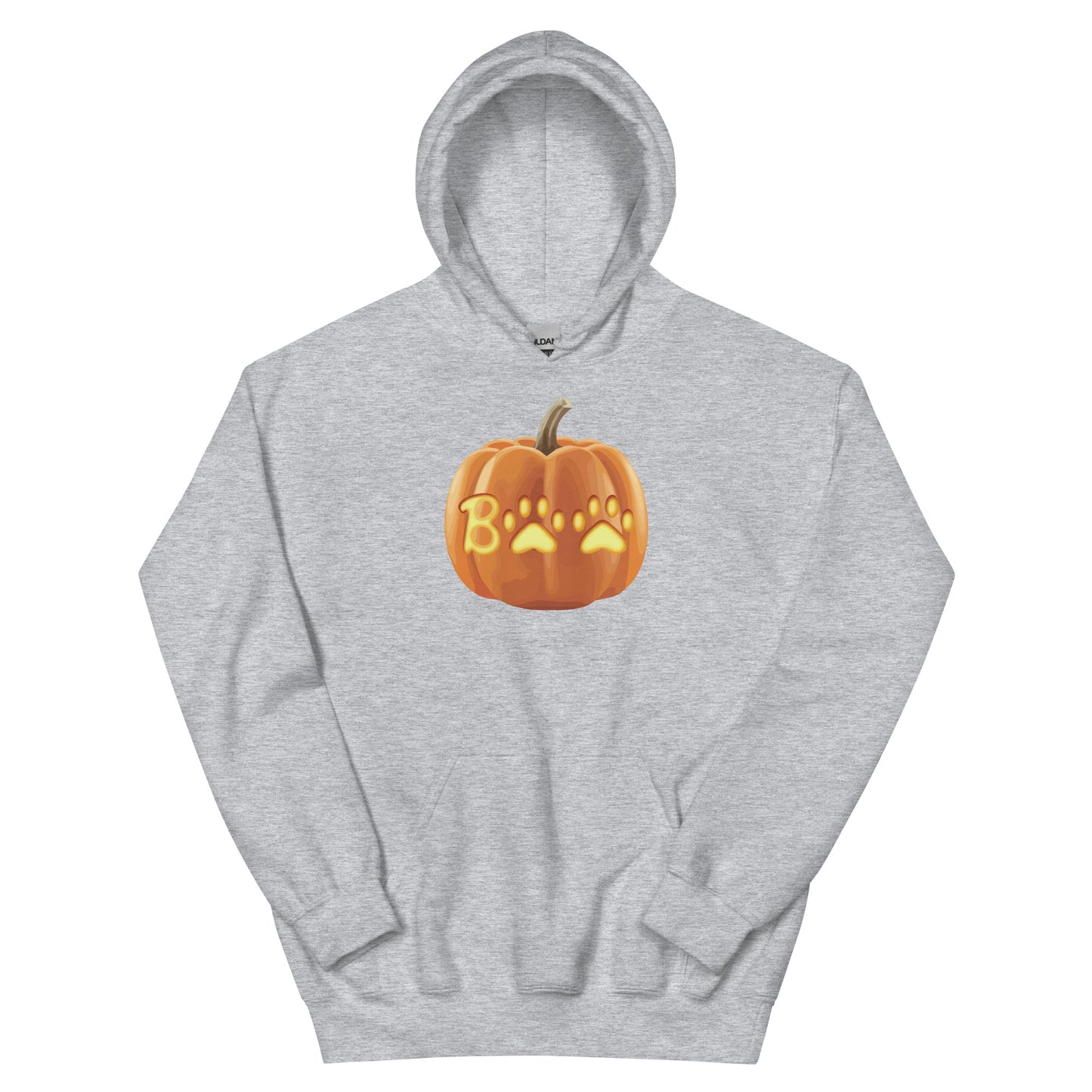 Cuddle up this autumn in this super soft and cozy hooded sweatshirt. With a cute little pumpkin carved with the word Boo, that features two paw prints, this hoodie is a must have for animal lovers.