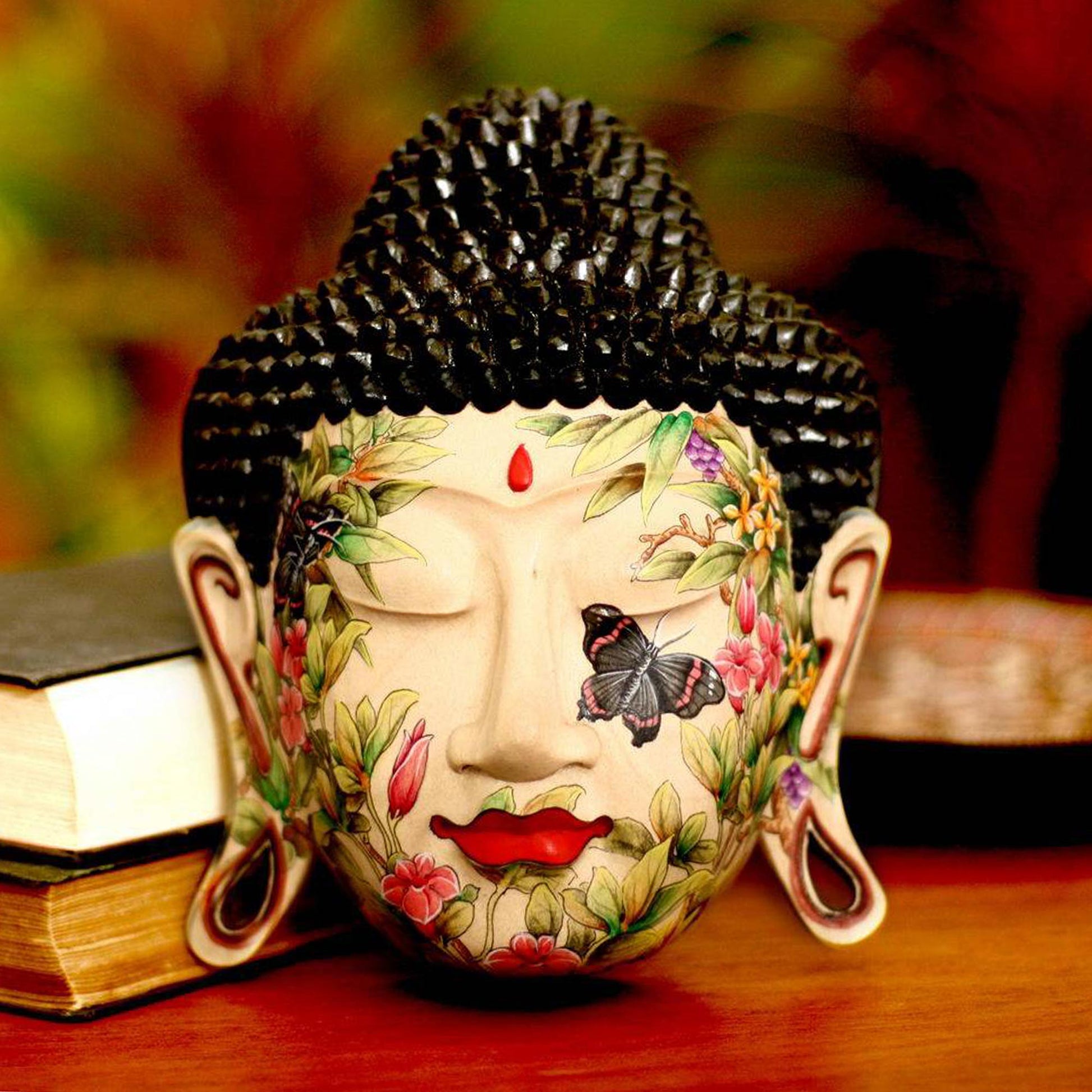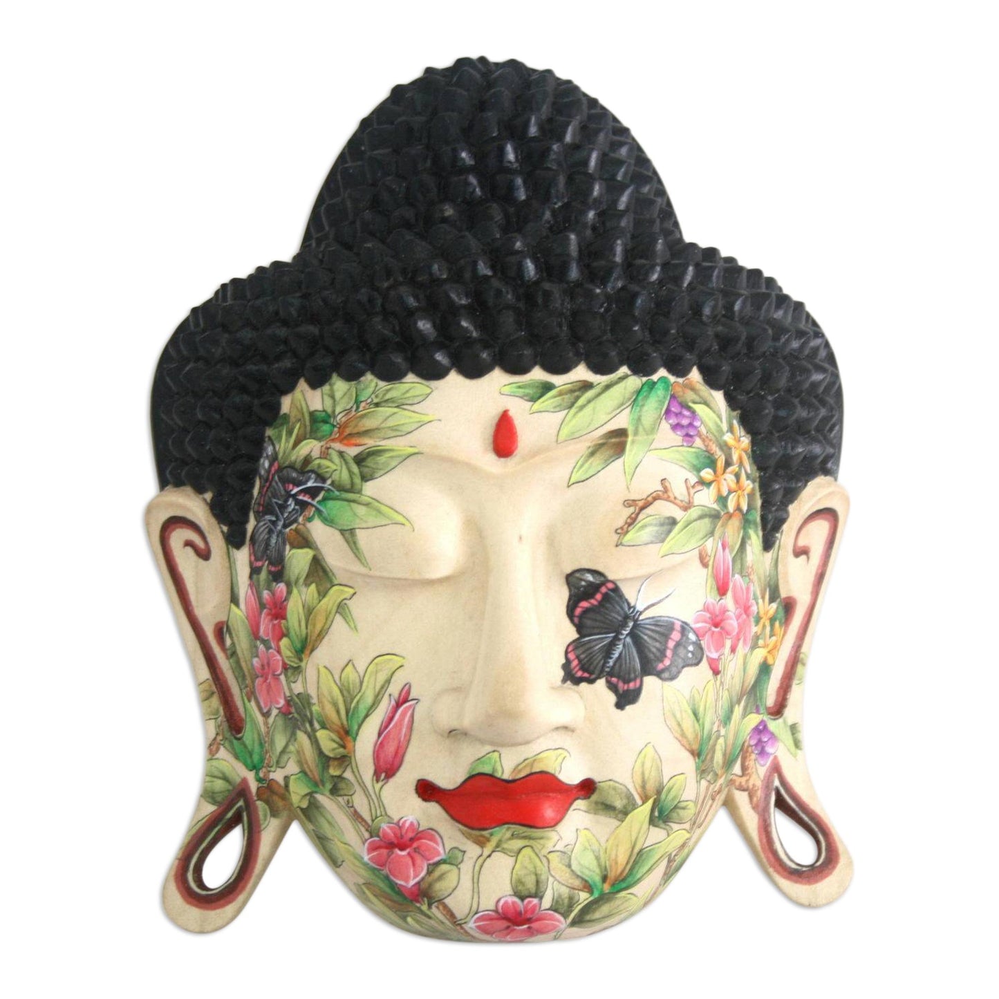 A contemplative Buddha takes on the face of nature in this mesmerizing mask by Gung Gus. Detailed with vivid artistry, the mask is carved of seasoned crocodile wood and painted by hand.