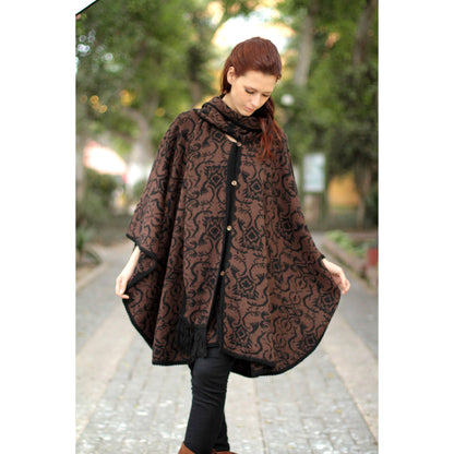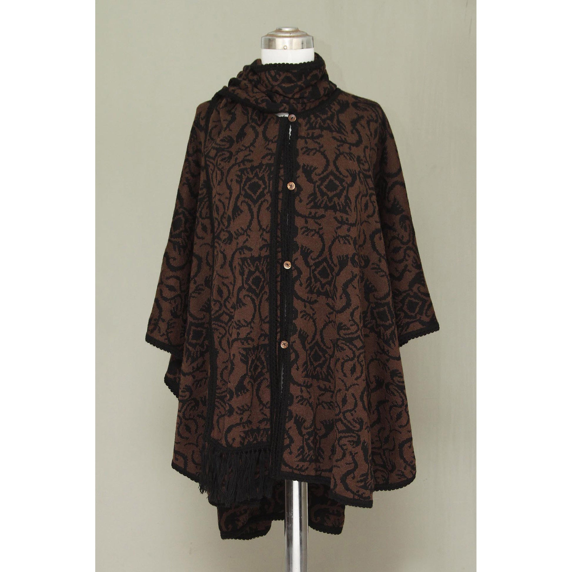 Alfredo Falcon creates a reversible design for a ruana cloak in rich brown and black adorned with abstract florid arabesques. The cloak is knitted with a rich alpaca blend and closes with coconut shell buttons. A warm scarf ensures soft, stylish warmth.
