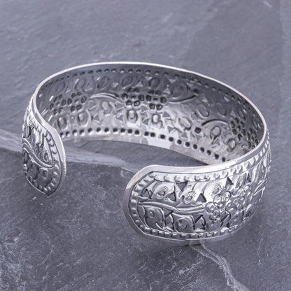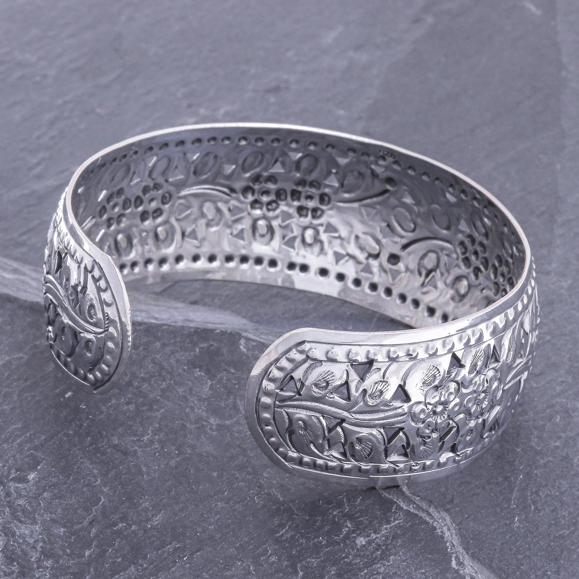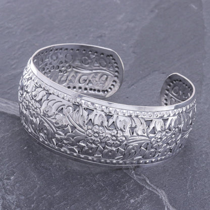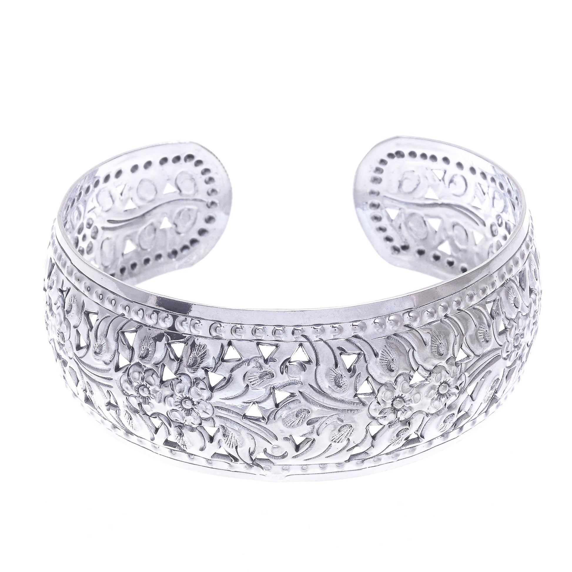 Lavish and lovely, jasmine flows in arabesques across an opulent sterling cuff. Depicted in openwork, it graces an exquisite Thai design by Achara.