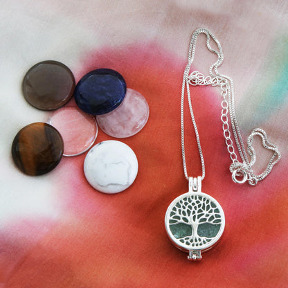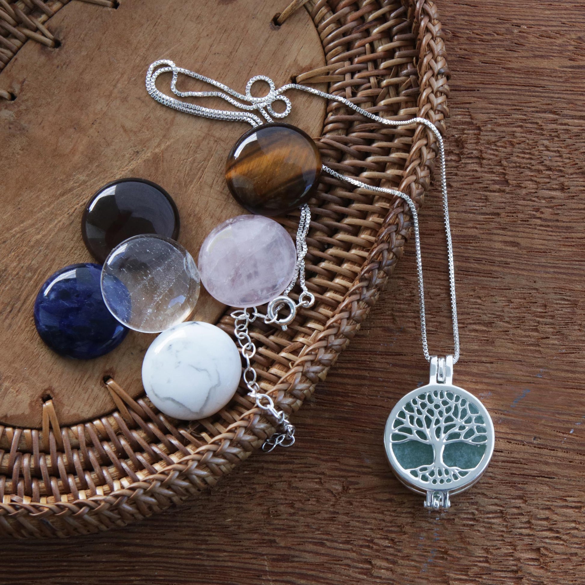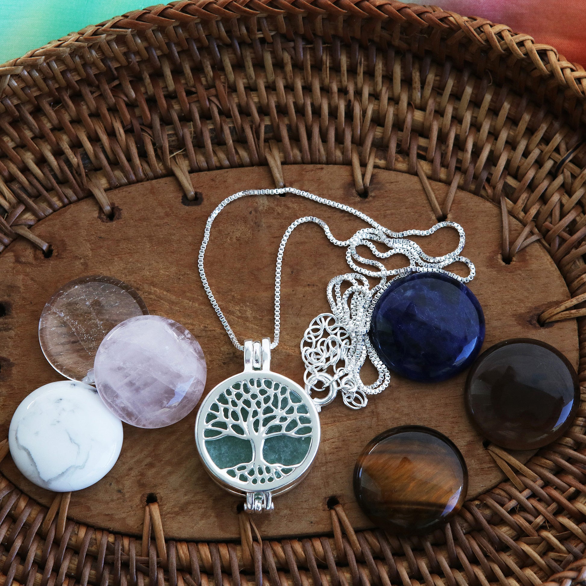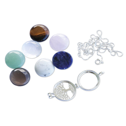 Sure to be the most popular piece in your jewelry wardrobe, this necklace from Brazil's Joias do Rio is wonderfully versatile. A rhodium-plated tree of life pendant opens to accommodate one of the seven included gemstone cabochons — smoky quartz, sodalite, green quartz, rose quartz, howlite, clear quartz and tiger's eye. The pendant centers a rhodium plated Venetian box chain.