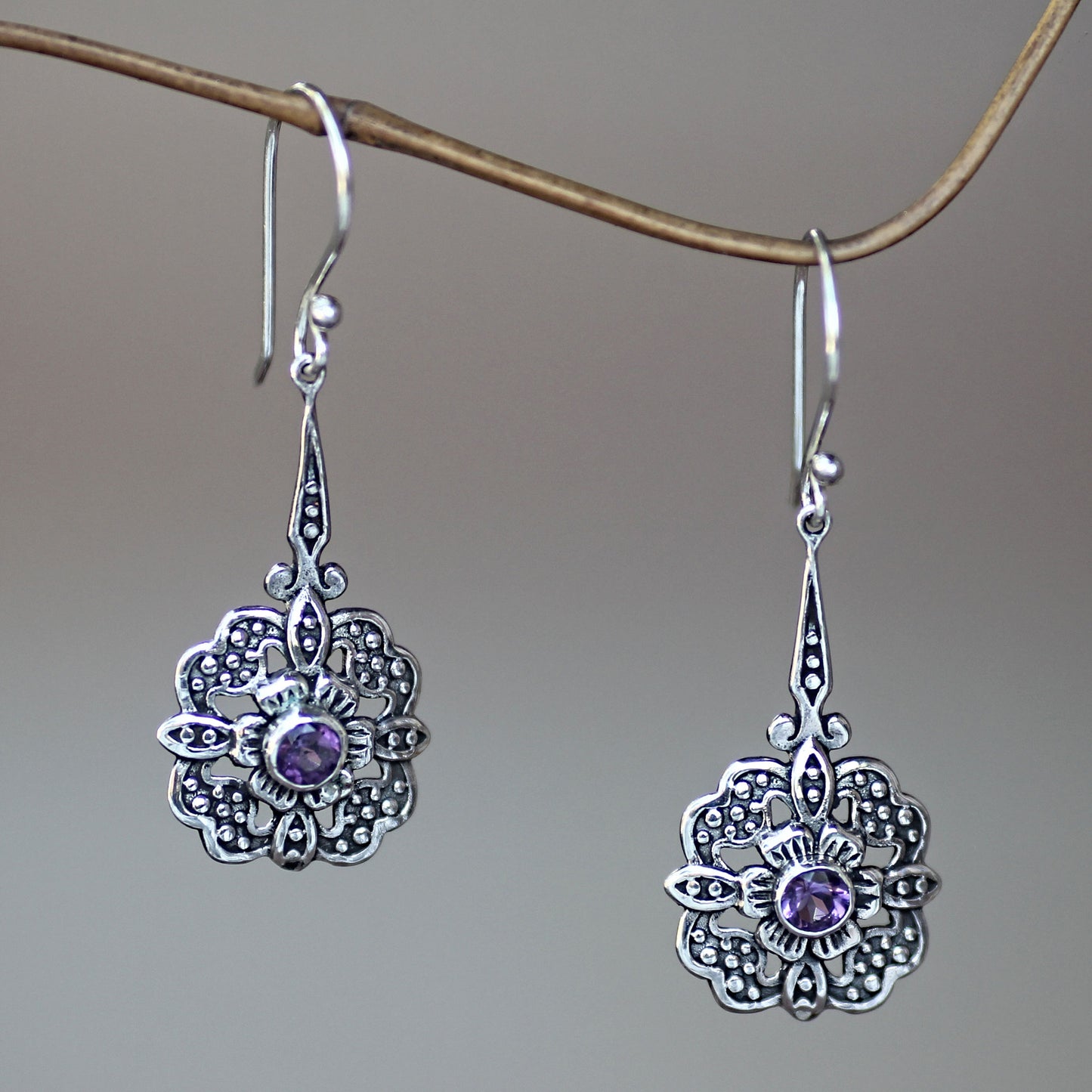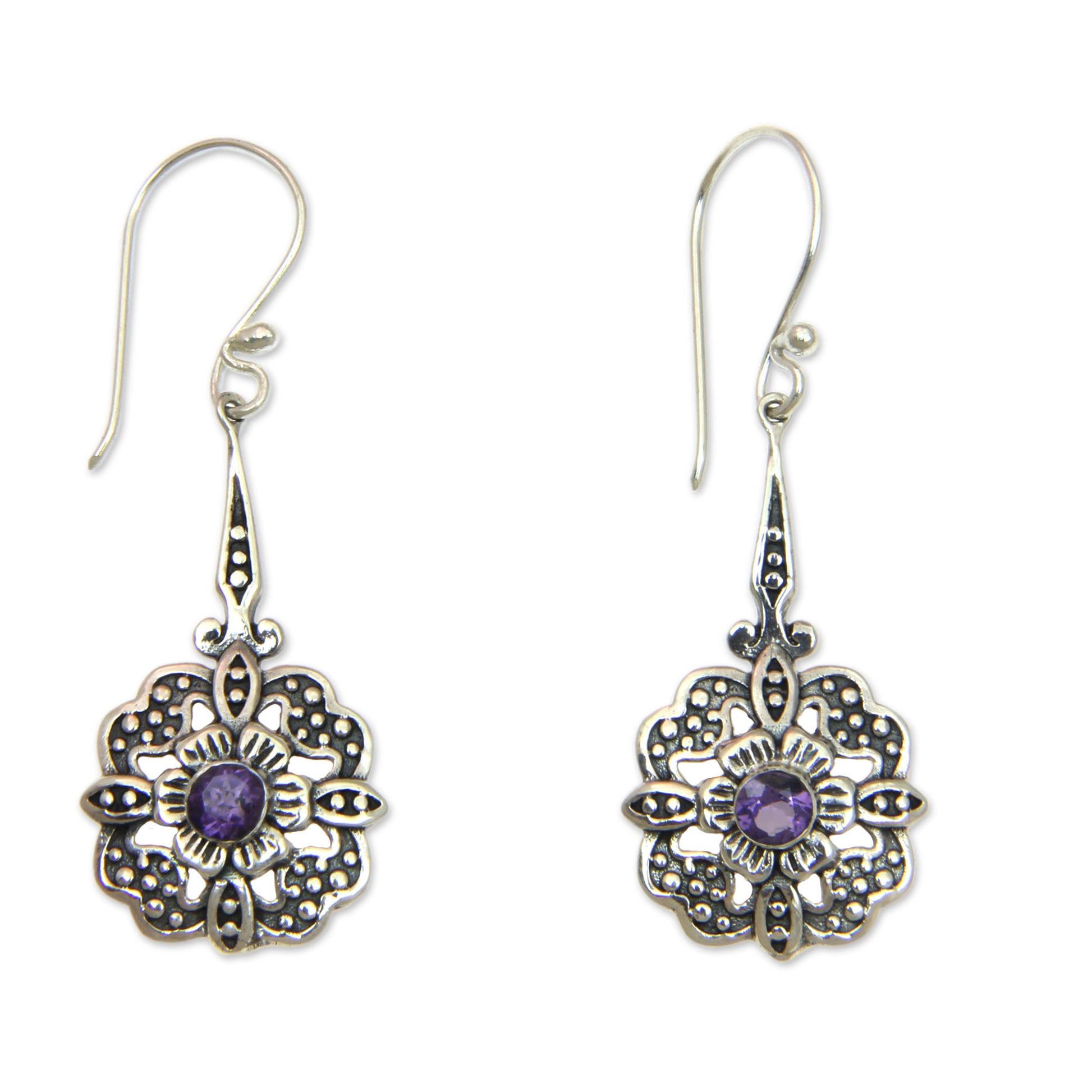 Rafflesia, a five-petaled flower indigenous to the rain forests of Indonesia, forms the central design of these dangle earrings from Wayan Asmana in Bali. The earrings are crafted of sterling silver with polished and oxidized finishes for contrast, and are centered by sparkling amethysts.