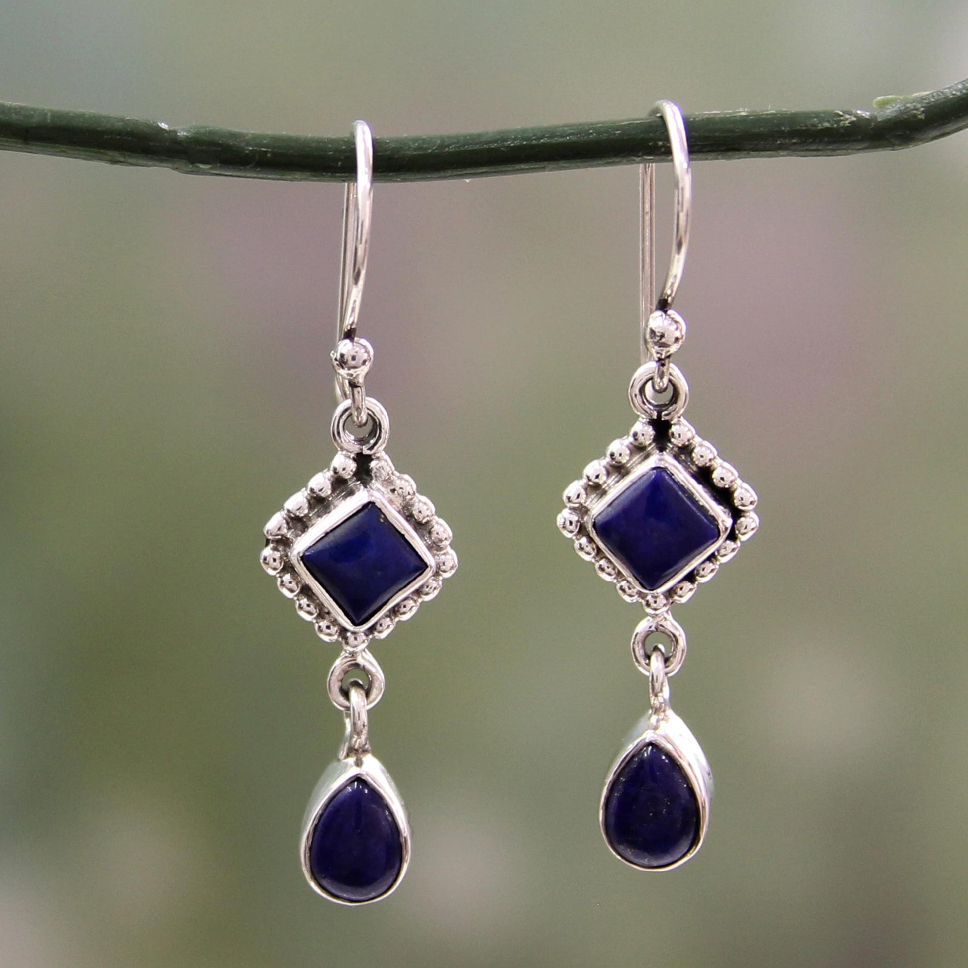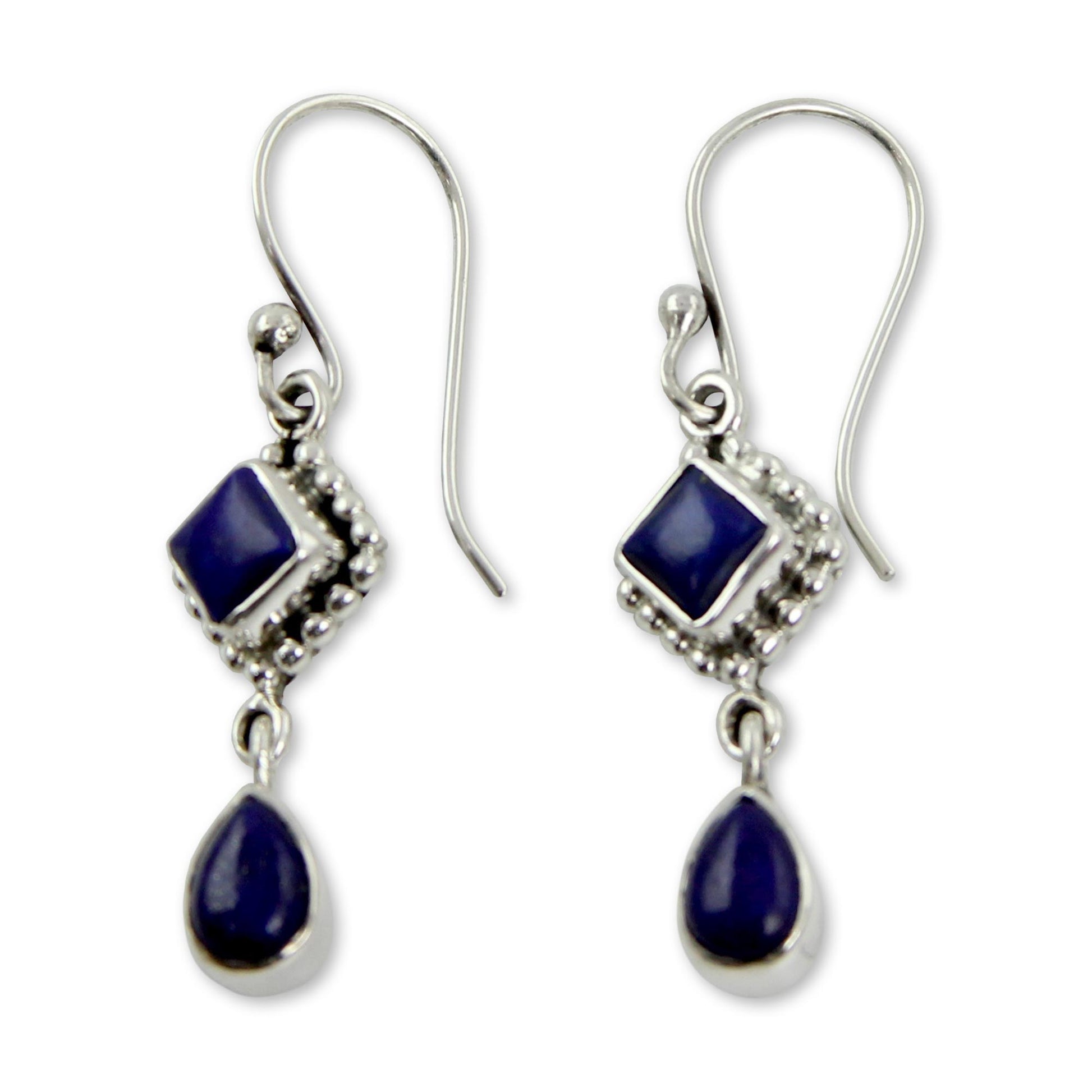 Lapis lazuli diamonds hold deep blue teardrops, their gold-flecked charisma enhanced by silver settings. Suspended on sterling hooks, the gems grace regal earrings by Neeru Goel.