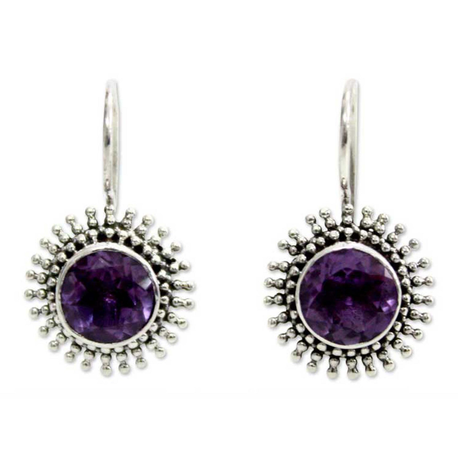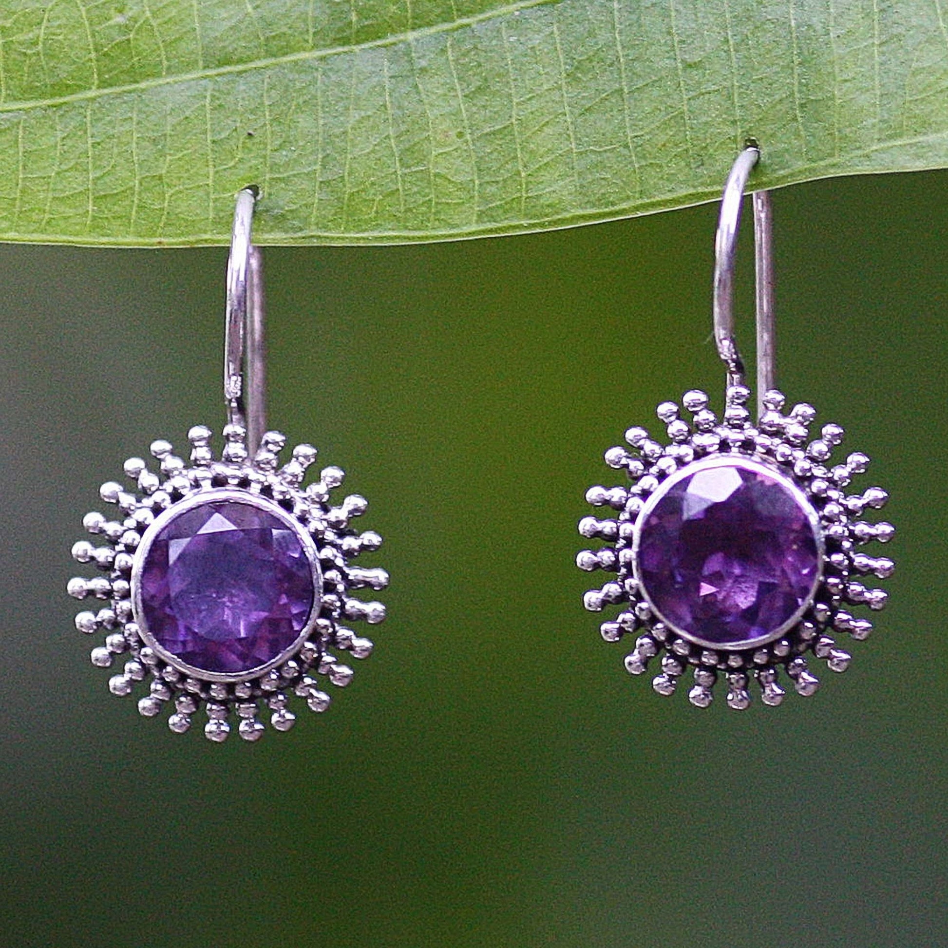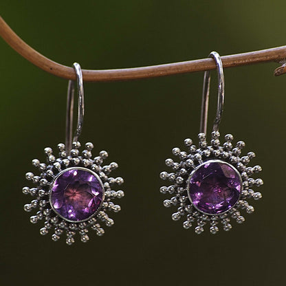 Crafted by hand, these enchanting earrings are presented by Komang Wirawan in Bali. Radiant silver sunbeams surround dazzling amethysts that total some 2.5 carats.
