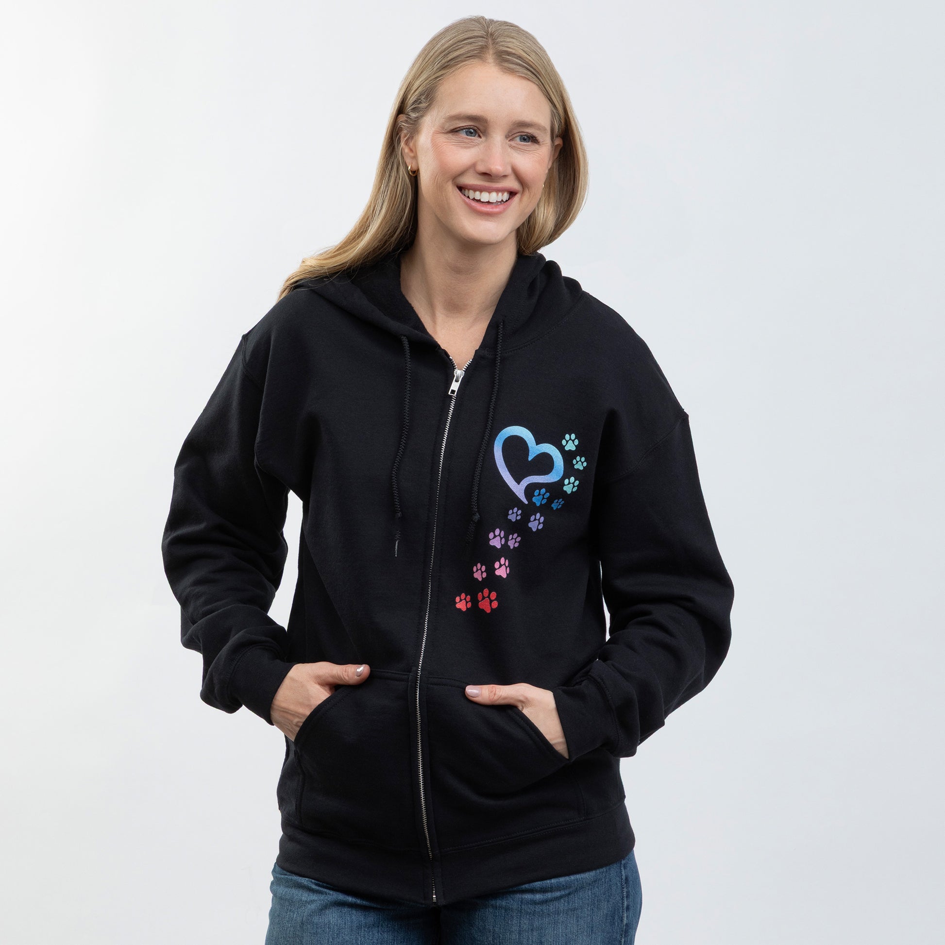 This cheerful rainbow paw print hooded sweatshirt with zipper, wraps you in ultra-soft fleece while adding a colorful pop of pet-lover charm to your day. With its sturdy metal zipper, color-matched drawstrings, and cozy feel inside and out, this heavy blend zip hoodie is made for effortless comfort. Deep front pockets keep your hands warm and your essentials close during every adventure, whether you're a proud dog mom, cat lover, or dedicated animal rescue supporter. Most of all, the vibrant paw design lets you show the world your big heart for animals—making it the perfect pet lover apparel gift for yourself or someone special.