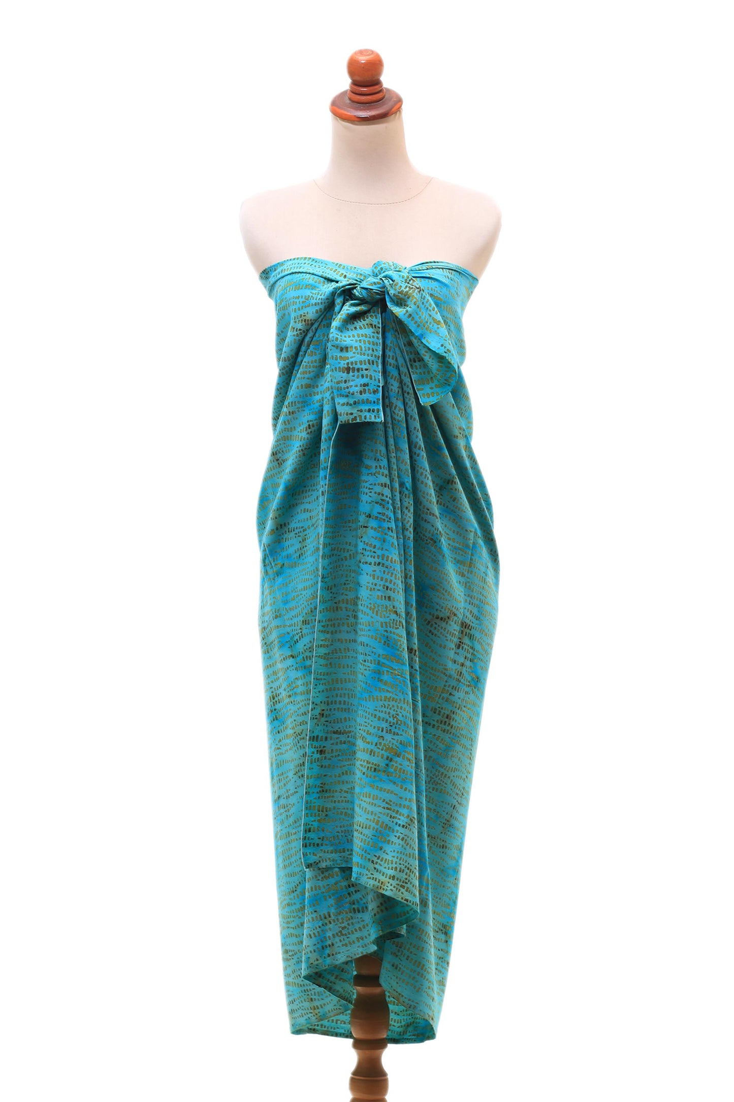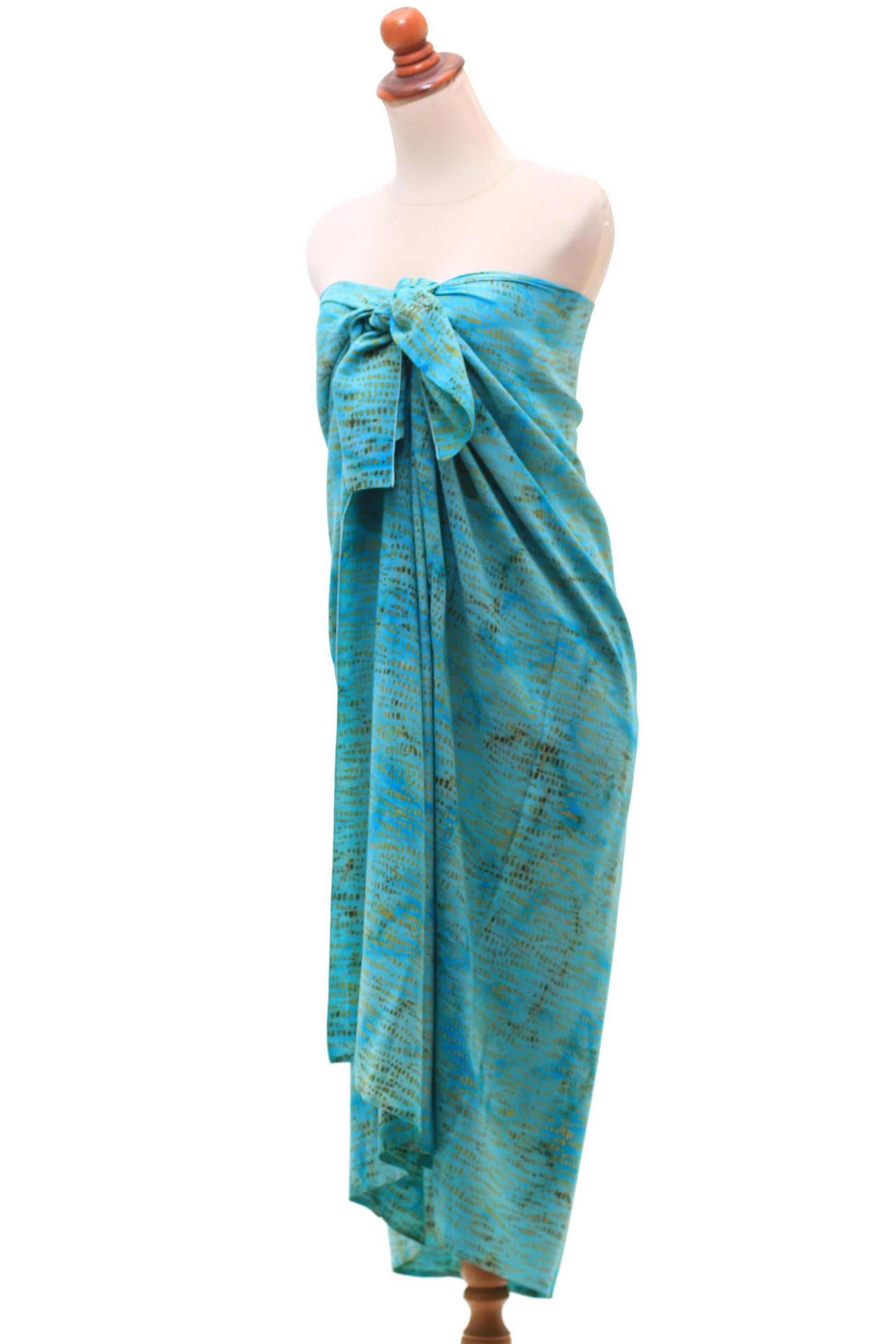 Possessing a tropical vibe, this rayon sarong is presented by Mayda in Bali. Hues of aqua and cerulean contrast with dotted motifs in tan, achieved using the batik method, where the fabric is hand-stamped with a wax resist before being treated with colorful dyes.