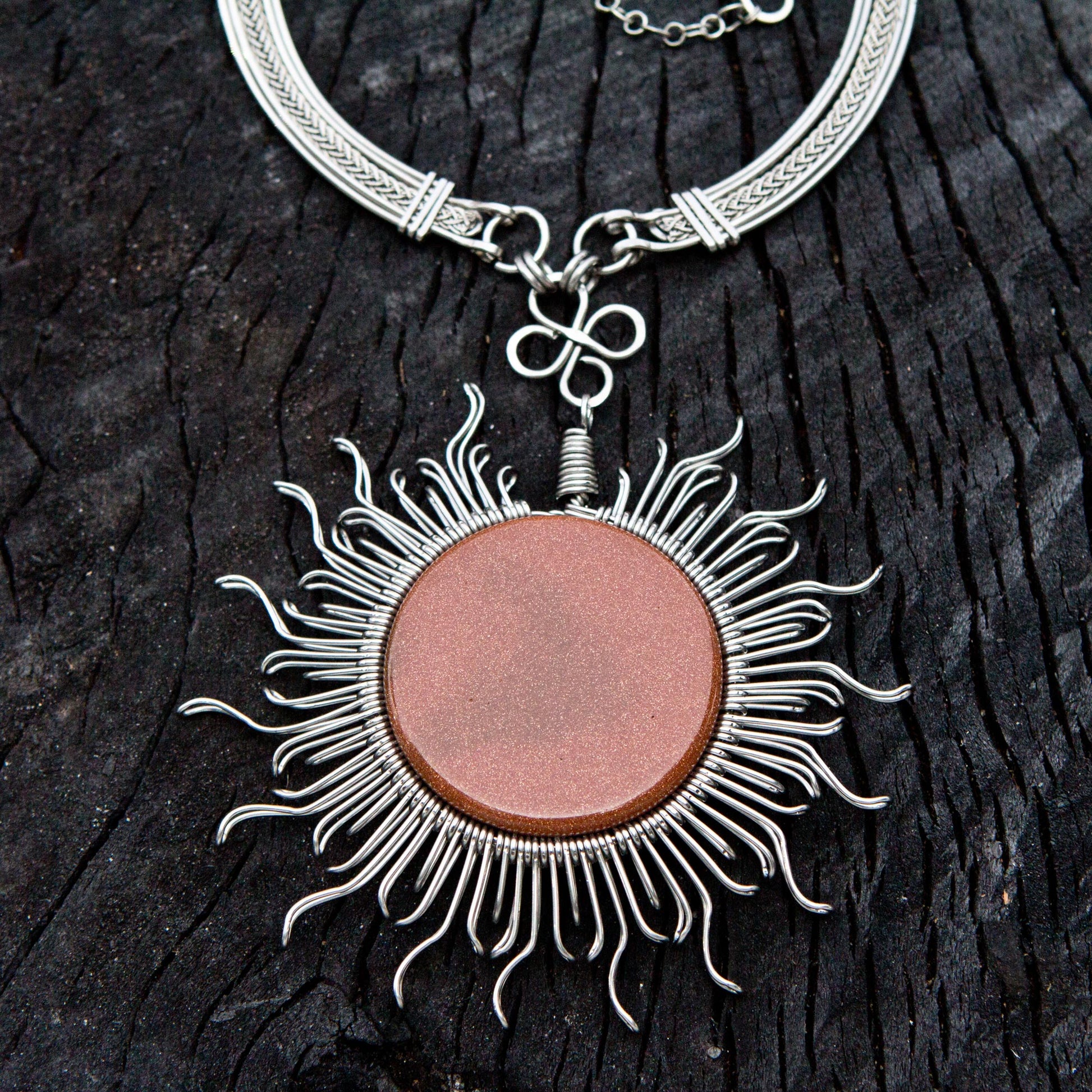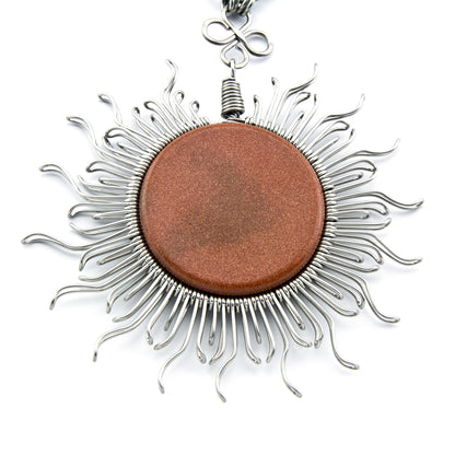 An elaborate sun-shaped pendant glows orange at the bottom of this statement necklace by Brazil's Ailton Oliver. Featuring a large, round goldstone, it hangs from a variety of chain types made from stainless steel for an elaborate and unforgettable look.