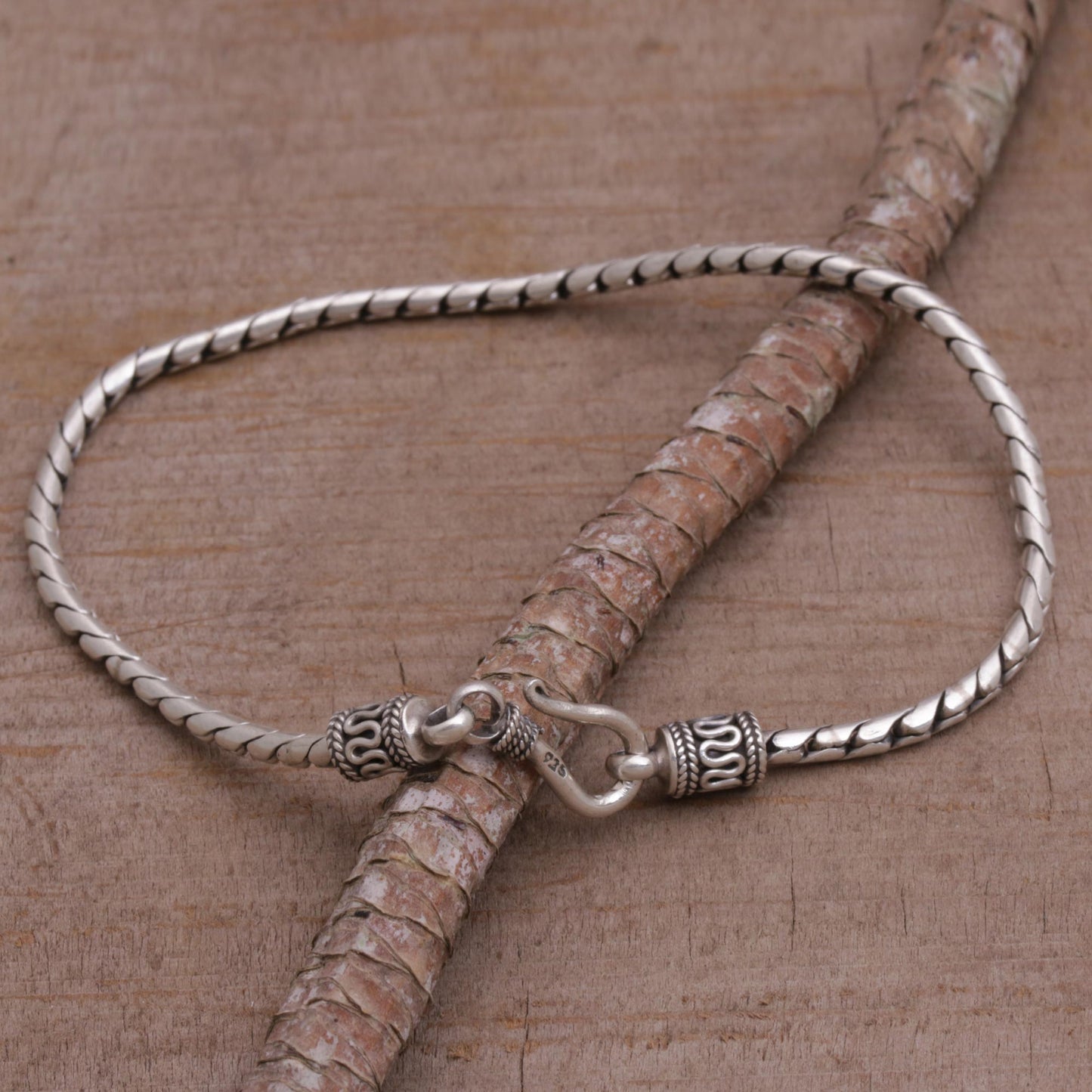 An elegant length of wide snake chain circles the wrist for a simple, yet sophisticated accessory. Handcrafted of sterling silver by Balinese artisans, this bracelet is presented by Putu Putri.