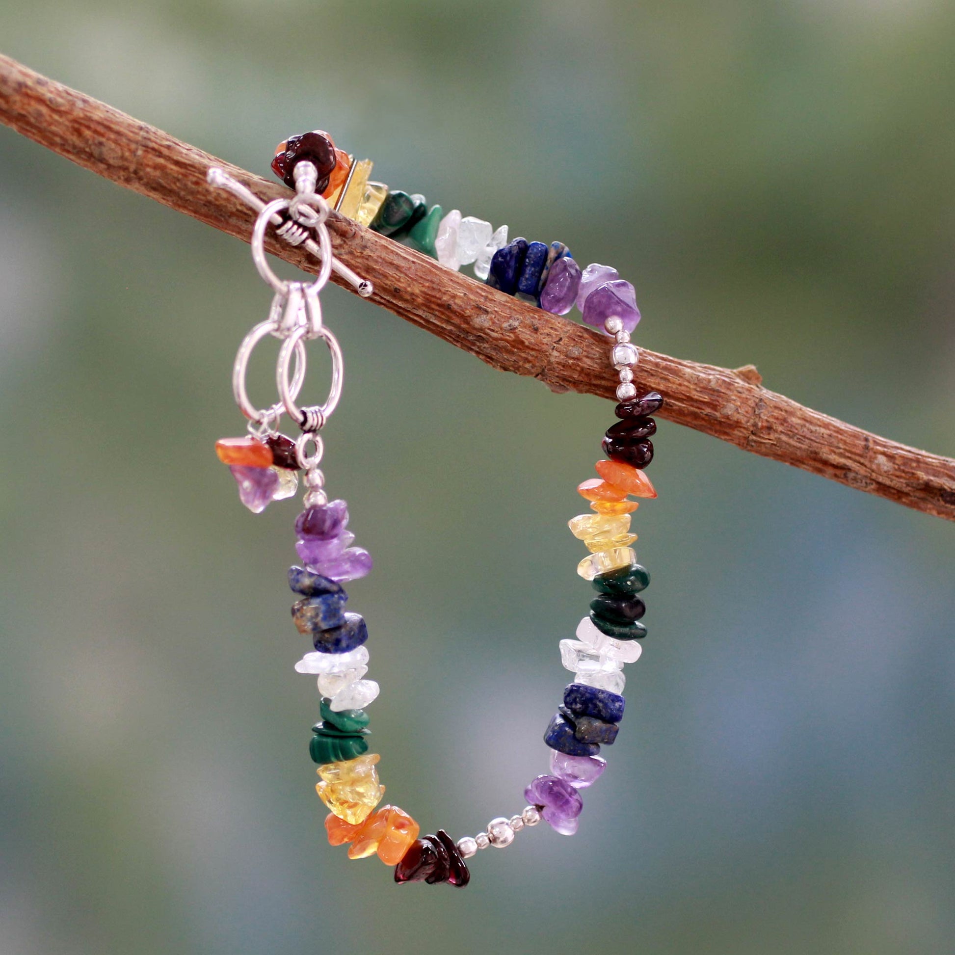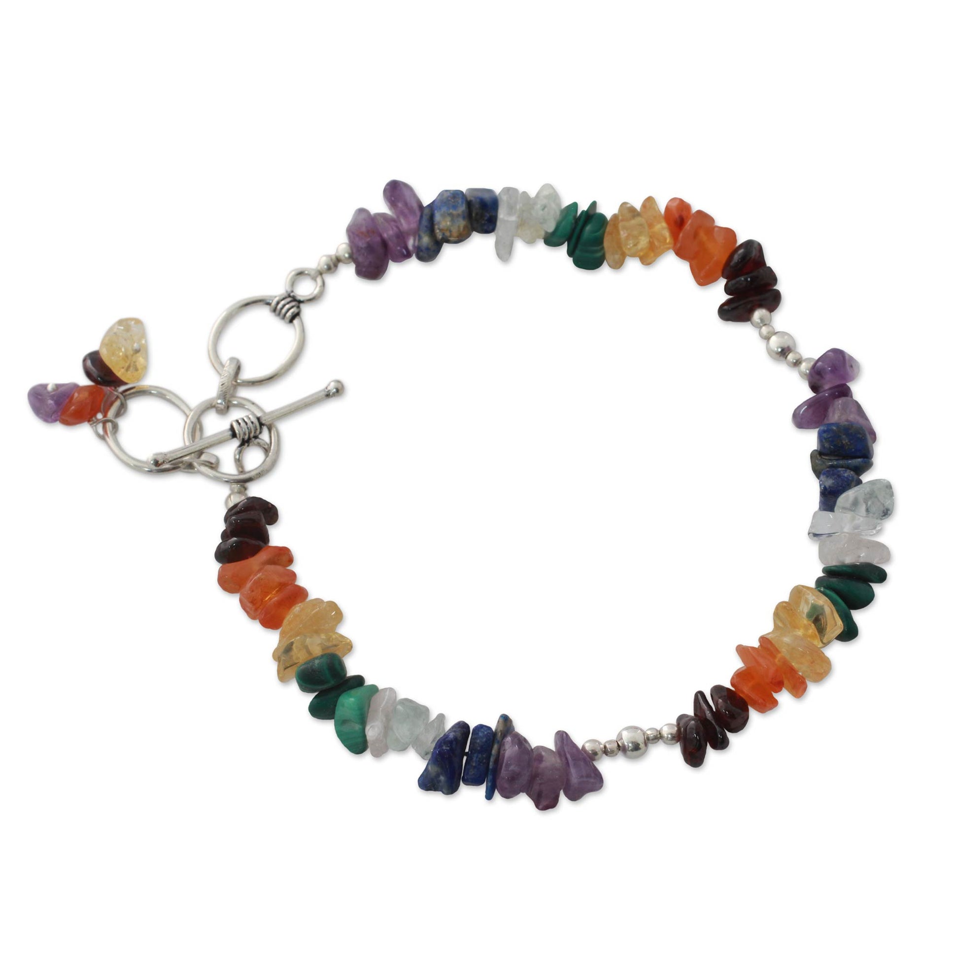 Gemstones represent the seven chakras with their colors. The word means 'wheel' and refers to the points of spiritual and physical energy in the human body. Violet, indigo, blue, green, yellow, orange and red represent the crown, brow, throat, heart, solar plexus, sacral and root, and each is linked to a different mantra. Handcrafted by Rituu, this colorful bracelet combines a medley of amethyst, lapis lazuli, citrine and malachite with aquamarine, carnelian and garnet.