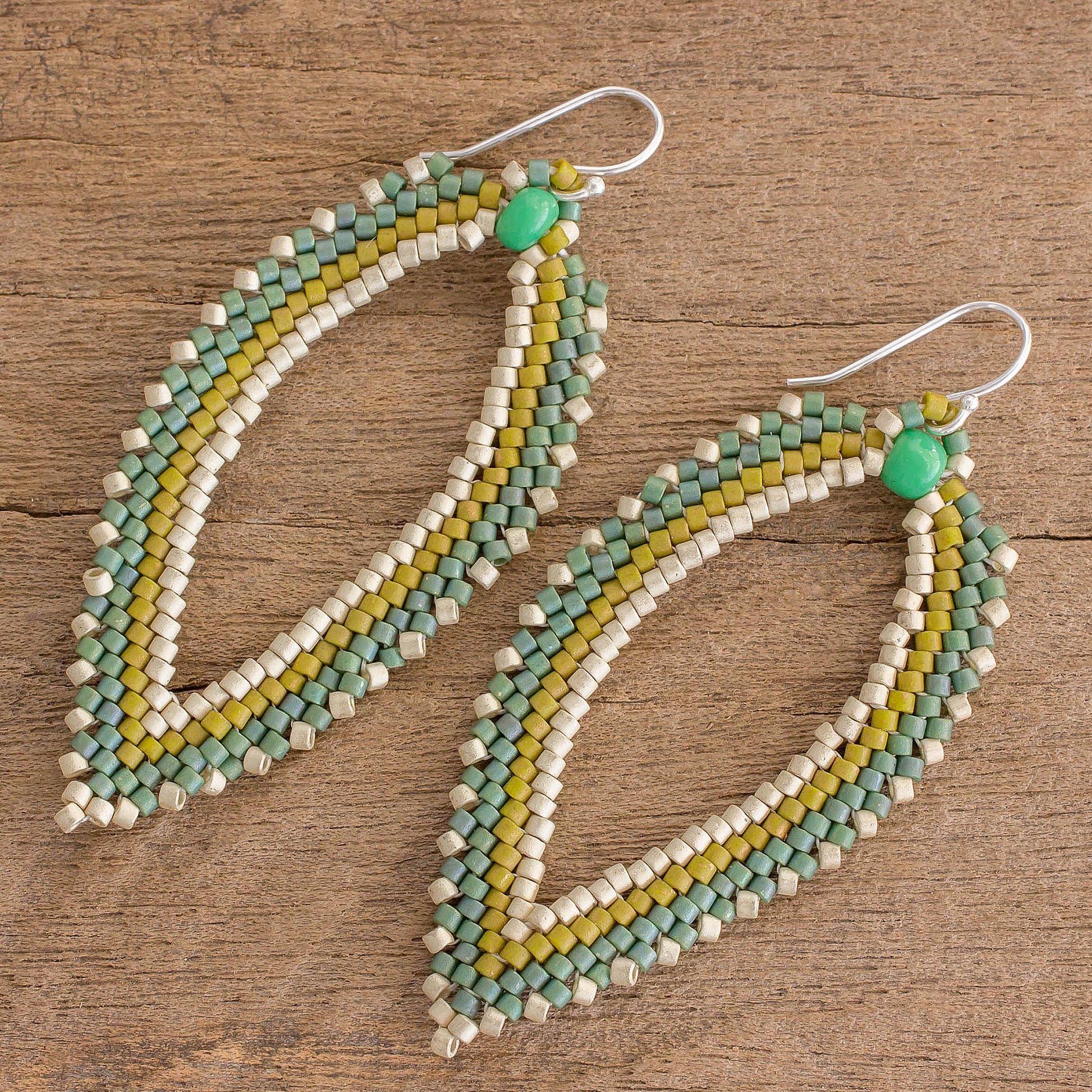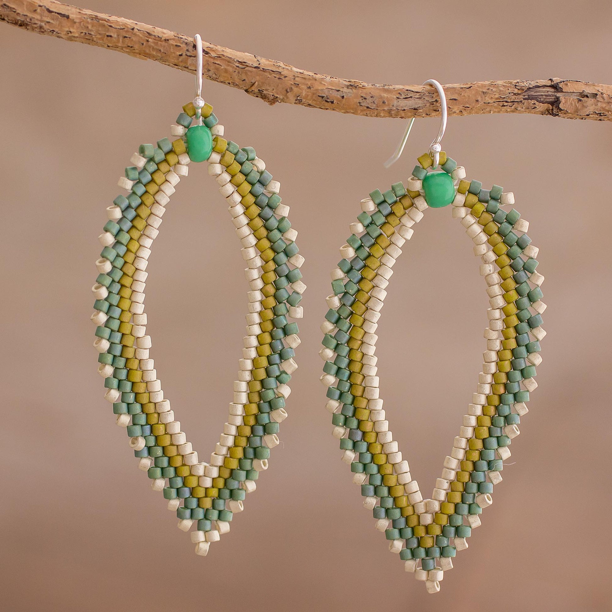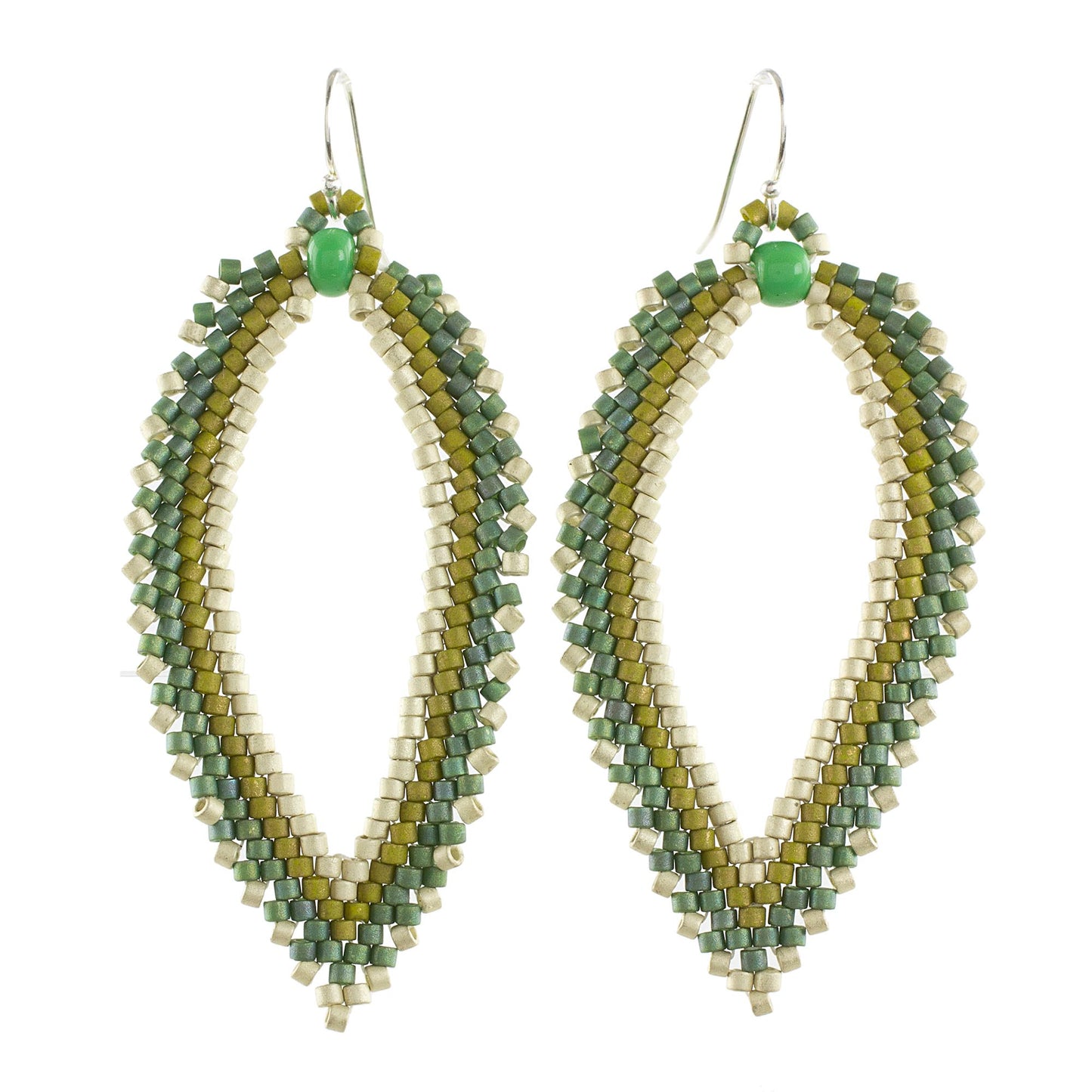 Imagine a tree spreading its leaves over a lazy river when wearing these leaf-shaped earrings. These beaded dangles feature two colors of green plus ivory and have an open center. The earrings are handcrafted by members of the Pearls of the Sea Youth Group from El Salvador, young women in a small island community.