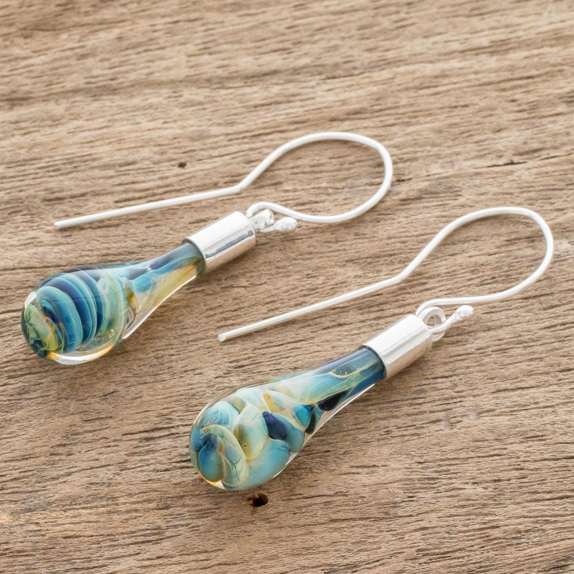 Evoking the beauty of a sandy beach, these dangle earrings are created by Guisselle Mora in Costa Rica. She hand-blows each teardrop earring from glass, detailed blue and yellow pigment. Each drop swings from sterling silver.