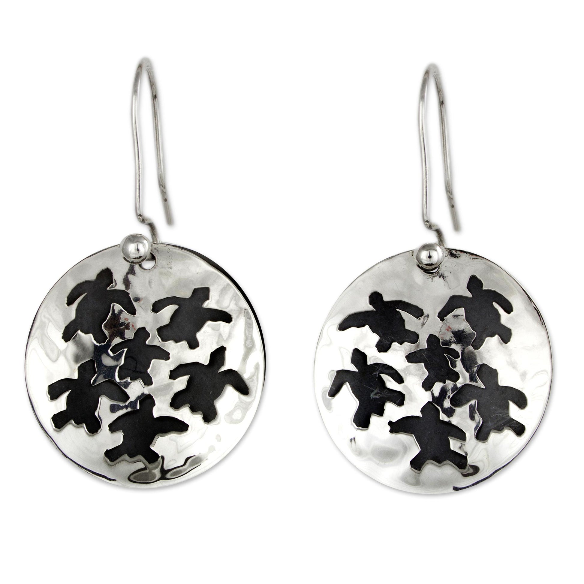 Crafted by hand, these earrings celebrate the conservation efforts in Baja California, where volunteers protect and release sea turtle hatchlings. Guillermo Arregui works in Taxco silver, depicting the babies in silhouette.
