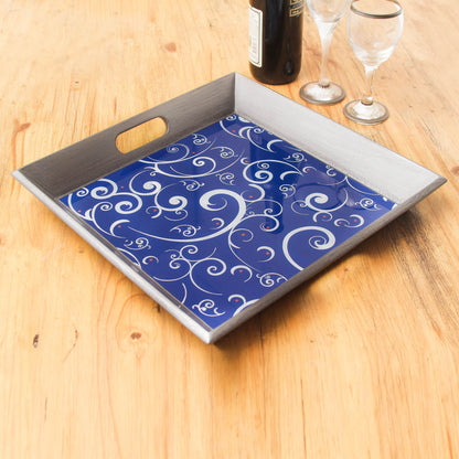 Scintillating Night Peruvian Hand Painted Glass Blue Silver Tray