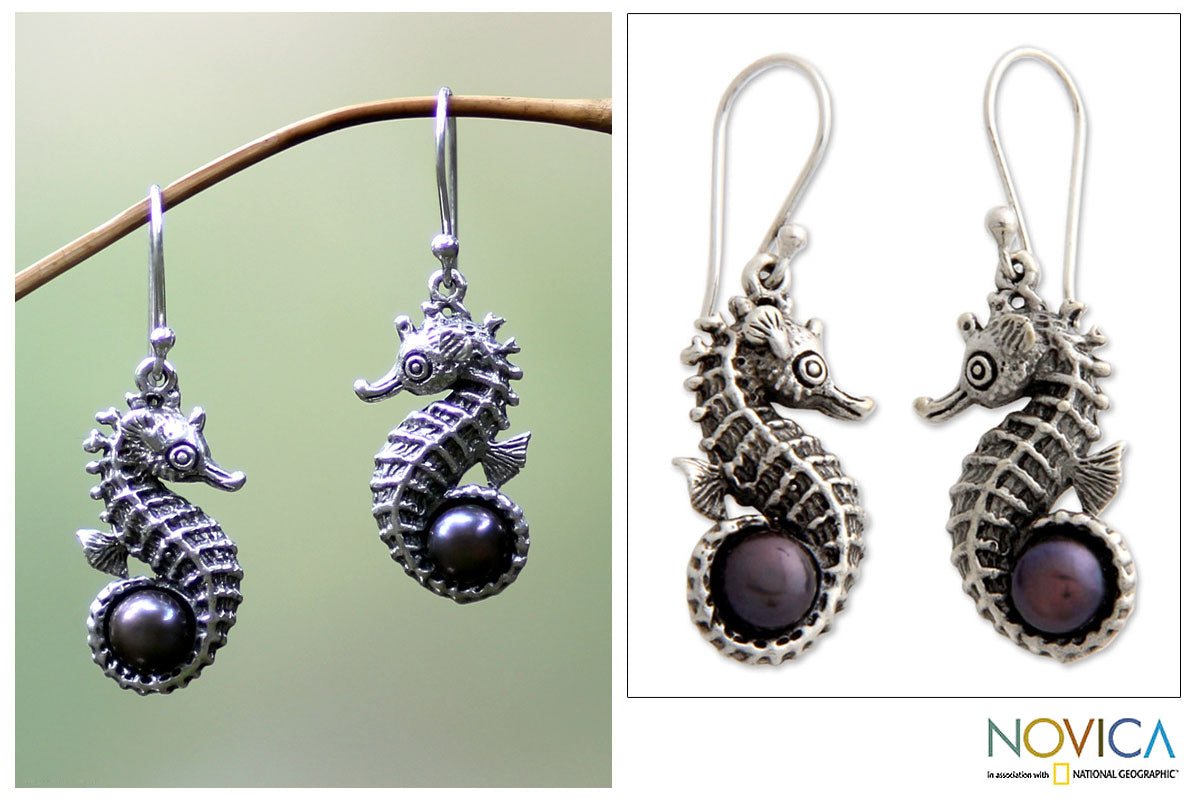 These earrings by Desi Antari celebrate Balinese sea life. Loyal seahorses in sterling silver guard dark gray pearls as legendary treasures. Crafted by hand with a black oxidized finish.
