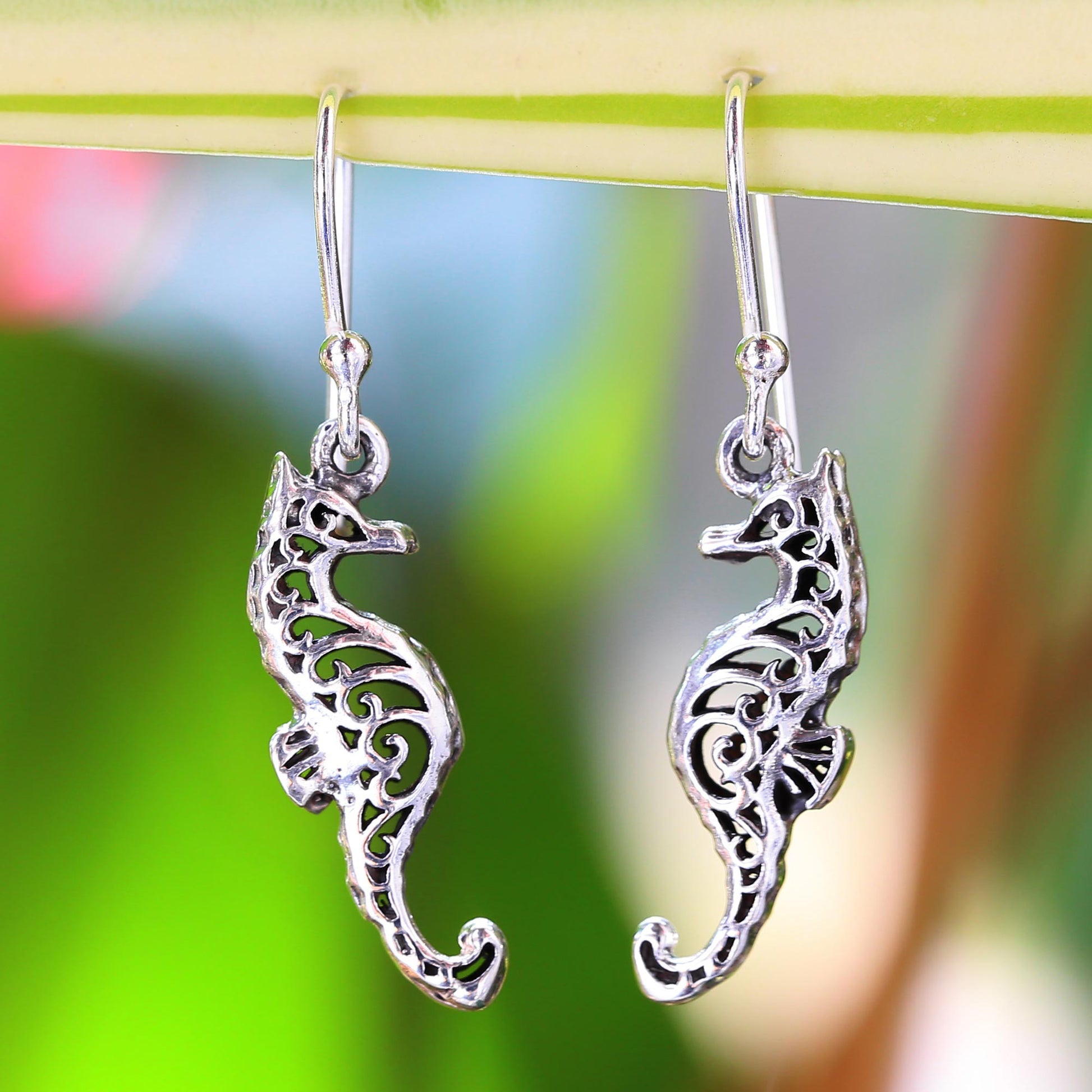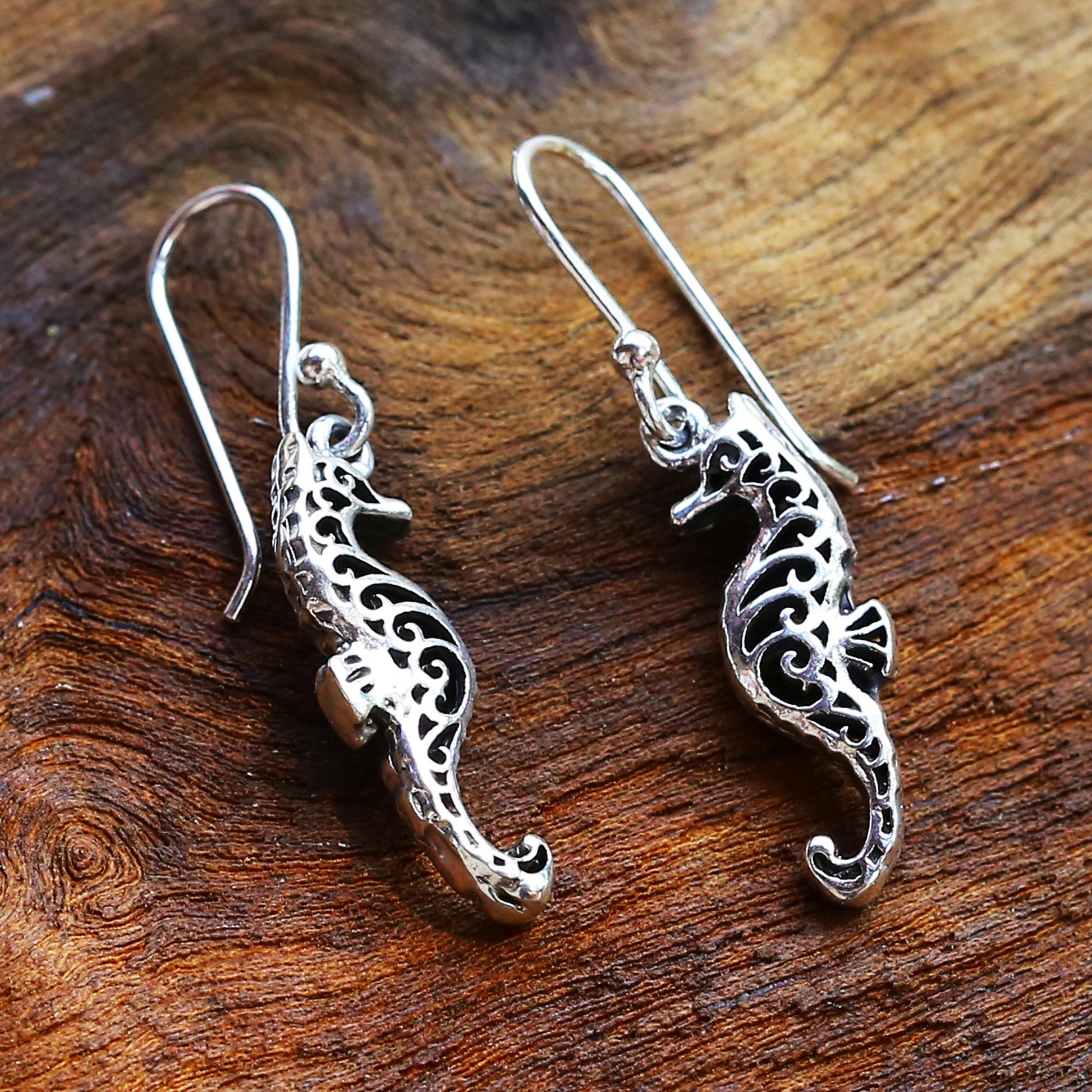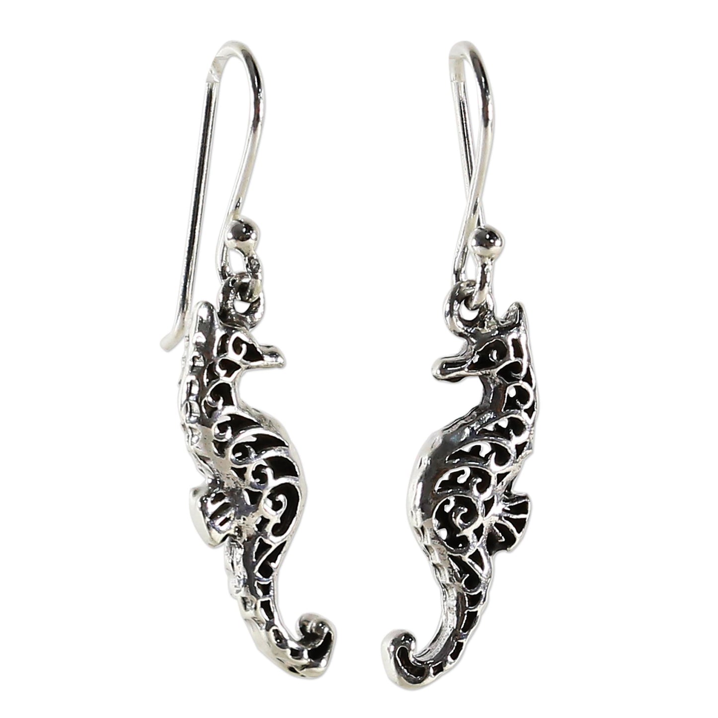 A cute seahorse couple is depicted in this pair of sterling silver dangle earrings, designed by Thailand's Wadarat Supasirisuk. She is proud to present these detailed pieces, reflecting the love she holds for her country's crafts.