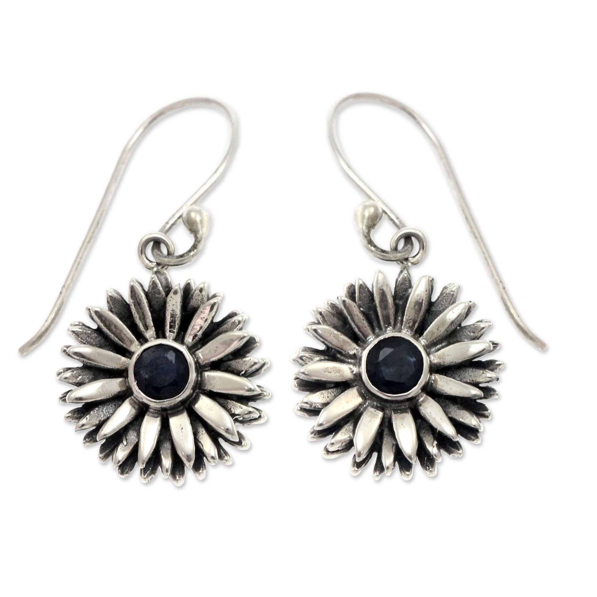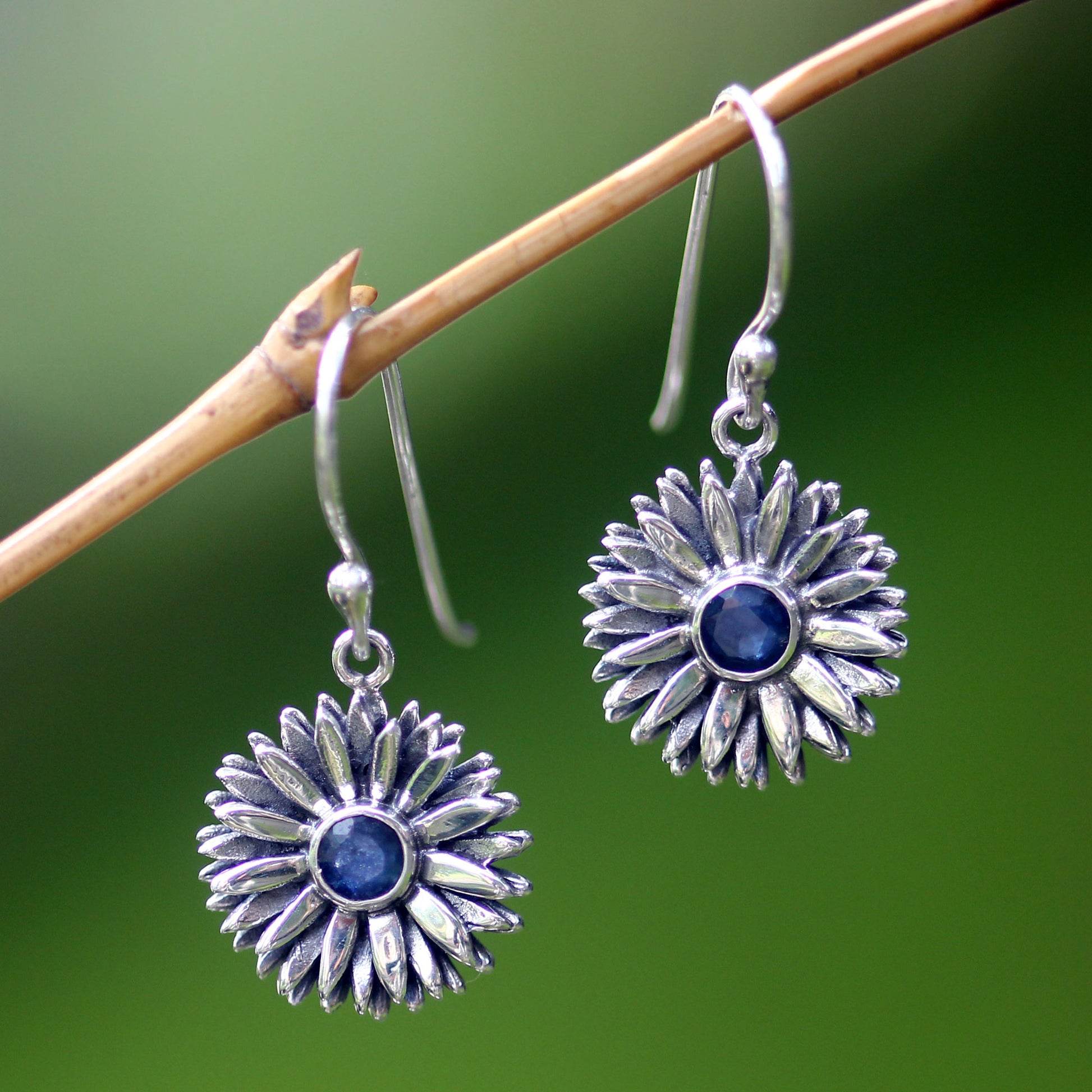 Nestled in sterling silver, faceted sapphires center these enchanting earrings. The aster is September's flower while sapphire is its birthstone. Nyoman Rena crafts the beautiful design by hand.