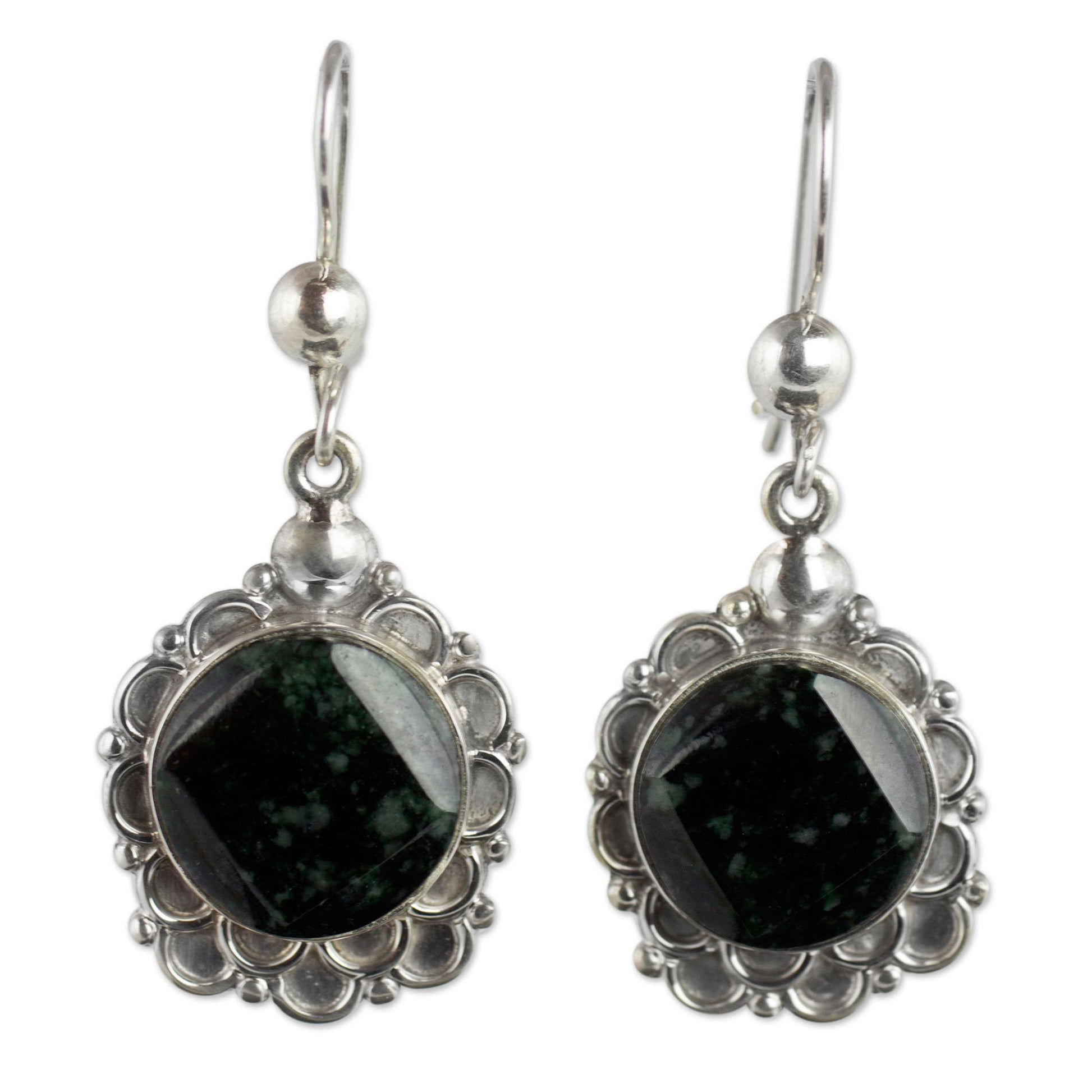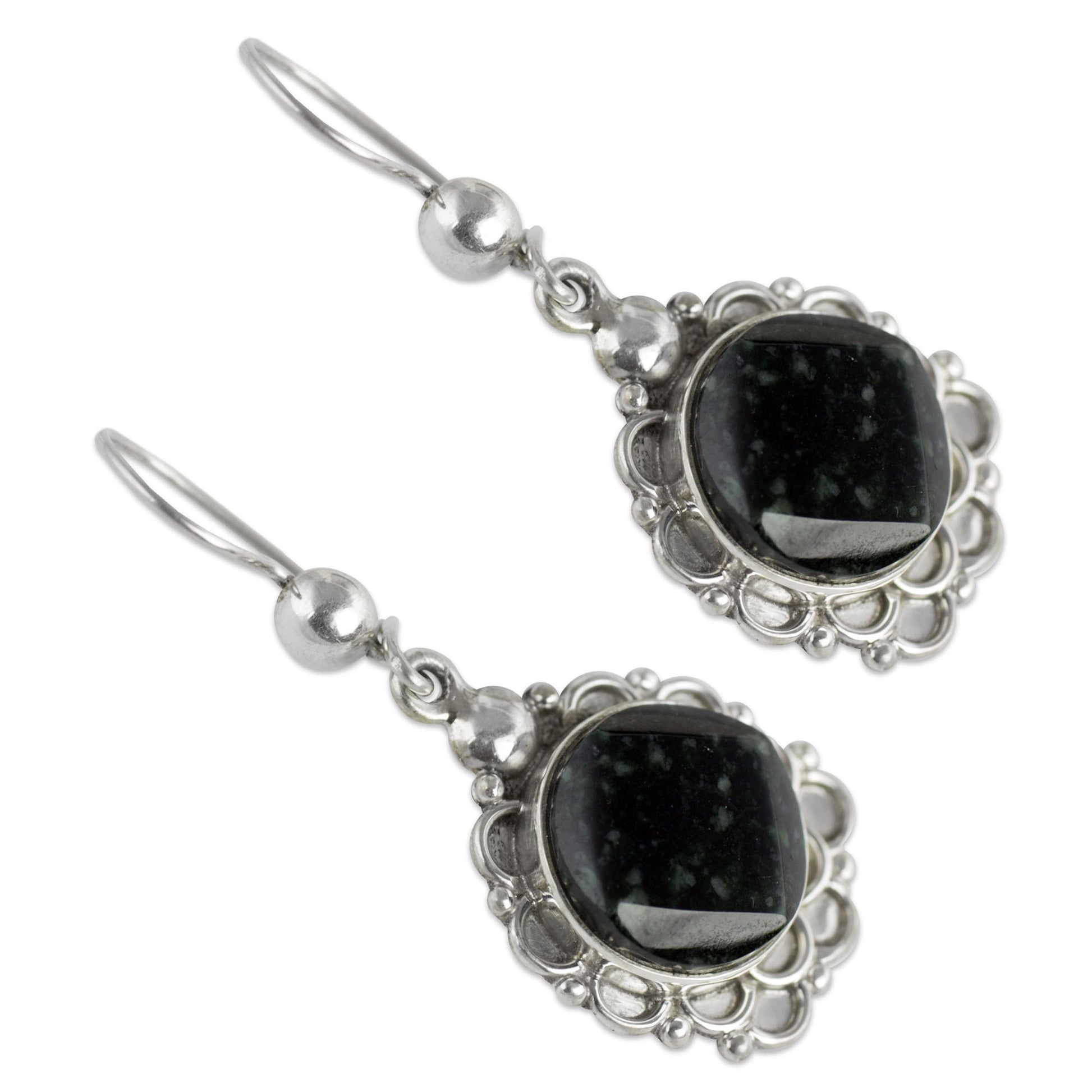 Known as ya'ax chich, Guatemalan jade adorns delightful earrings by Zandra Lorena Sajbin. A sterling blossom crowns the sleek green gem, so dark it is almost black.