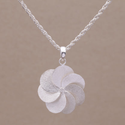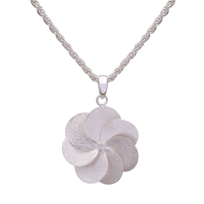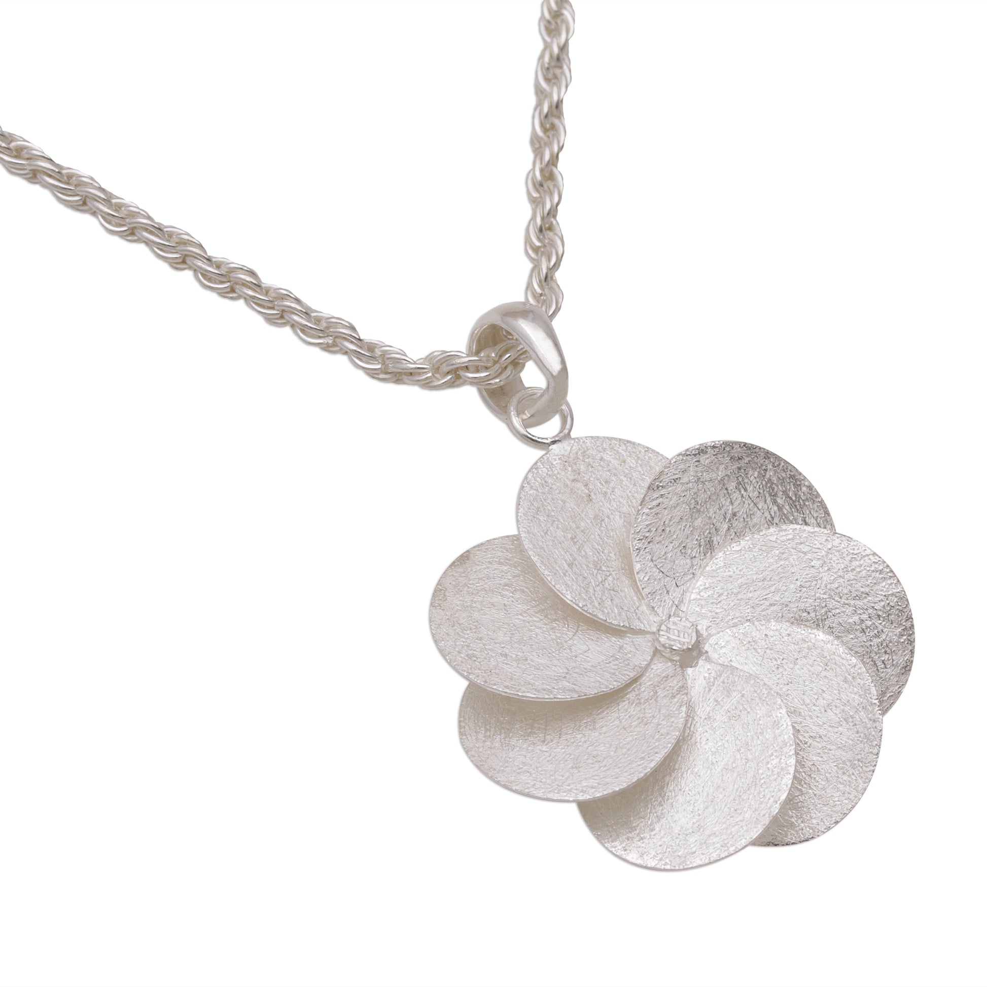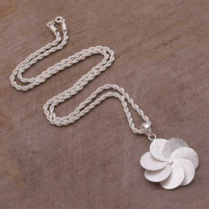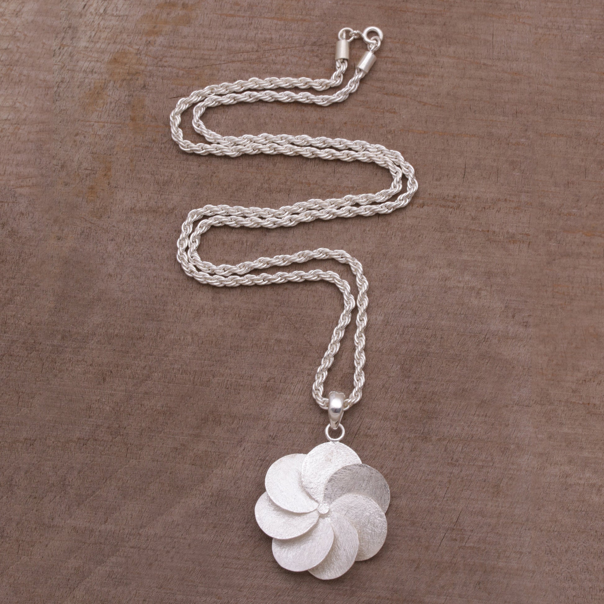 Imagine a flower or a wind catcher twirling in the breeze. Indonesian artisan Desi Antari gives the illusion of constant motion in this sterling silver windmill pendant. Suspended from a rope chain, this pendant is the perfect accessory for pulling together a look that is both refined and carefree.