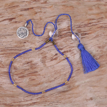 Beads of clear quartz dangle alongside a tassel and sterling silver floral charm in this bracelet by Indonesia's Ketut Sulastri. With glass beads strung on a blue nylon cord, this piece is striking and elegant.