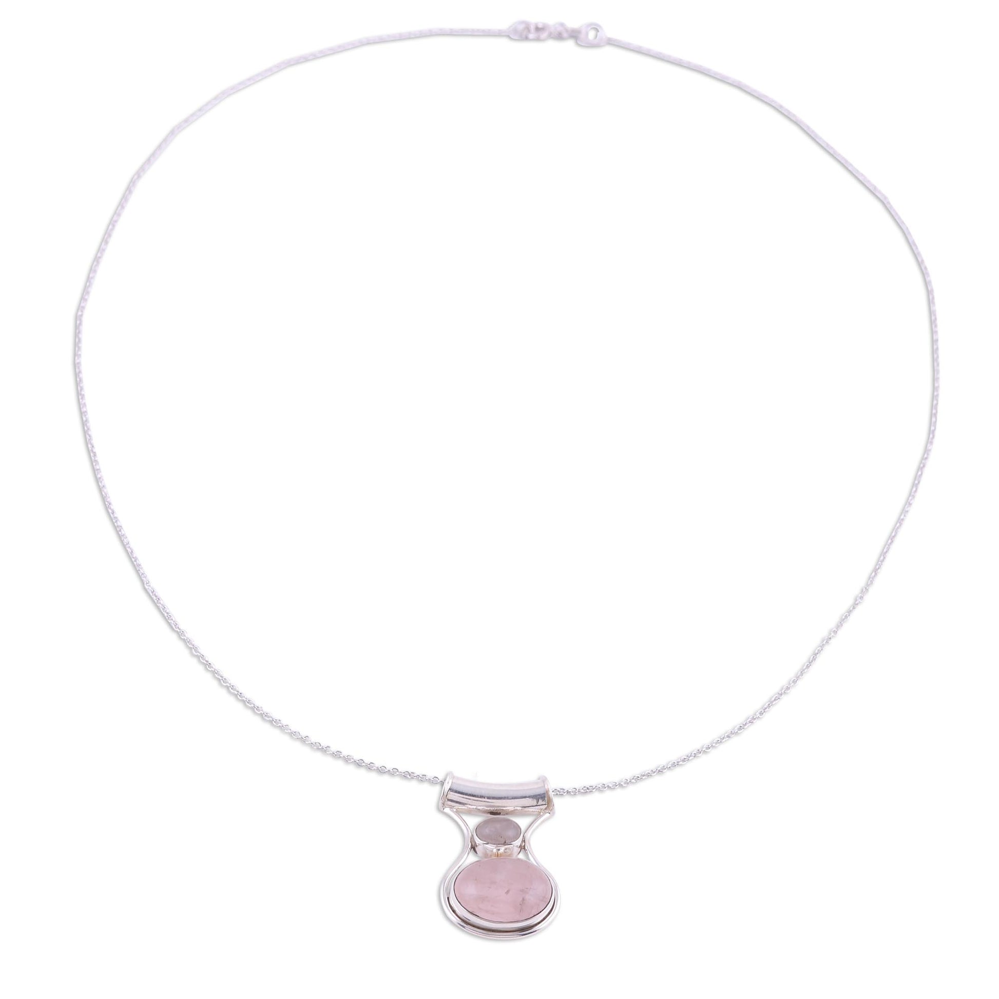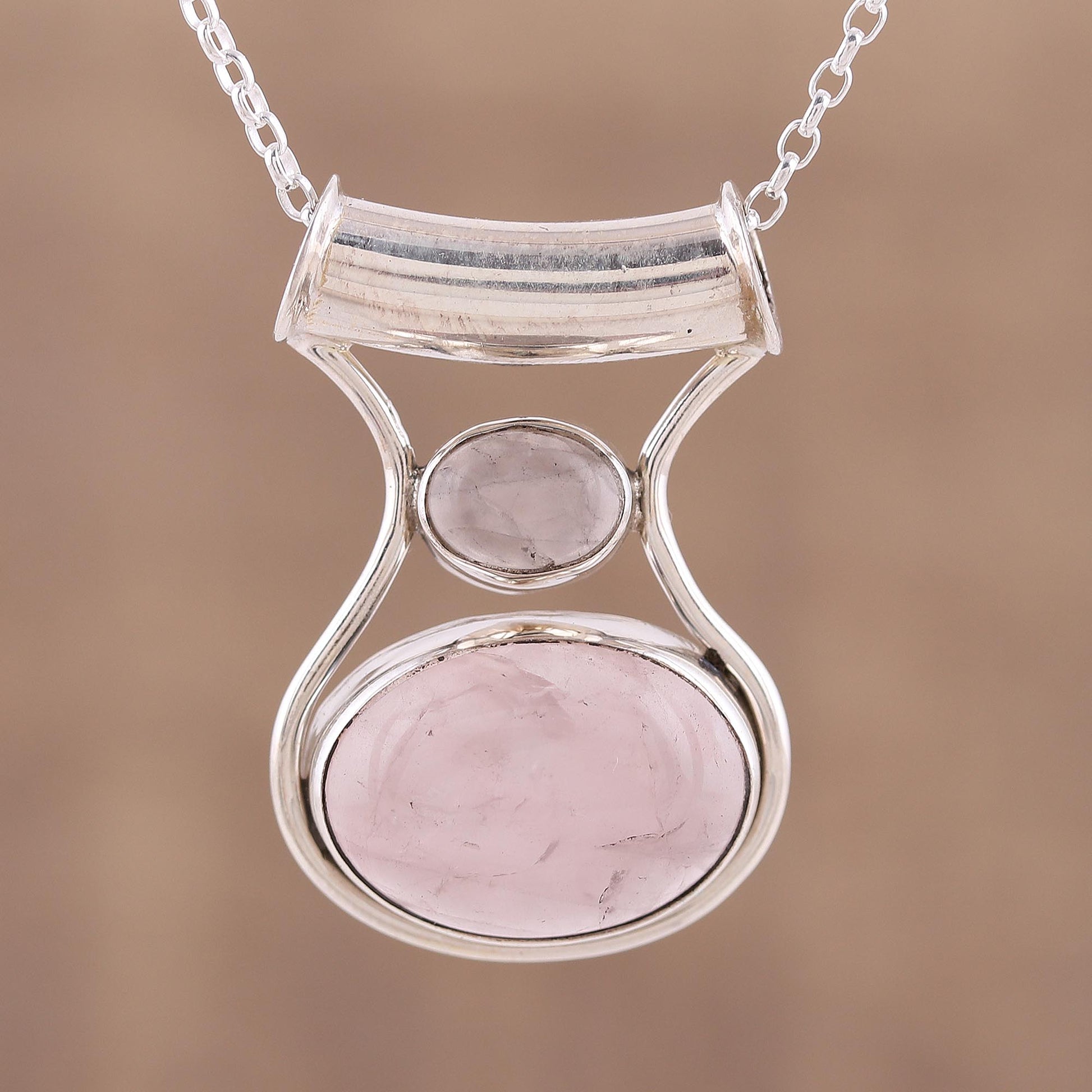 Add an elegant, contemporary accent to your look with this stunning pendant necklace from India. Alok Jain presents the beautiful accessory, which is crafted by hand by local artisans and features two delightful cabochons of rose quartz that shimmer beneath a sterling silver hollow cylindrical accent.