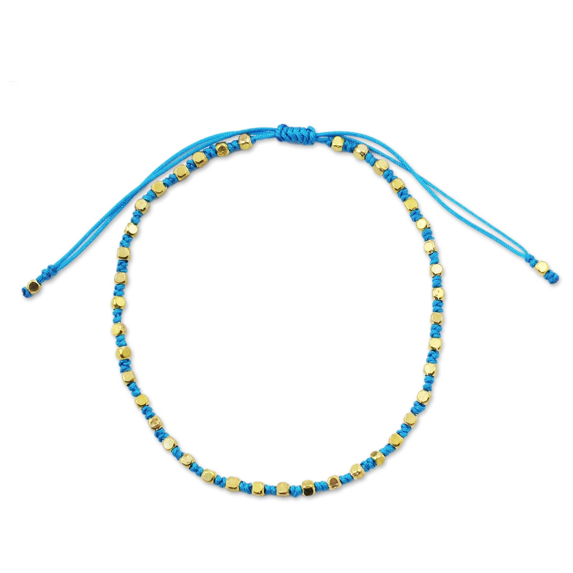 In sky blue and gold, this macramé bracelet is designed to accessorize with boho chic. Panapha crafts the bracelet by hand, masterfully knotting in 24k gold plated beads.