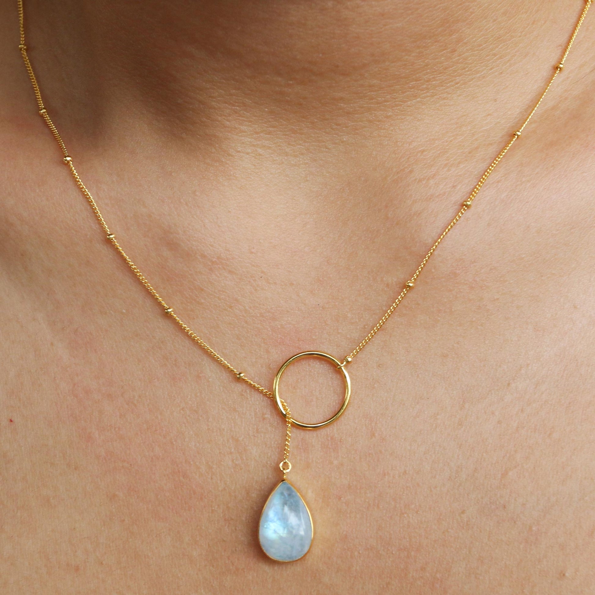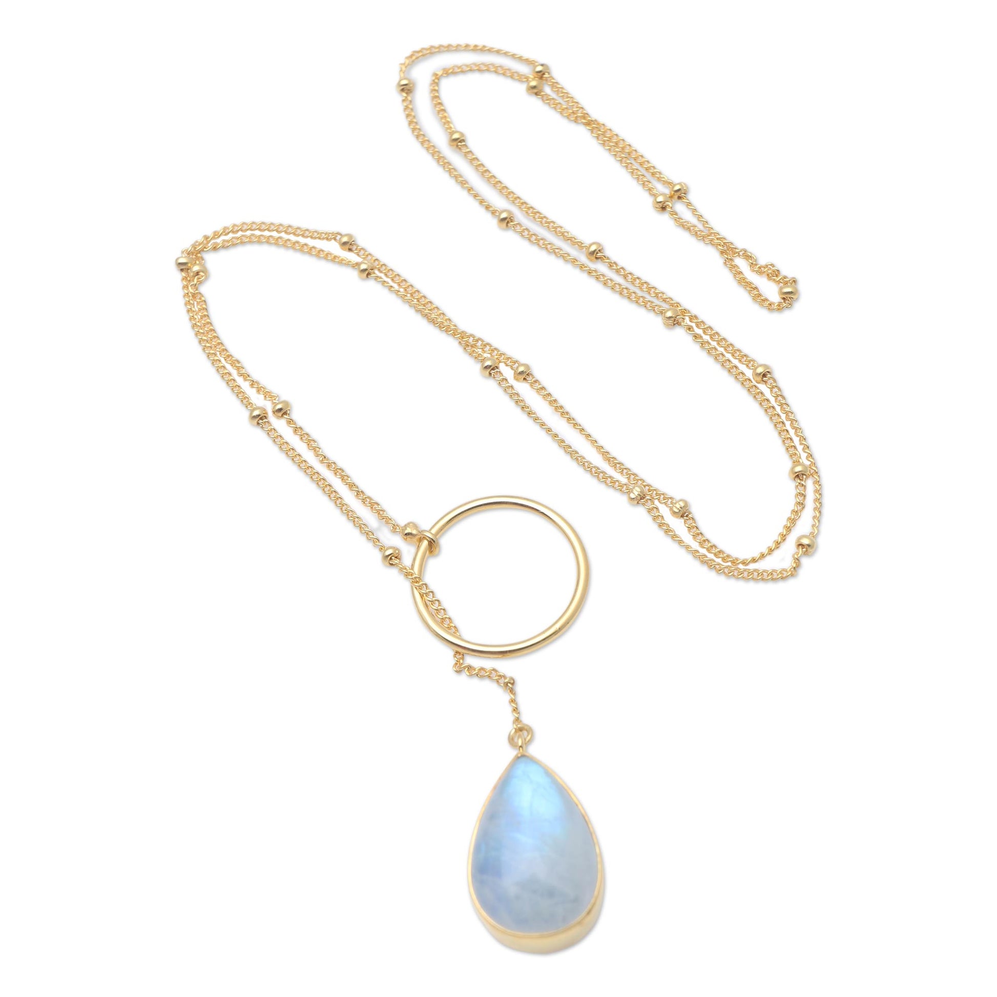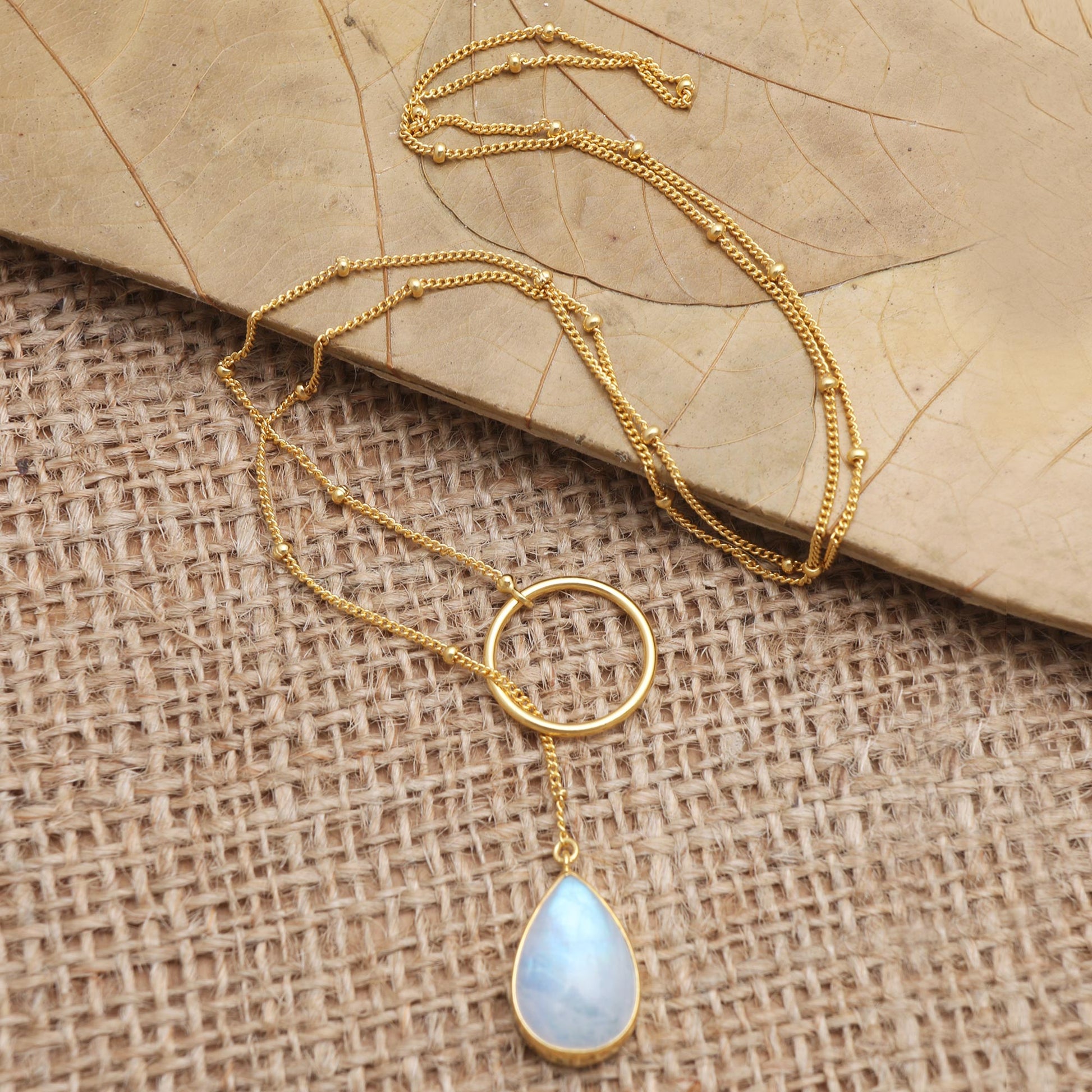 Ari Gunawan's beautiful blue and gold necklace with have you jumping for joy. The Balinese artisan uses a faceted, teardrop-shaped rainbow moonstone to center the pendant, which loops through a delicate 18k gold-plated sterling silver ring. A gold-plated sterling silver chain embellished with petite gold beads finishes the piece in style.