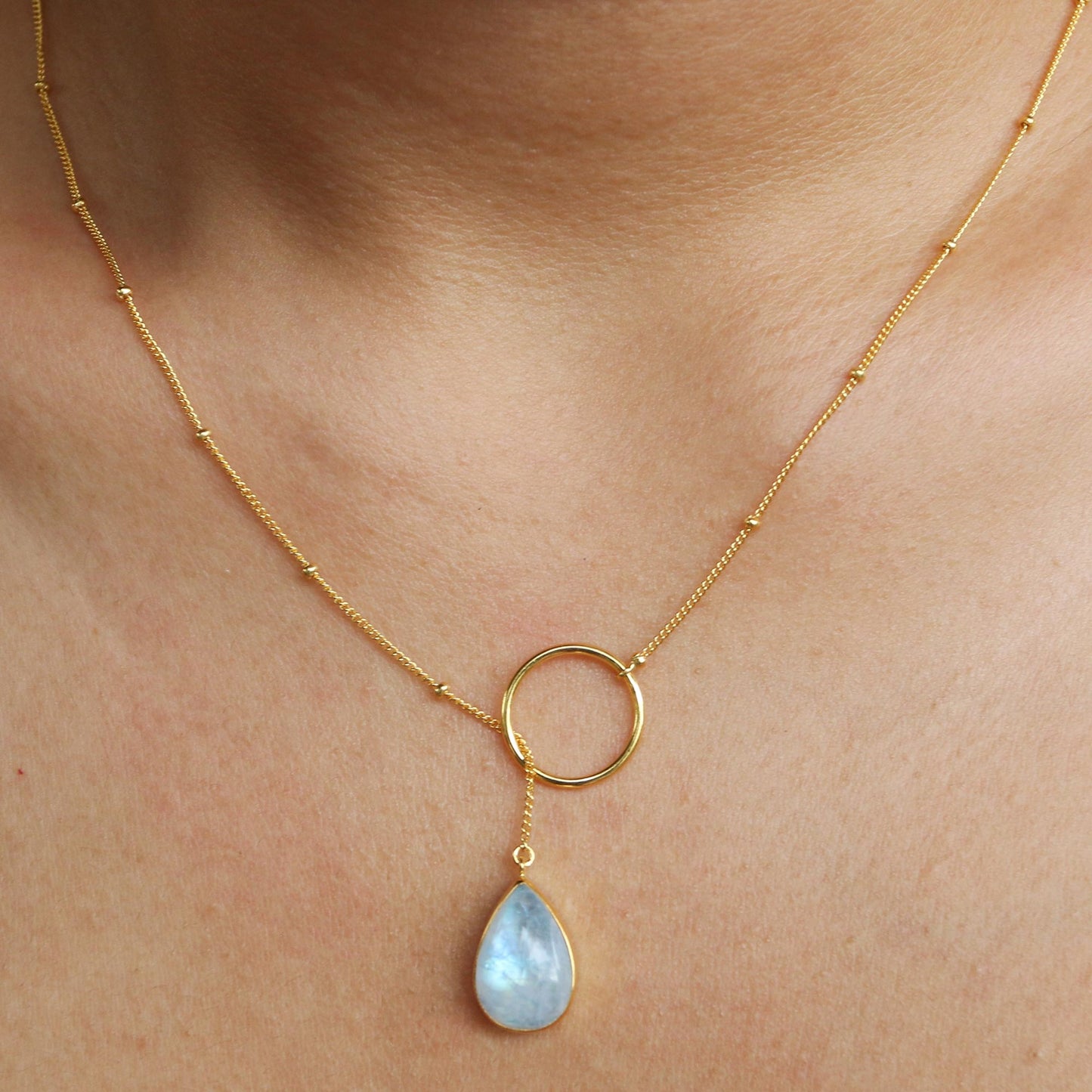 Sky Blue Teardrop Gold-Plated Rainbow Moonstone Pendant Necklace