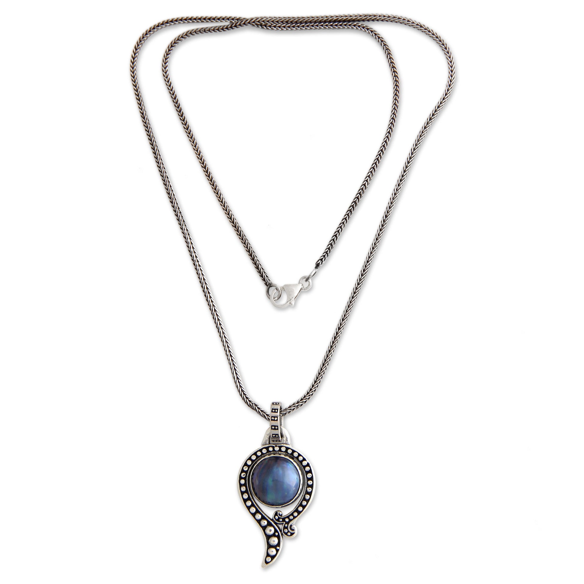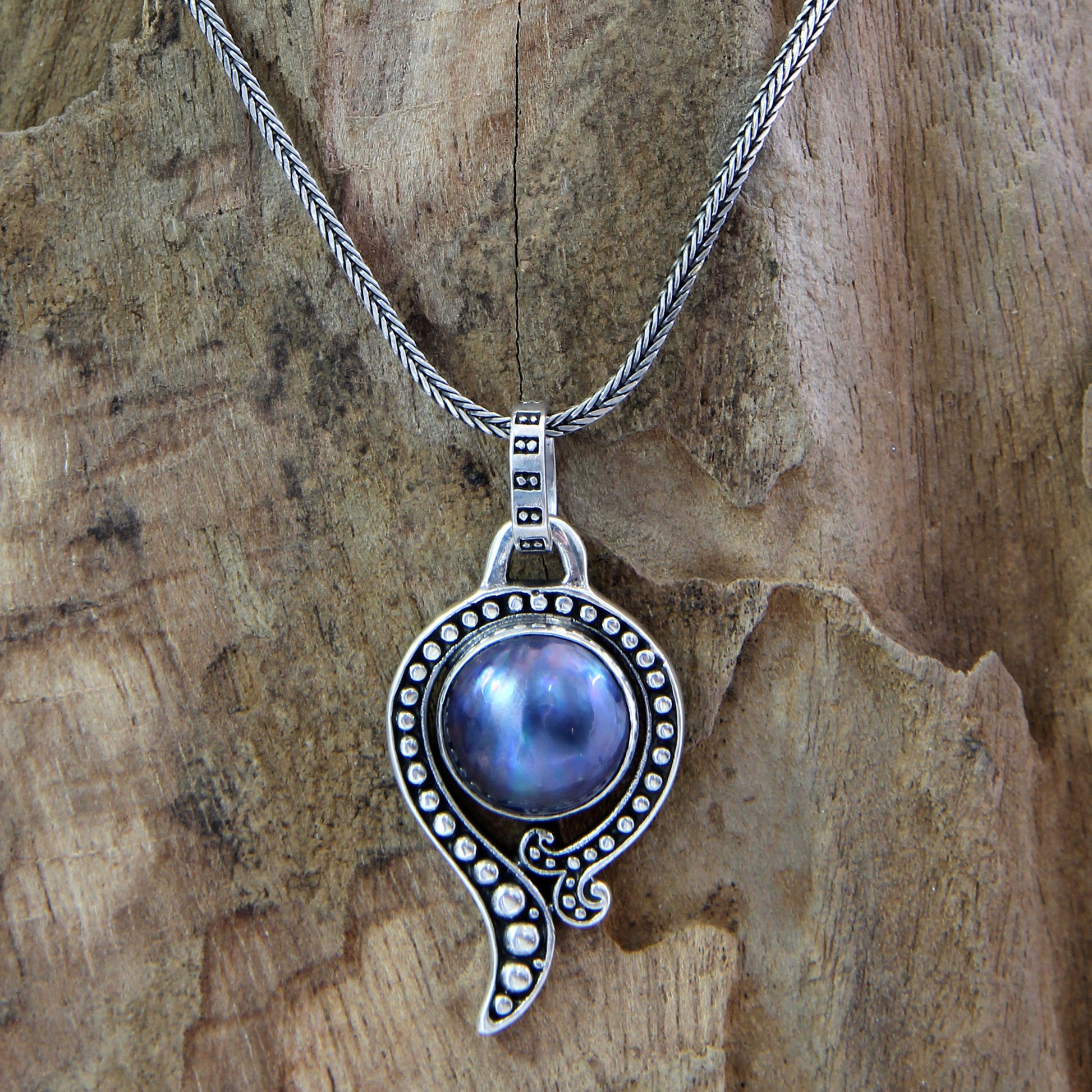 A lustrous enchanting blue pearl, June's birthstone, surrounded by exquisite sterling silver. Hand crafted by Kenari, the lovely necklace is gracefully feminine.
