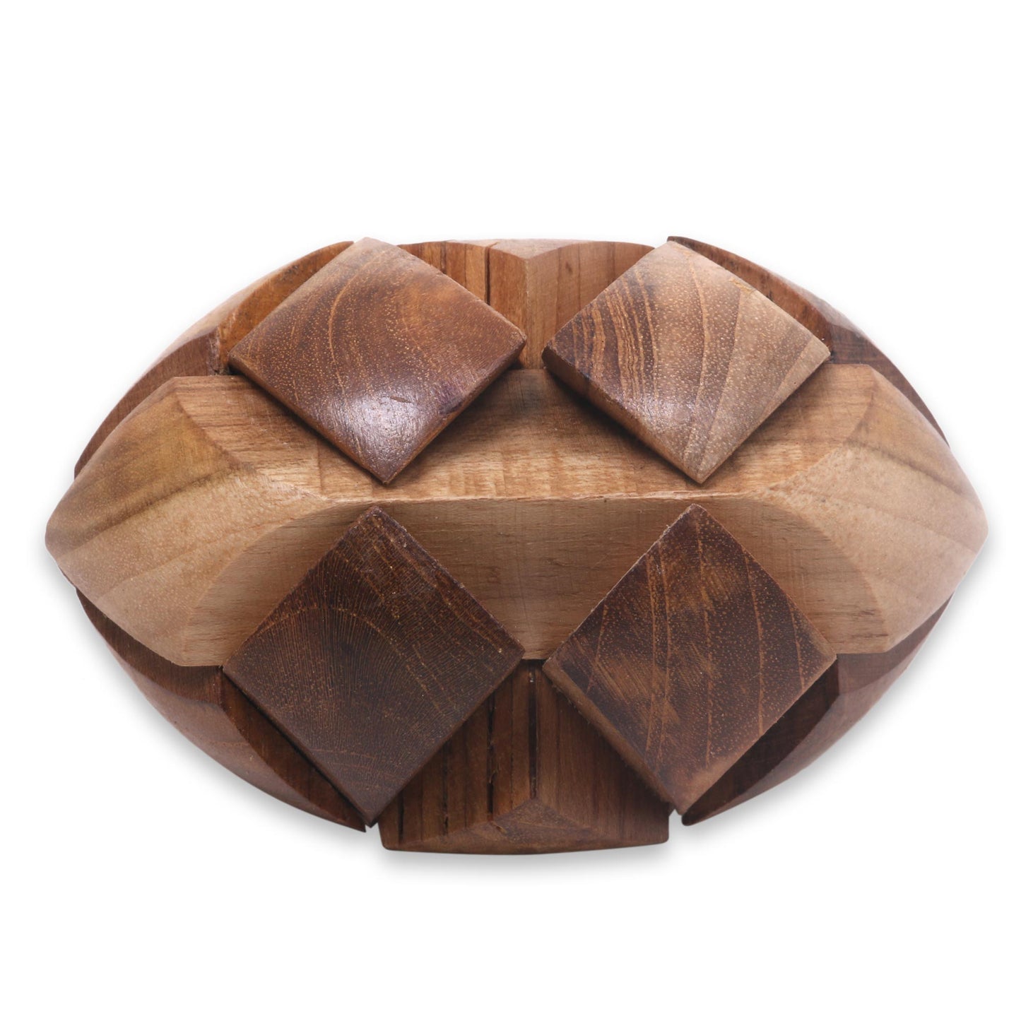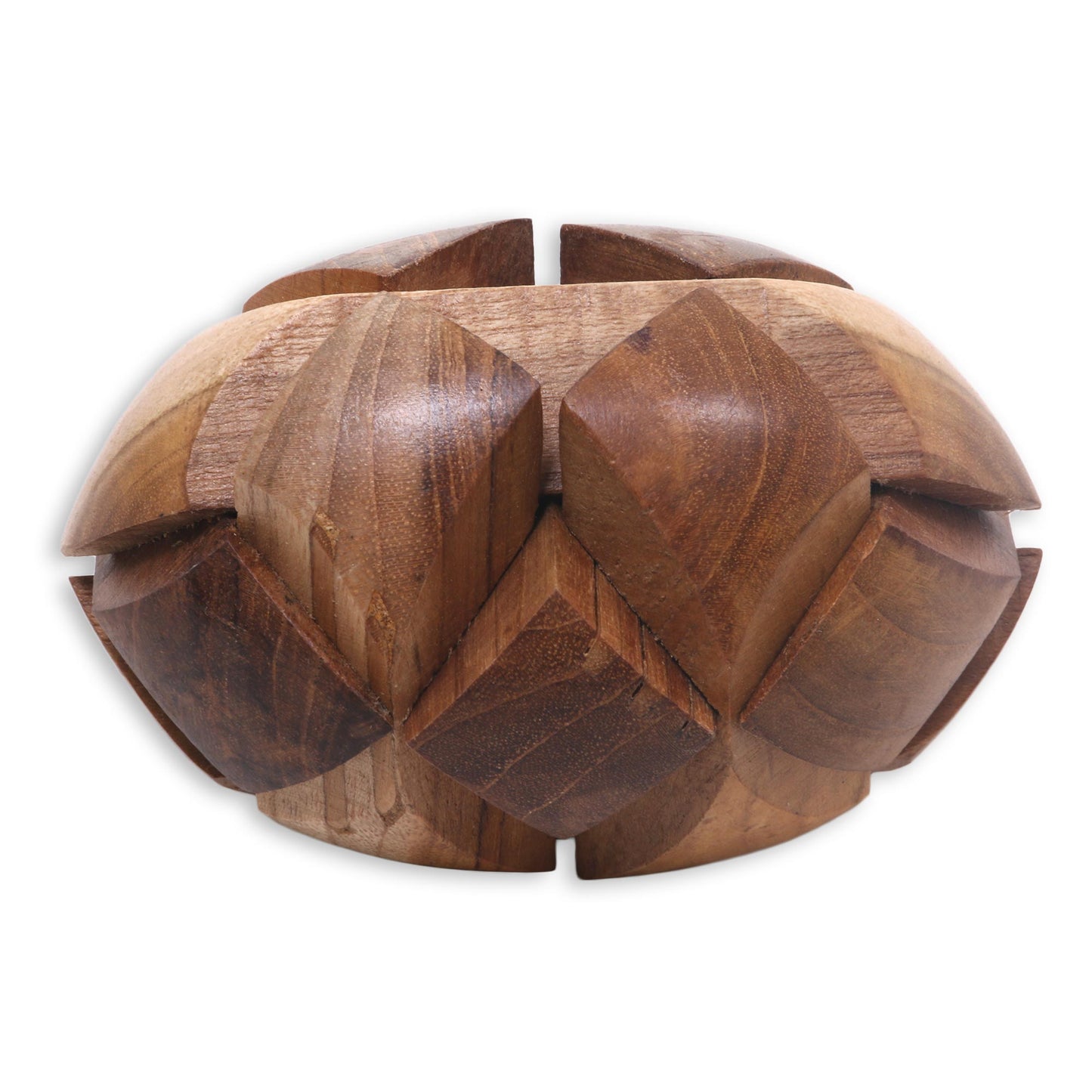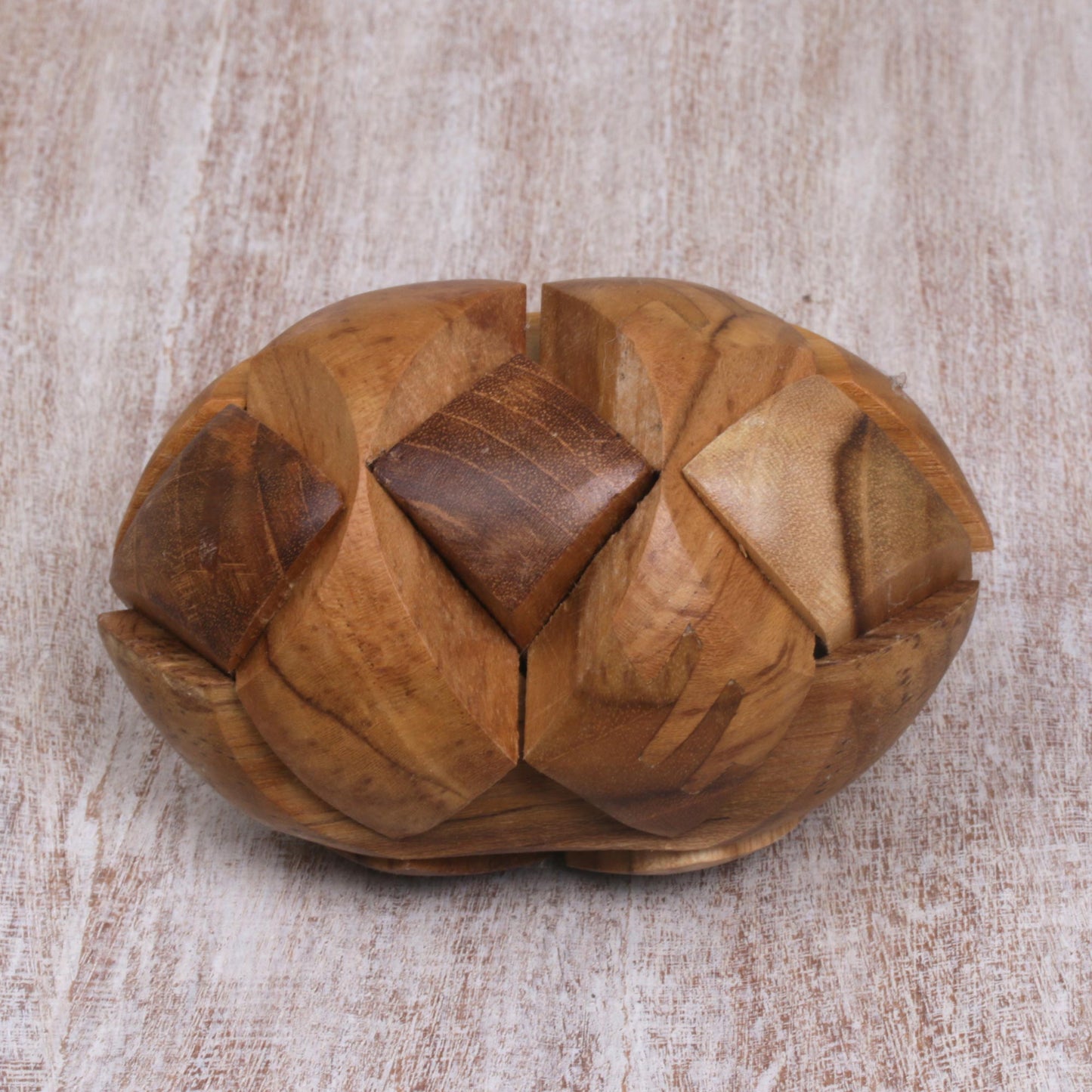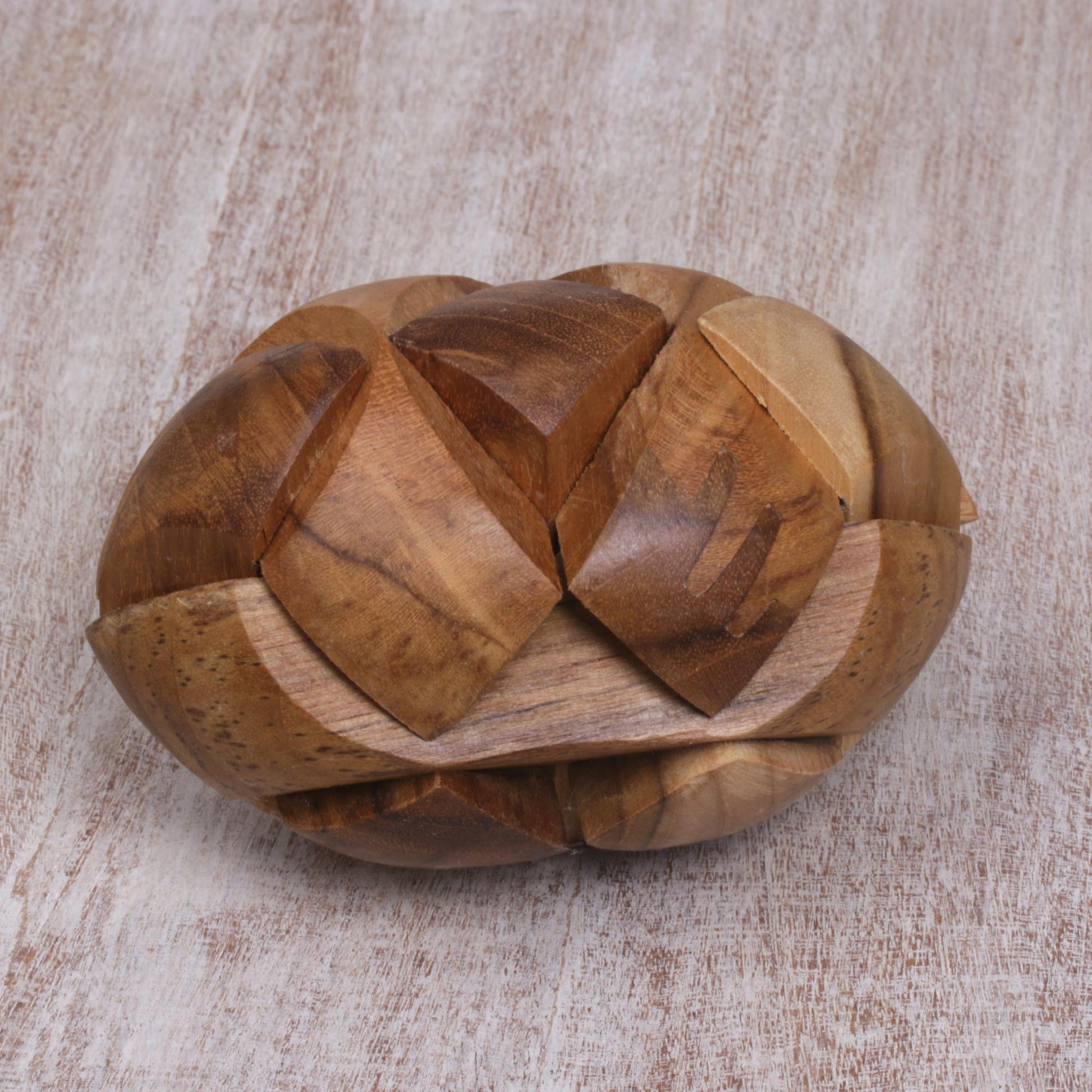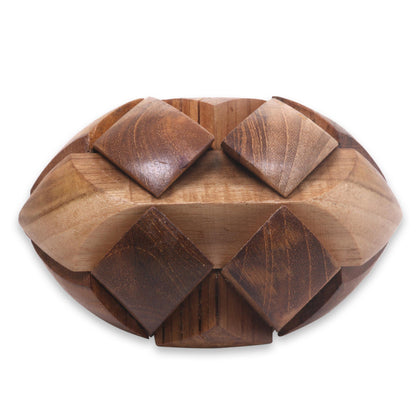 Javanese artisan Widanti challenges you to this small but formidable puzzle, carved by hand from natural teak wood. It has only one correct solution; can you find it?