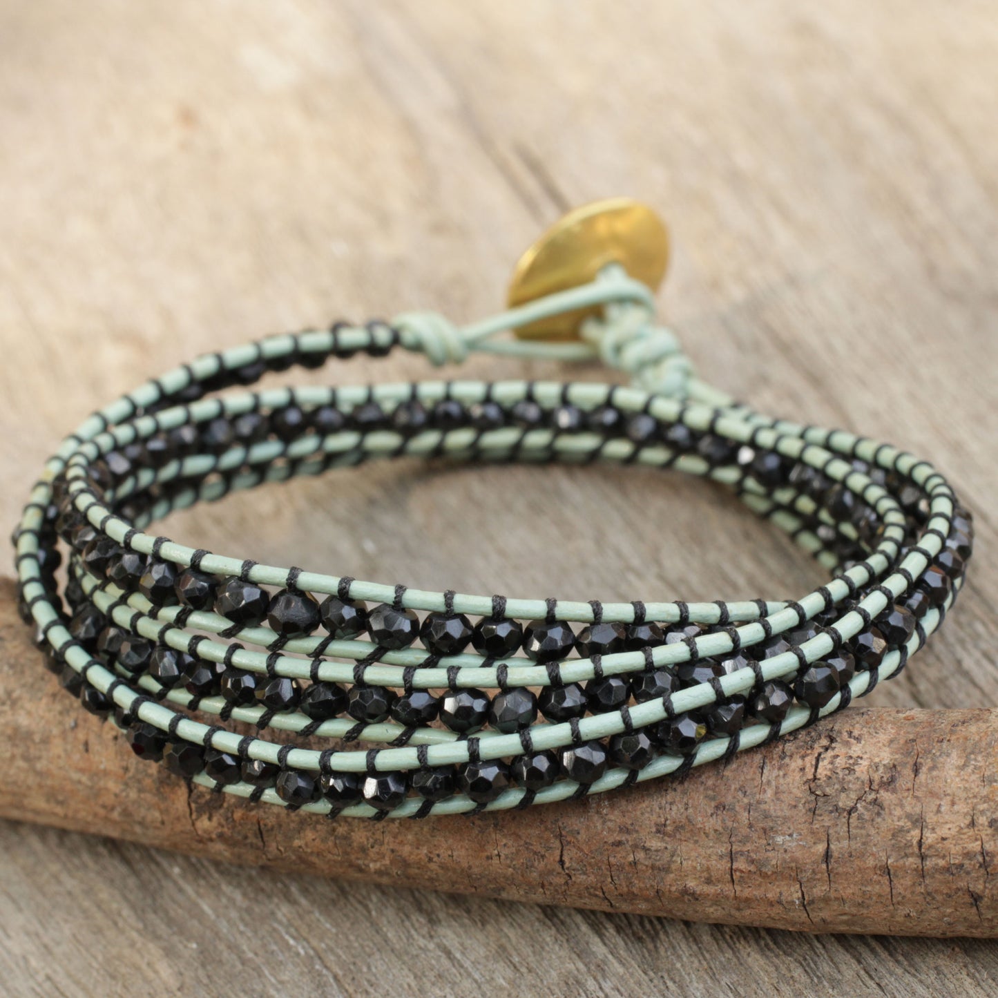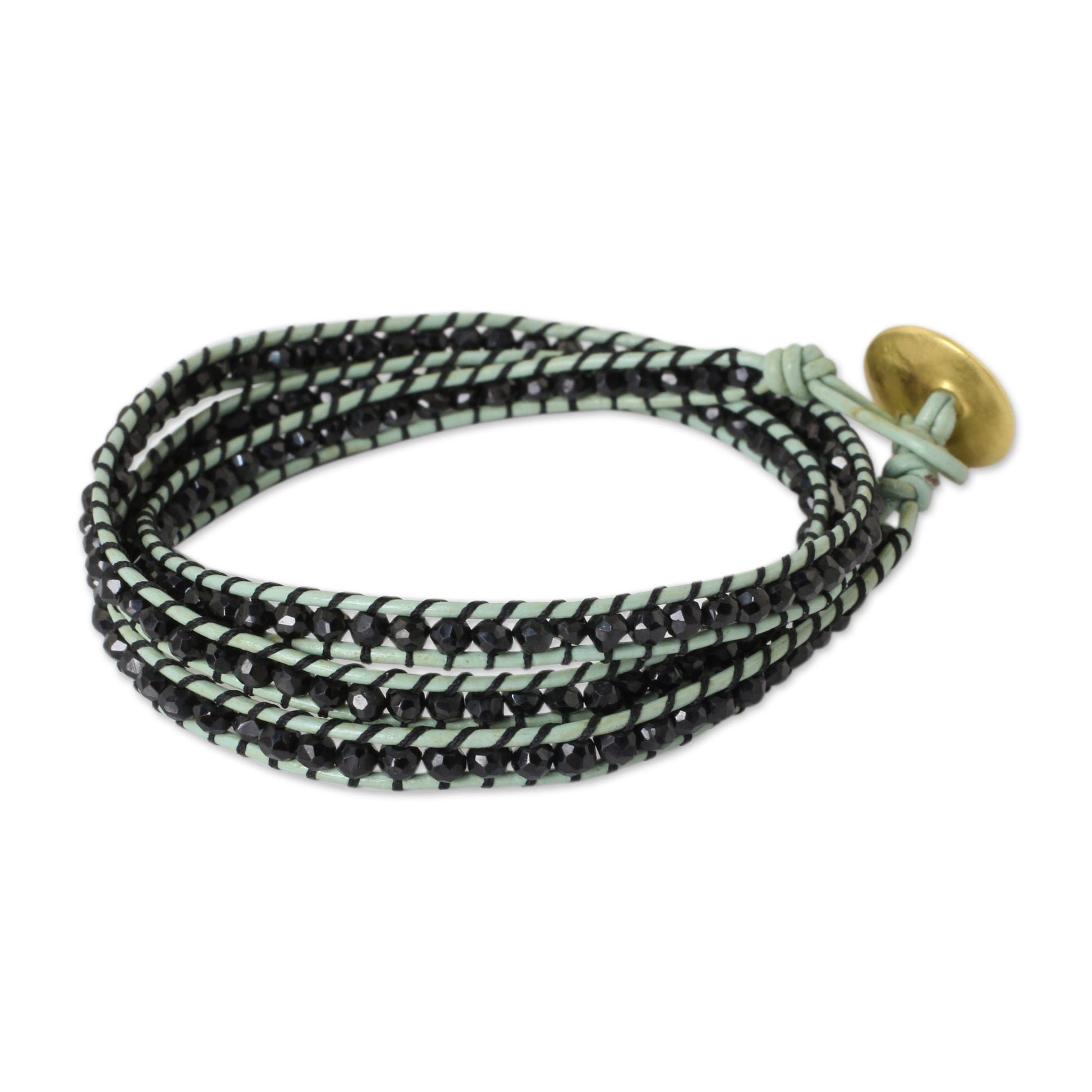 Rows of onyx cast a hypnotic spell in the design of this wrap bracelet. Panapha in Thailand crafts the leather bracelet by hand, using a 24k gold plated brass button clasp.