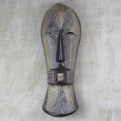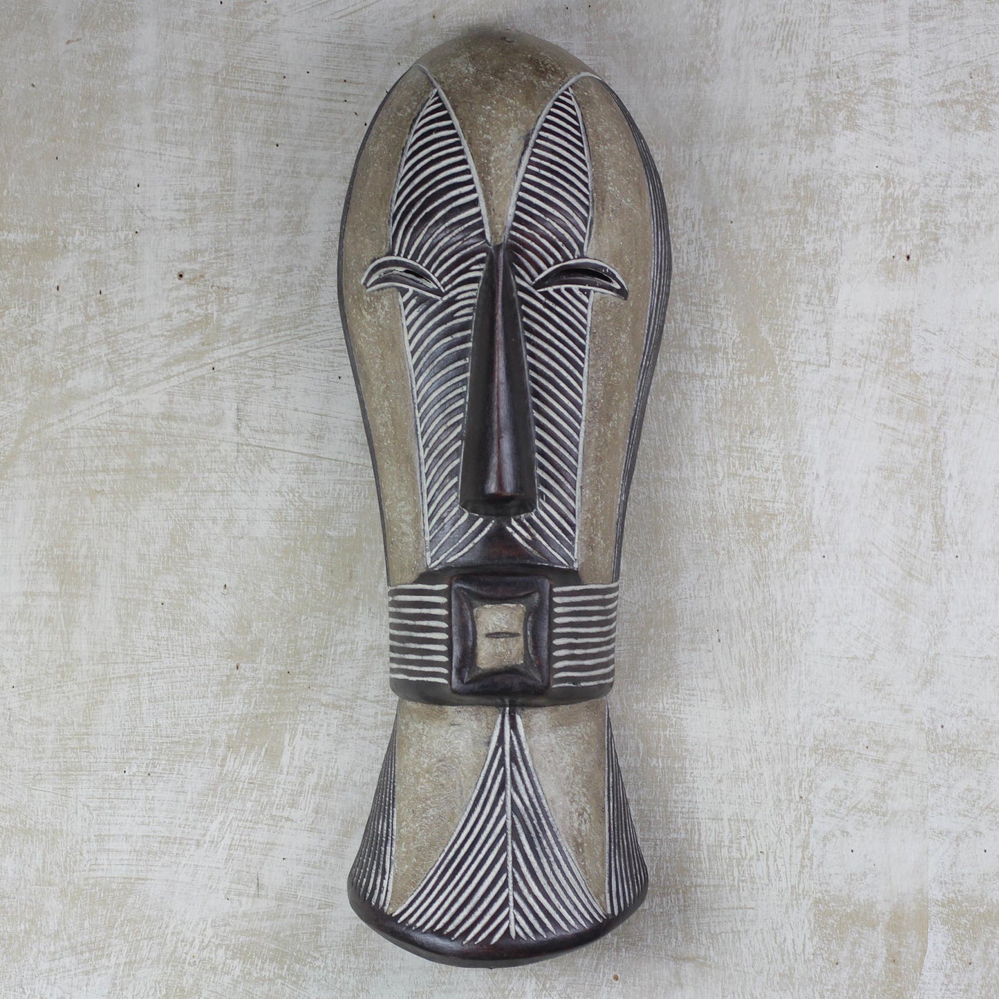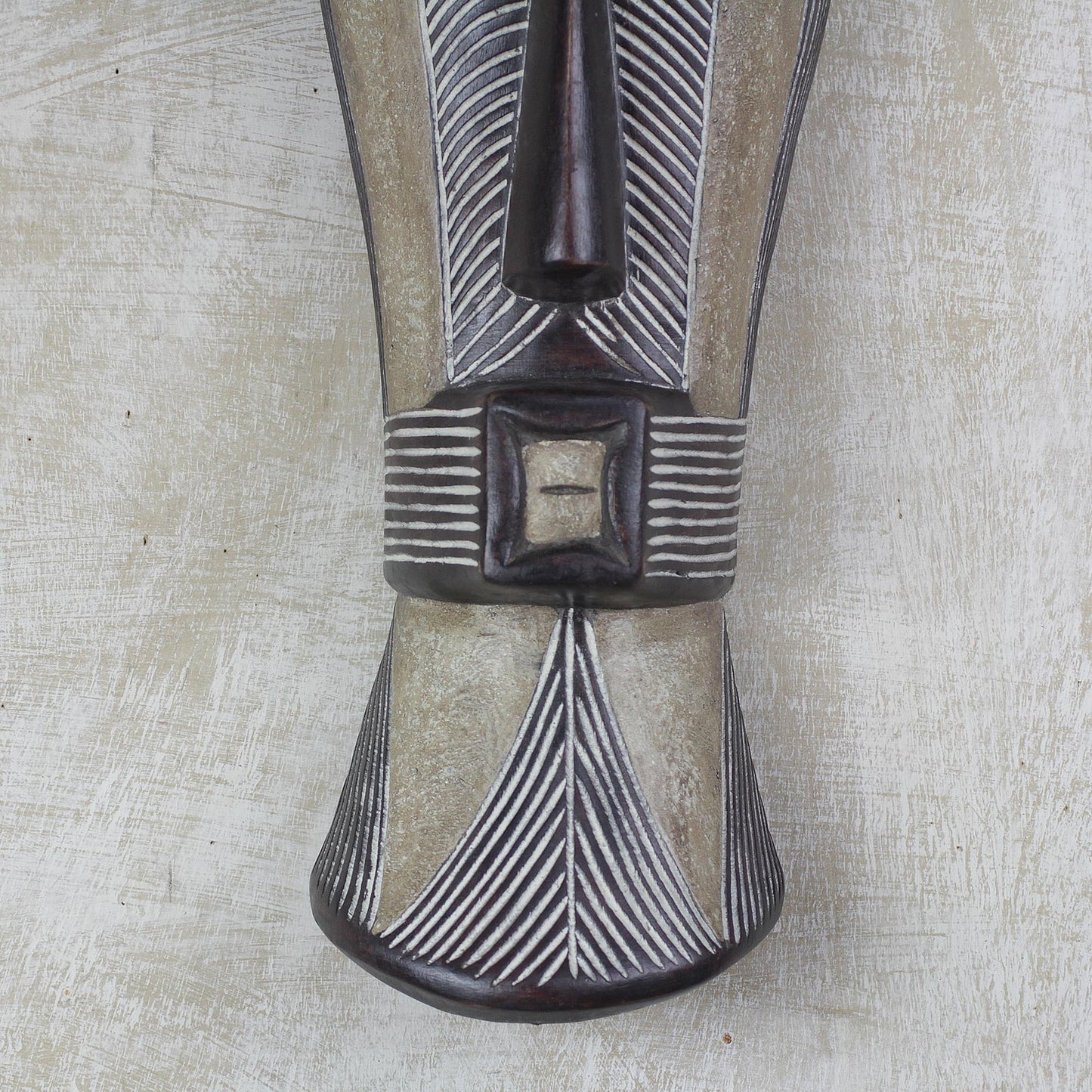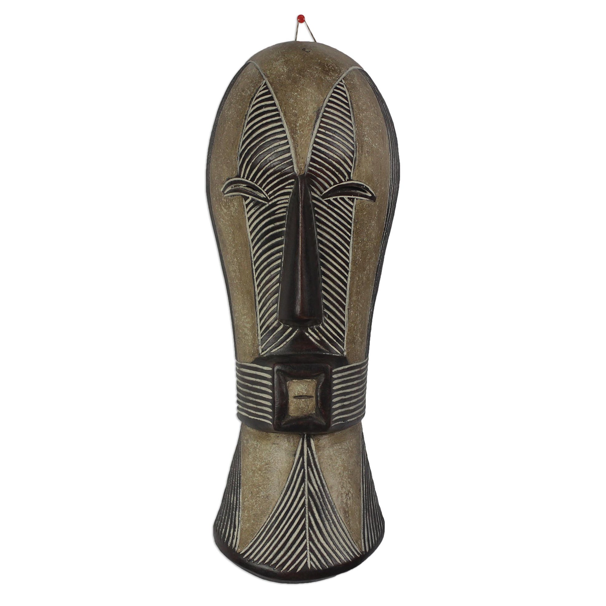 Inspired by the Songye people of central Africa, Ghanaian artisan Salihu Ibrahim hand-carves this beautiful sese wood African mask. It depicts a woman's shape with a stoic expression. The Songye people are world renowned for their wood carving skills.