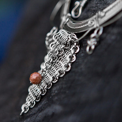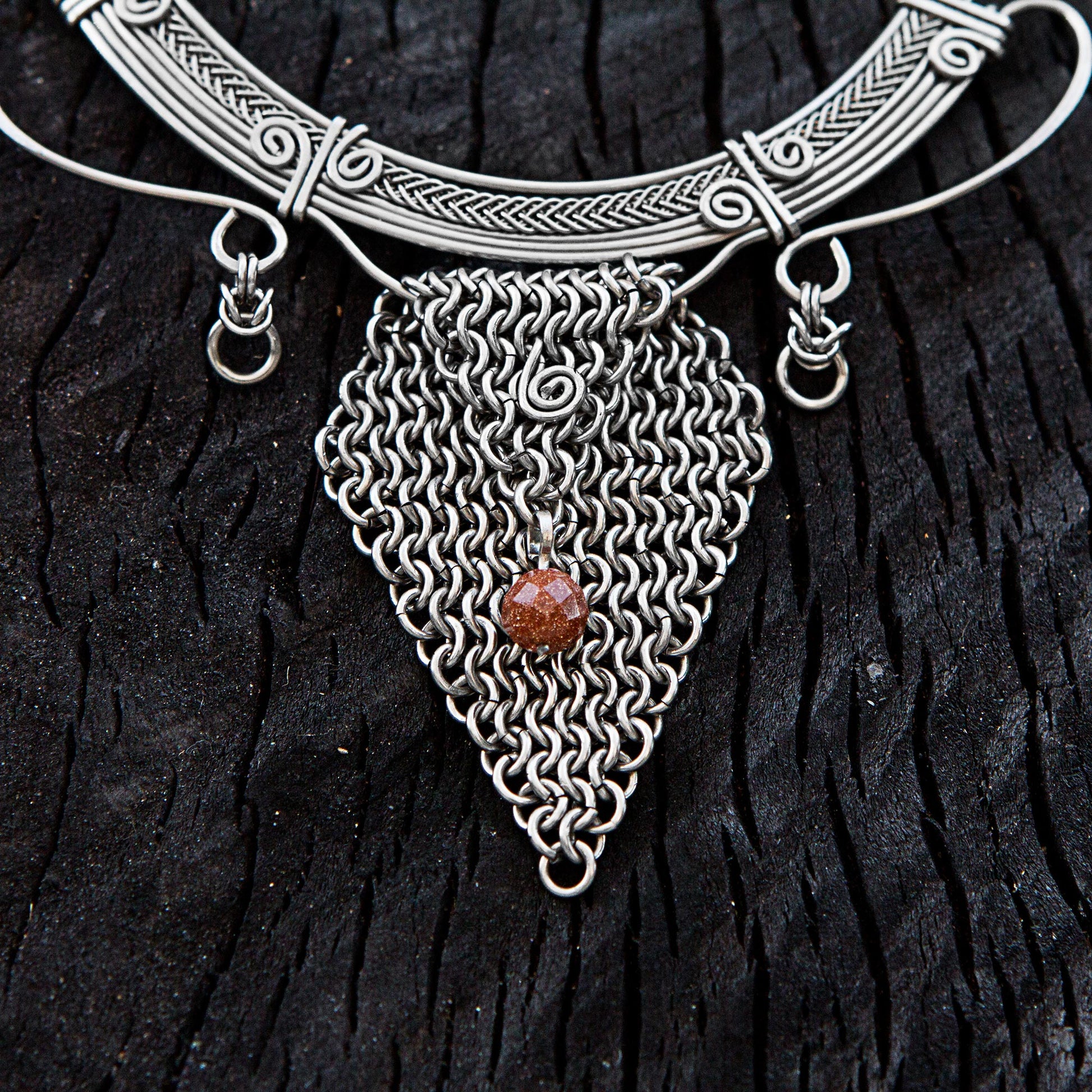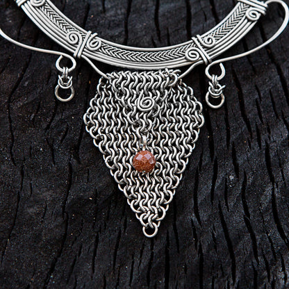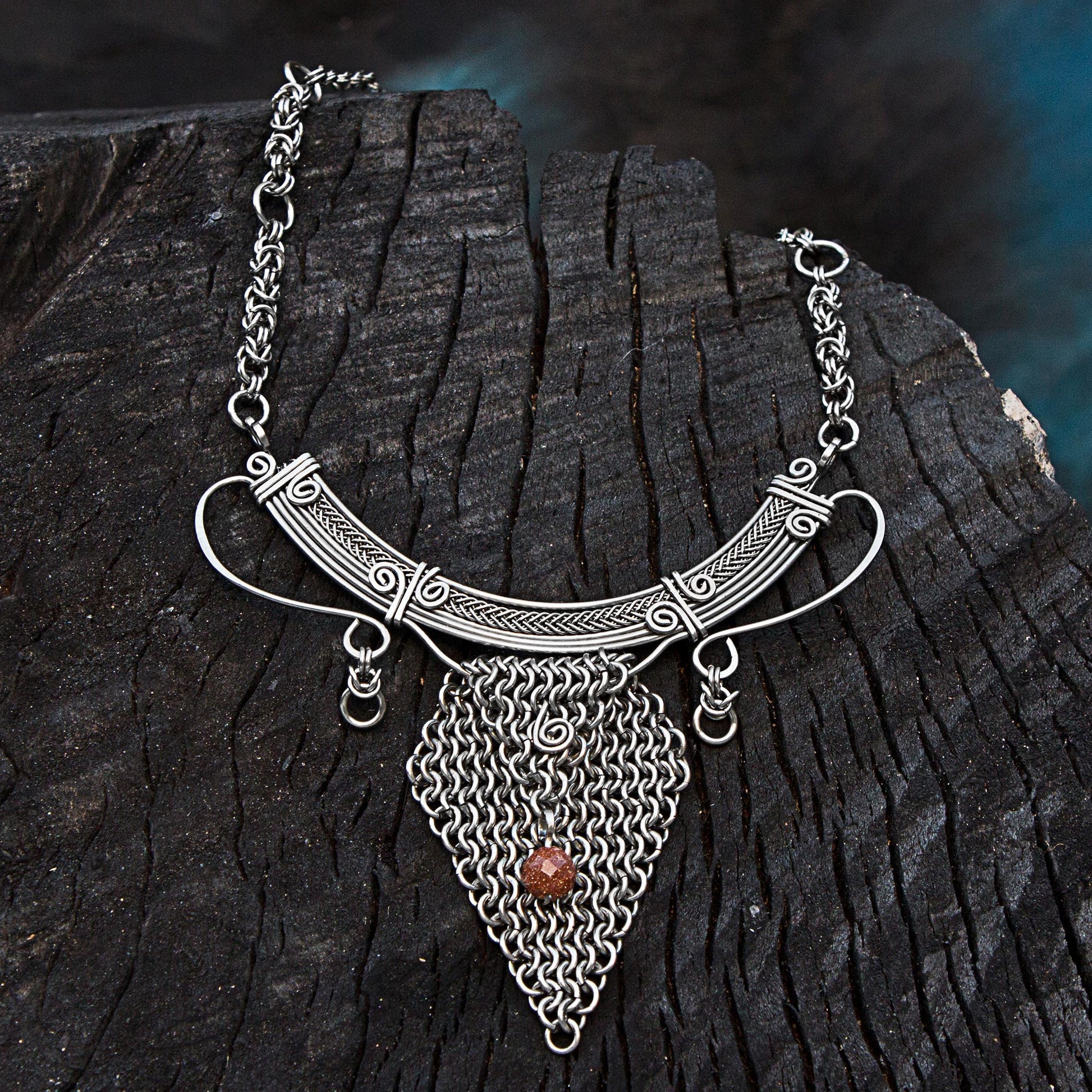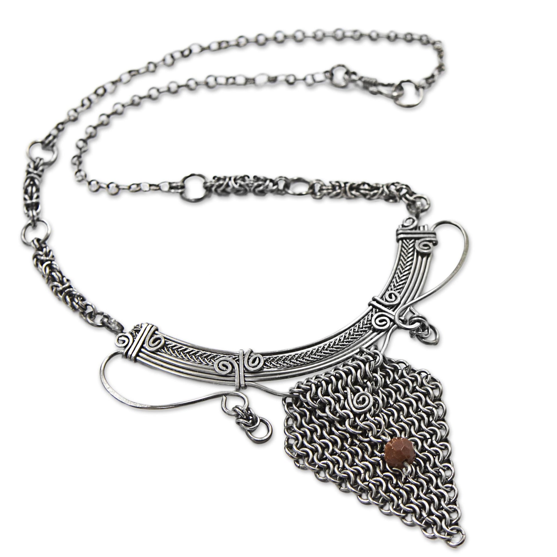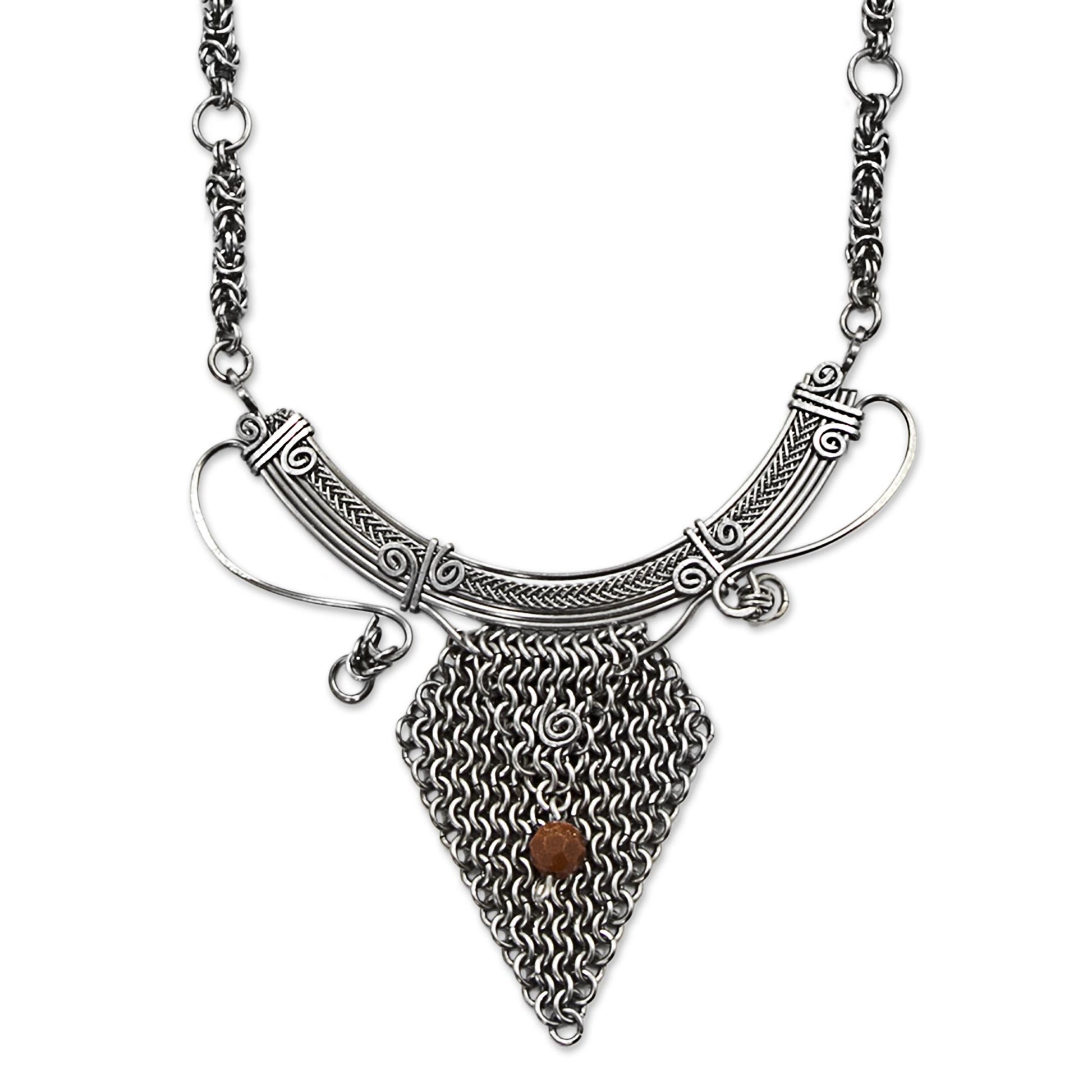 Ailton Oliver is an artisan from Brazil who has had an interest in crafting fine jewelry from infancy. He carries on his childhood love with this handcrafted statement necklace, featuring a large, intricate pendant of stainless steel with chain work. Intricate spiral motifs and a glistening goldstone bead distinguish the design. The chain is equally intricate, with complex Byzantine chain work for an impressive overall piece.