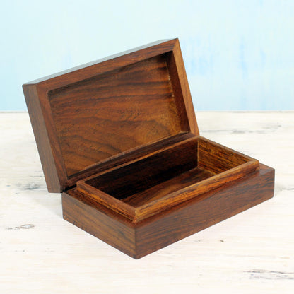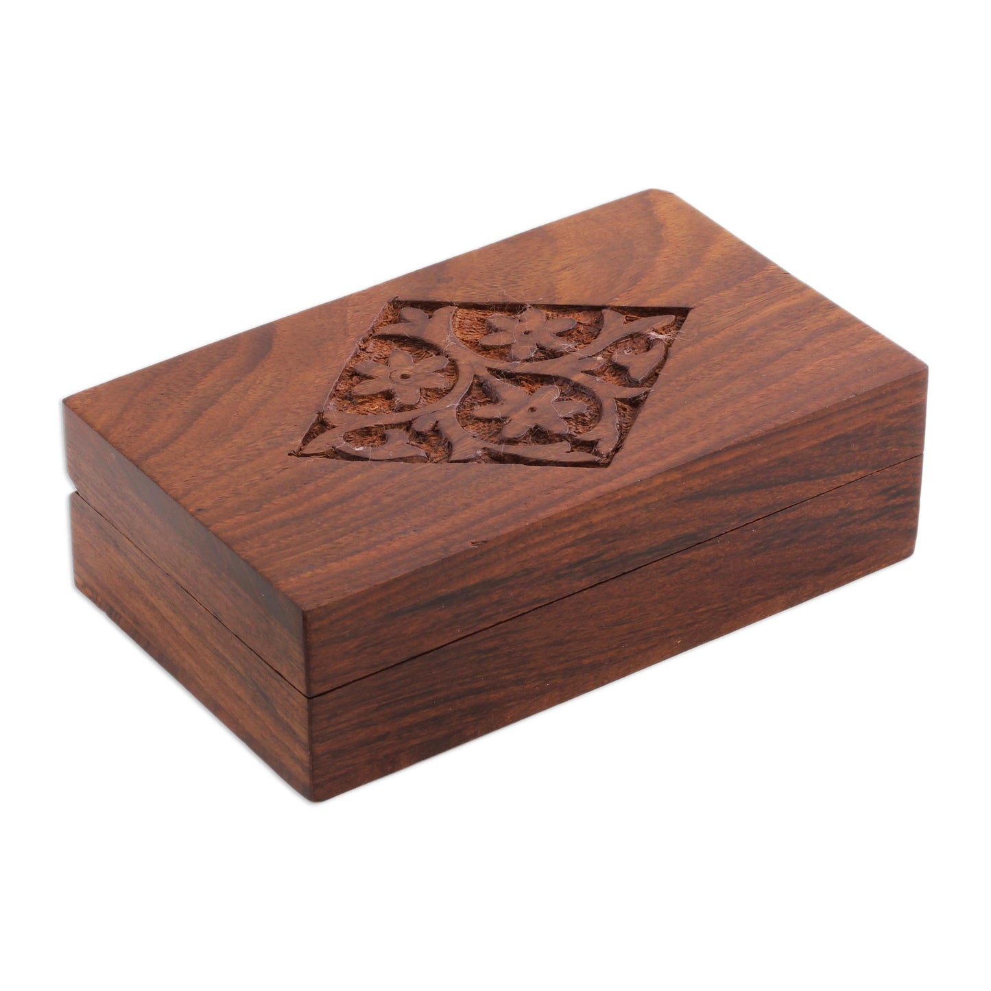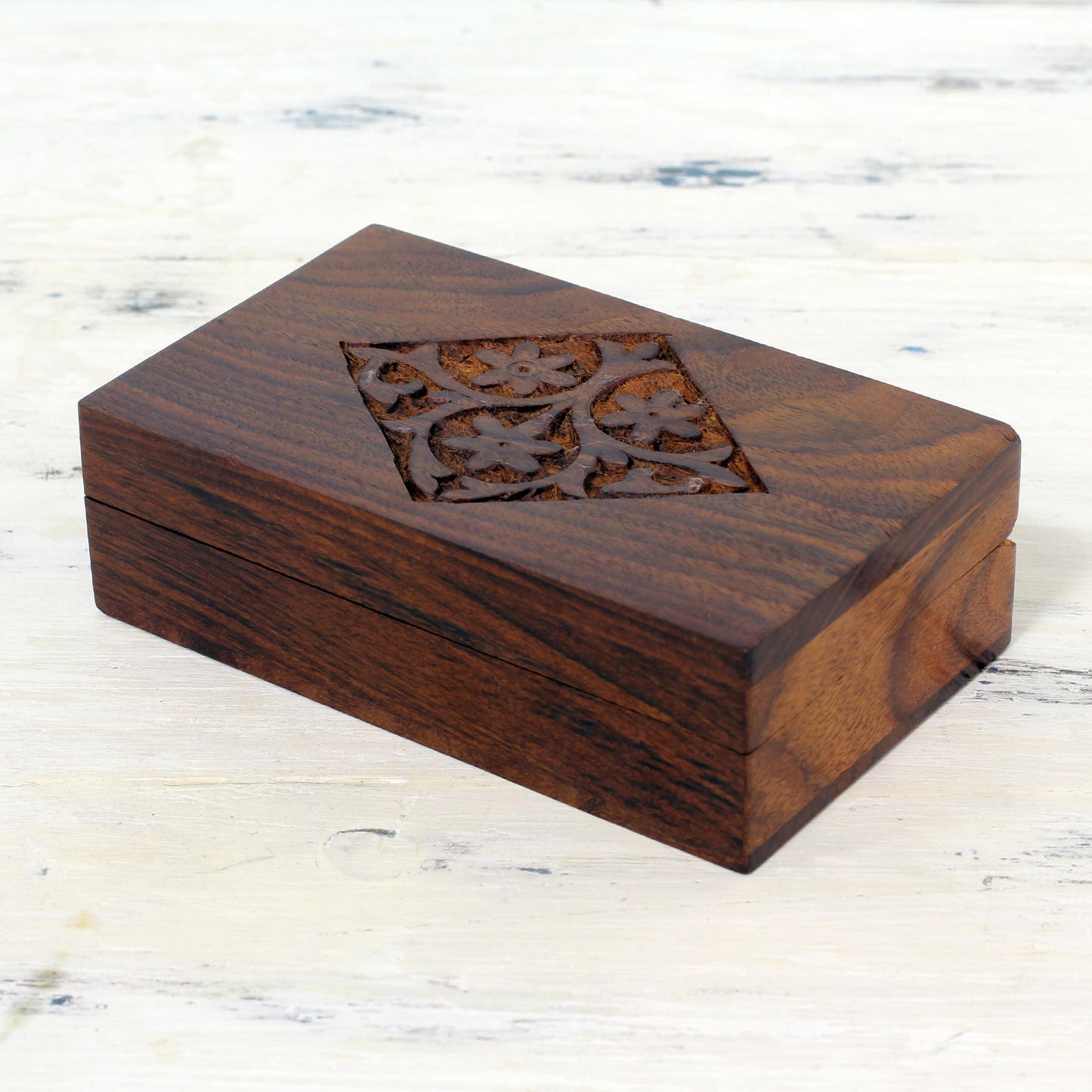 Flower and vine motifs carved within a diamond grace the lid of this beautiful decorative box. Handcrafted out of mango wood, the box is presented by artisan Arti Sharma of India.