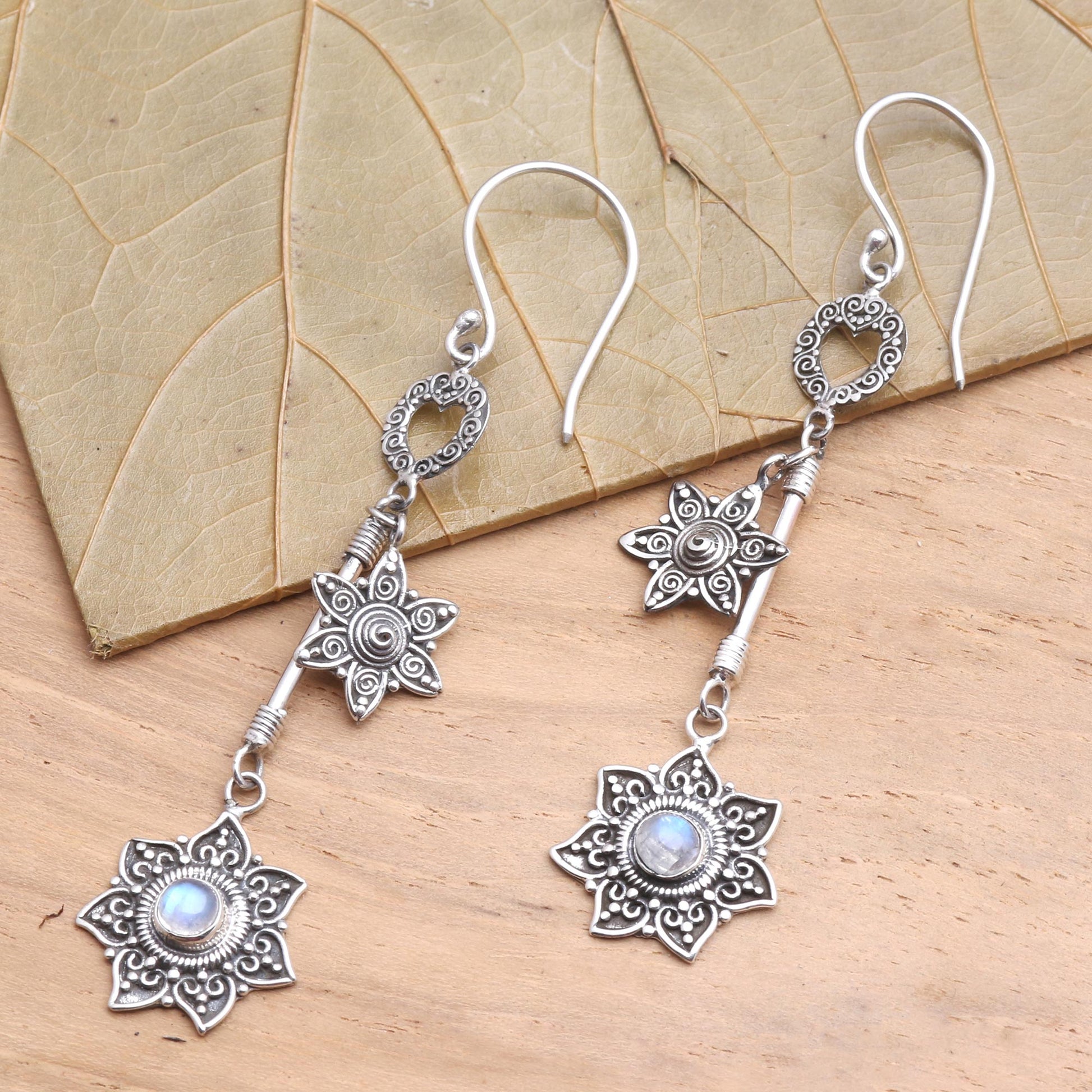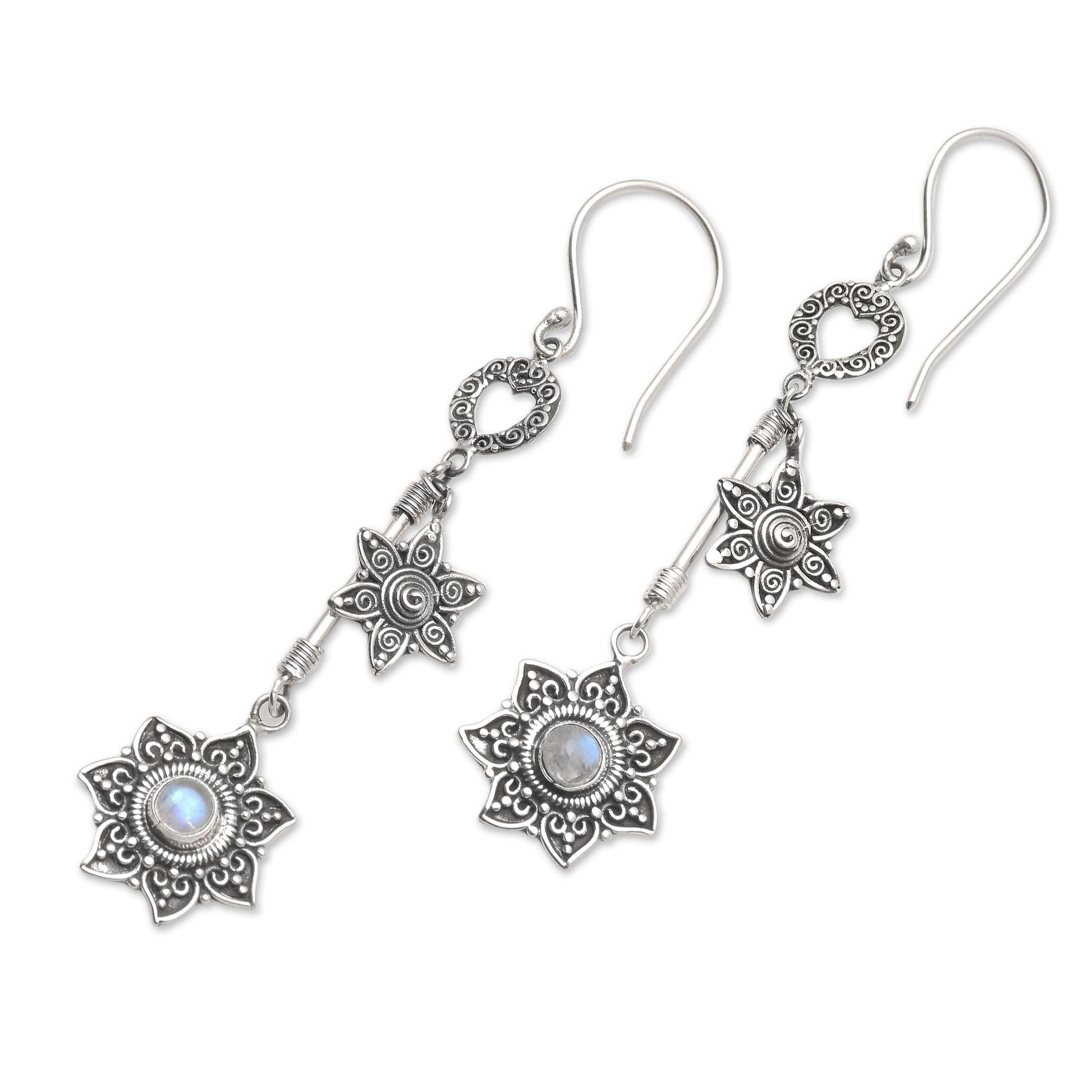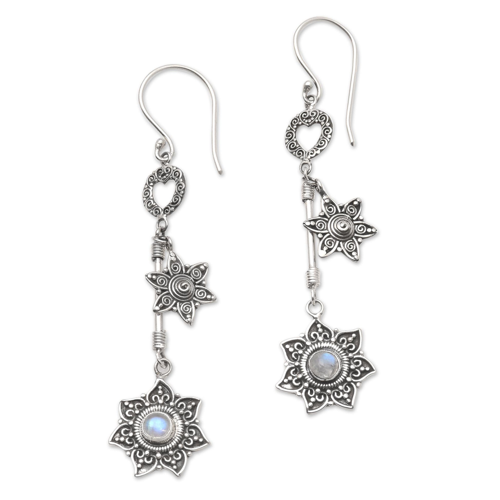 These lavishly detailed dangle earrings are the work of Eka Devi in Bali. Sterling silver flowers are embellished with traditional Balinese motifs called jawan (curled wire) and bun (silver granules). The larger flower cradles a cabochon of rainbow moonstone.