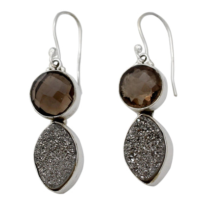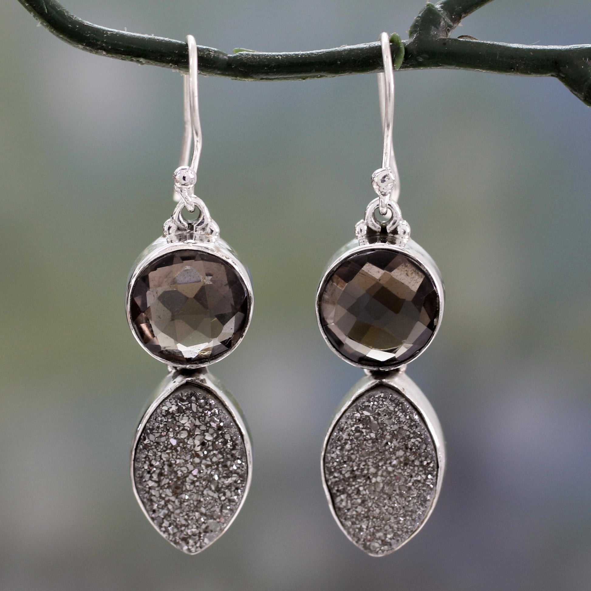 Dusky gemstones cast a spell of stormy elegance in these sterling silver dangle earrings from India's Aparna. The artisan sets checkerboard-faceted smoky quartz totaling three carats atop teardrop-shaped druzy quartz enhanced to a metallic sparkle. The earrings swing from silver hooks.