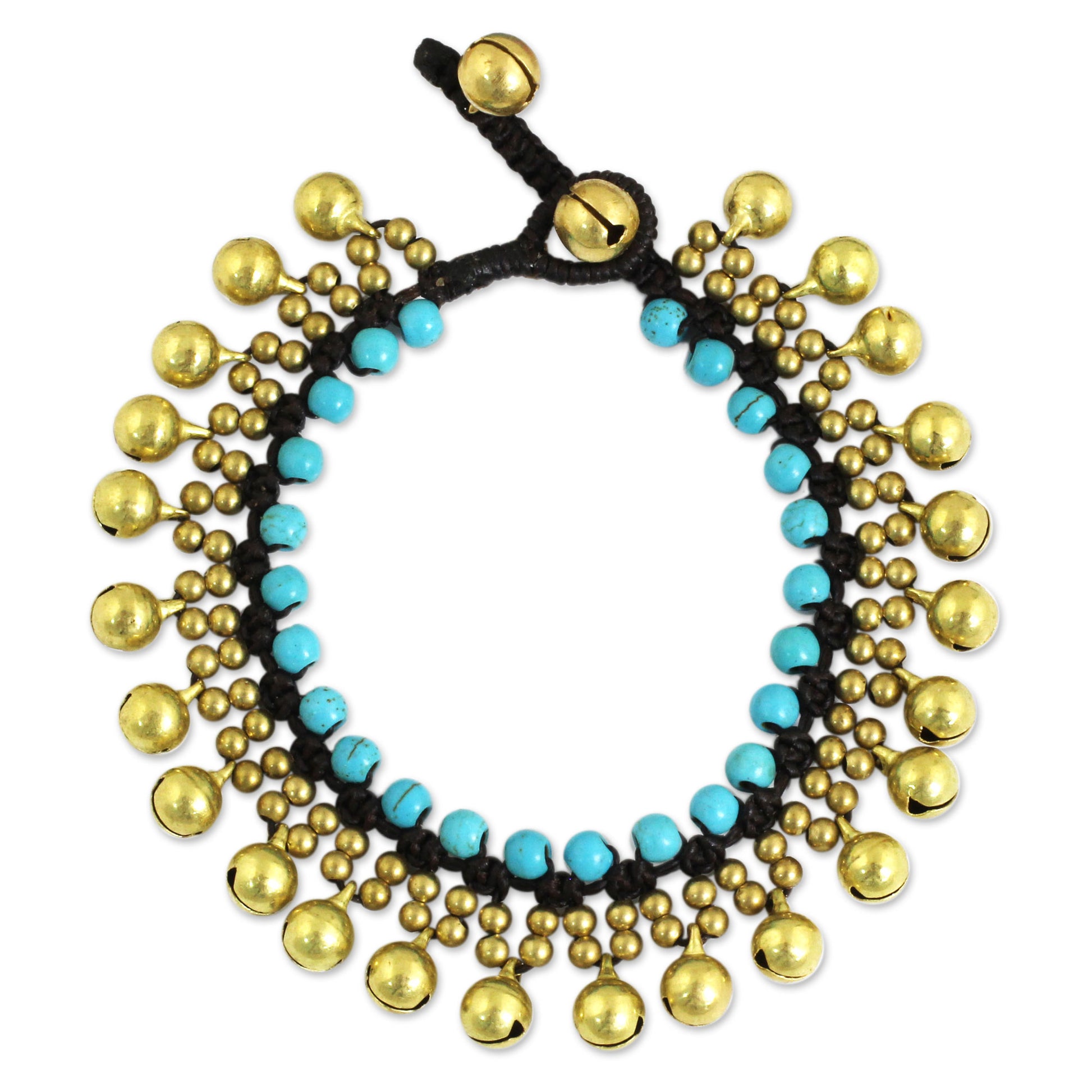 Joyful bells are ringing, heralding the arrival of summer. Tiraphan Hasub of Thailand presents this original bracelet design, featuring turquoise-hued dyed calcite on braided brown cords. Two rows of tiny brass beads lead to round brass bells that jingle cheerfully. The bracelet closes at one of two lengths with another brass bell.
