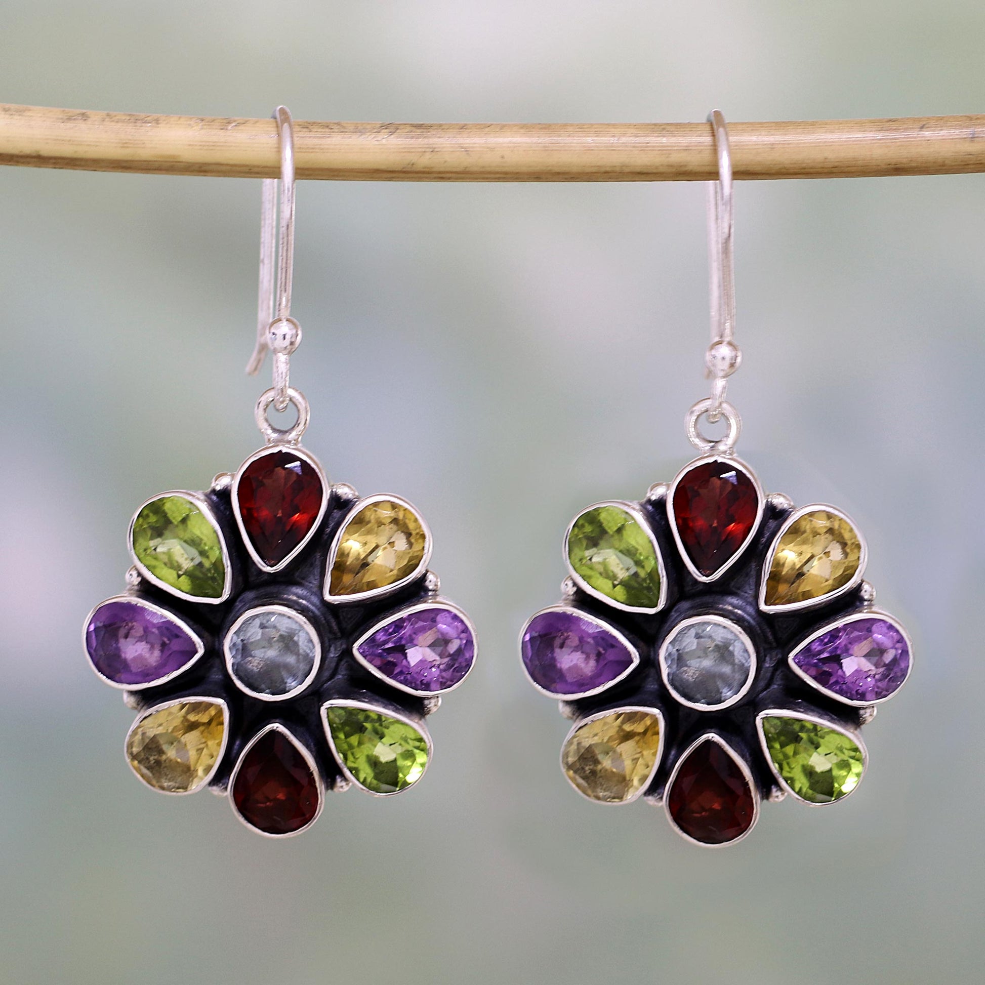 India's Neeru Goel presents these stunning earrings, a colorful variety of gemstones blooms on lavish sterling medallions. Formed of garnet and amethyst, citrine, and peridot, the petals are centered with blue topaz.