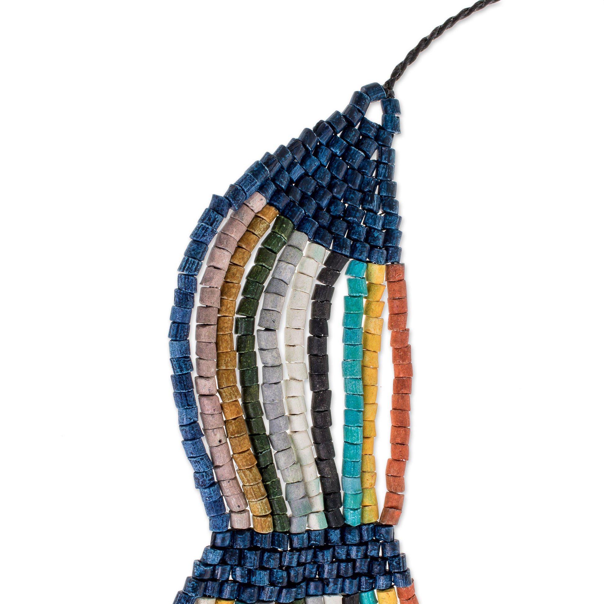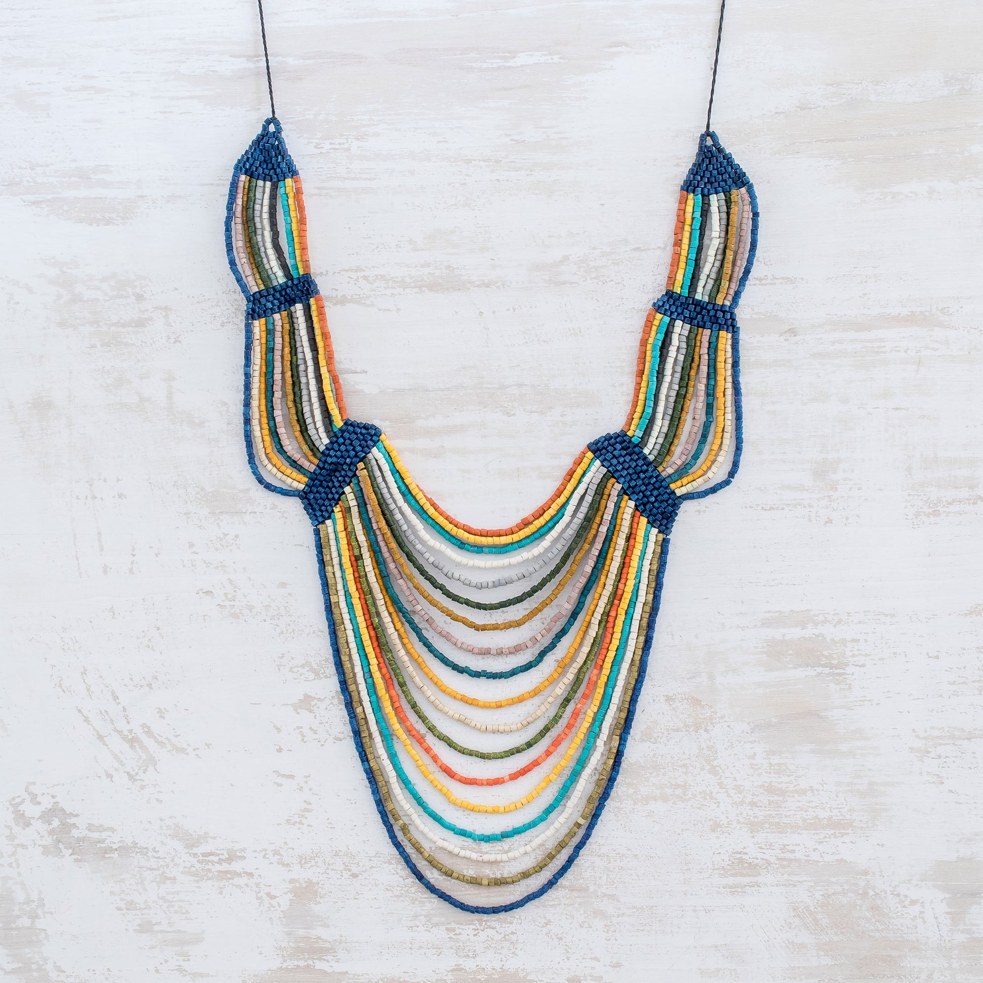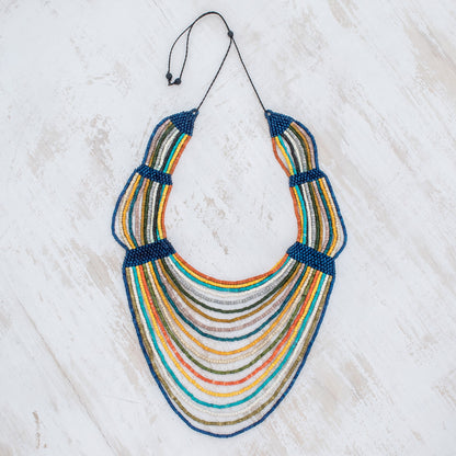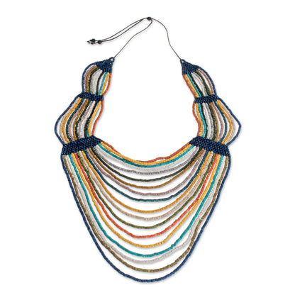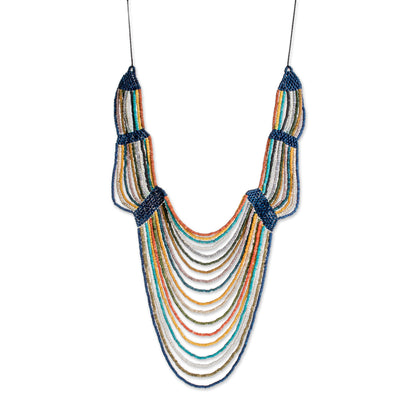 Evoking the breeze of a summer day, this necklace from Guatemala is designed and crafted by Jaime Hernando Vargas. He crafts the necklace by hand, beading several strands of multicolored ceramic. Along the necklace's adjustable length, blue segments connect the strands.