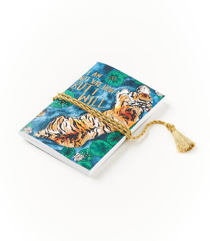 The cover features a metallic screen print of our original tiger watercolor illustration. The journal is finished with a gold metallic dori tie closure and tassel.